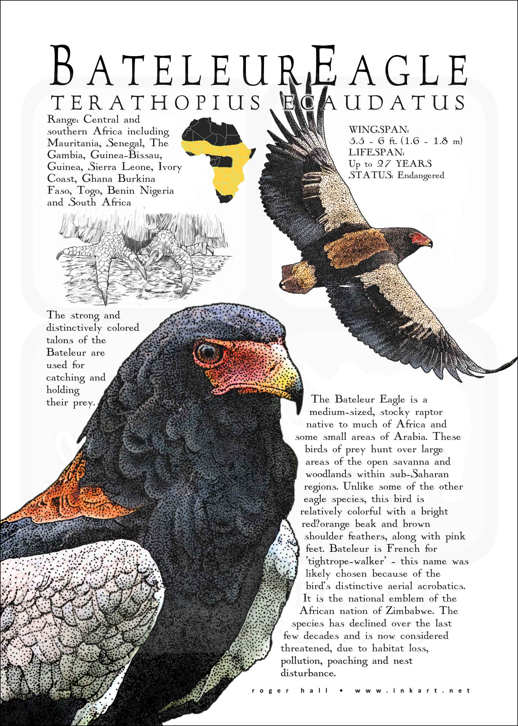 This poster features an informational graphic of the Bateleur Eagle (Terathopius ecaudatus) It includes a map of the bird’s range, along with three illustrations and a small paragraph with information about animal.