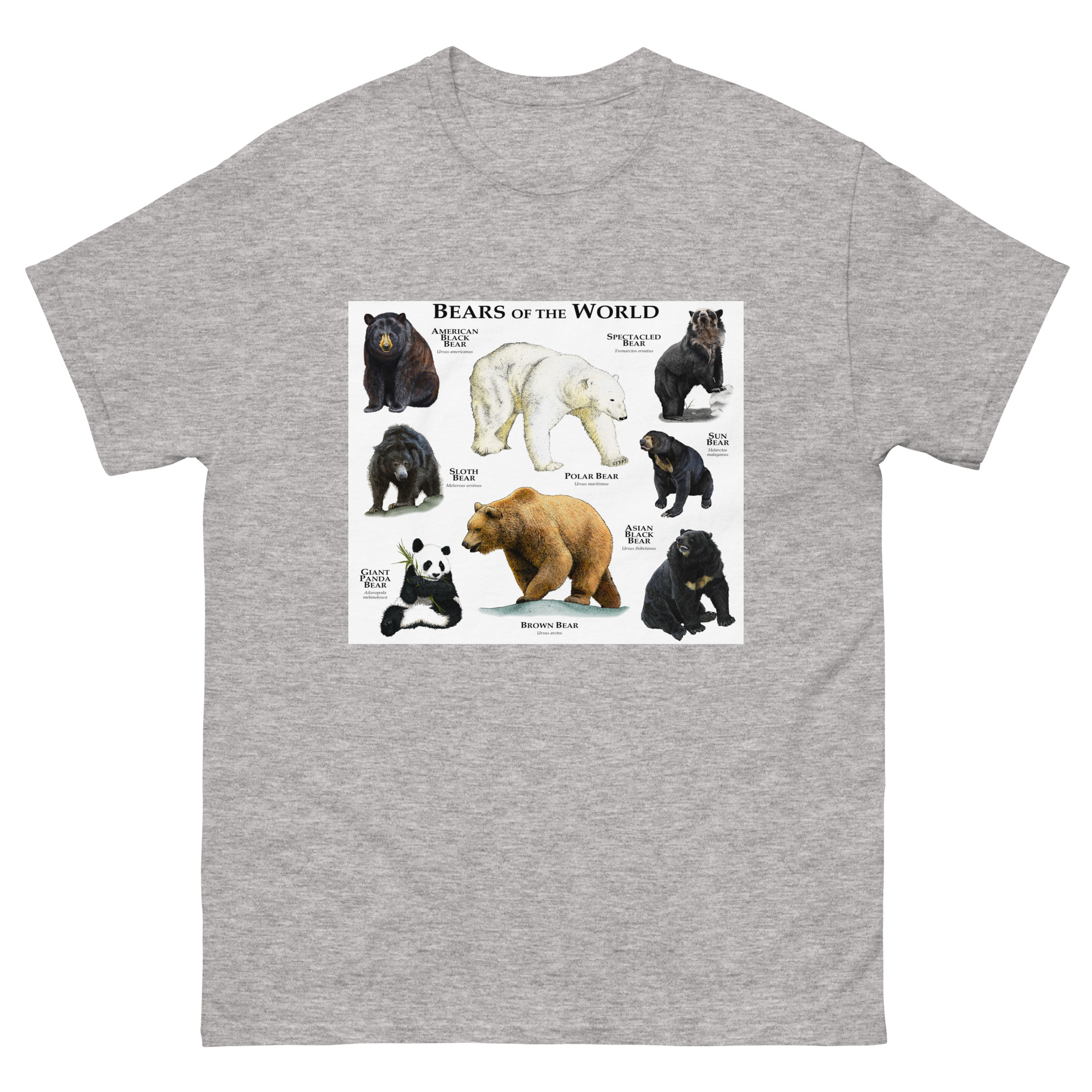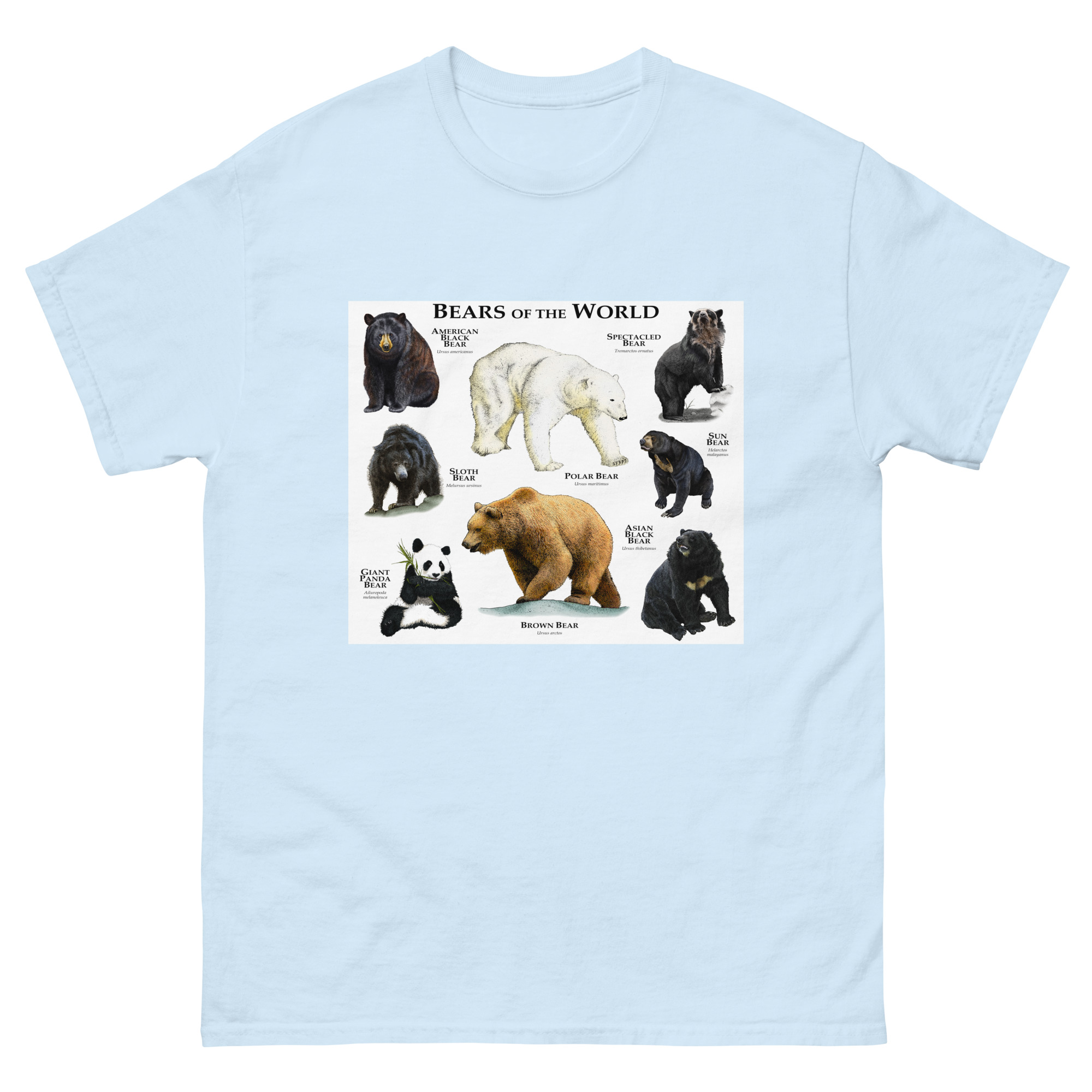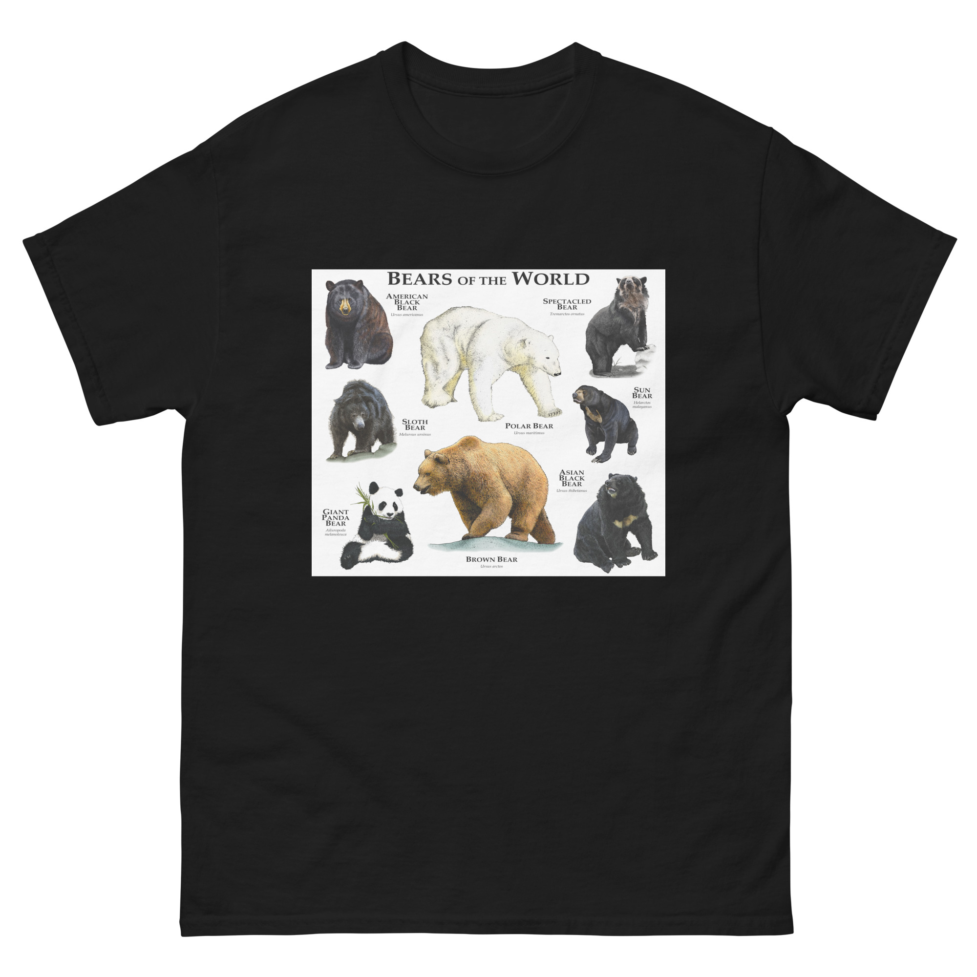 There are eight species of bears in existence today. They are found many different environments on every continent (except Antarctica.) The image features a fine art illustration of all species of bears printed on a high-quality t-shirt.
