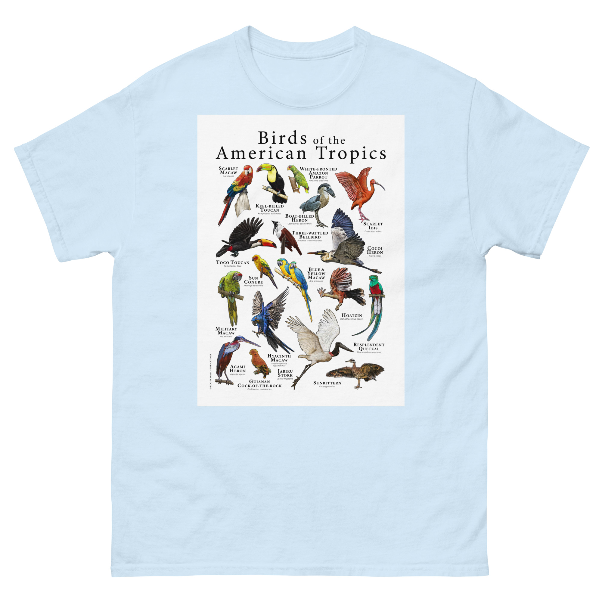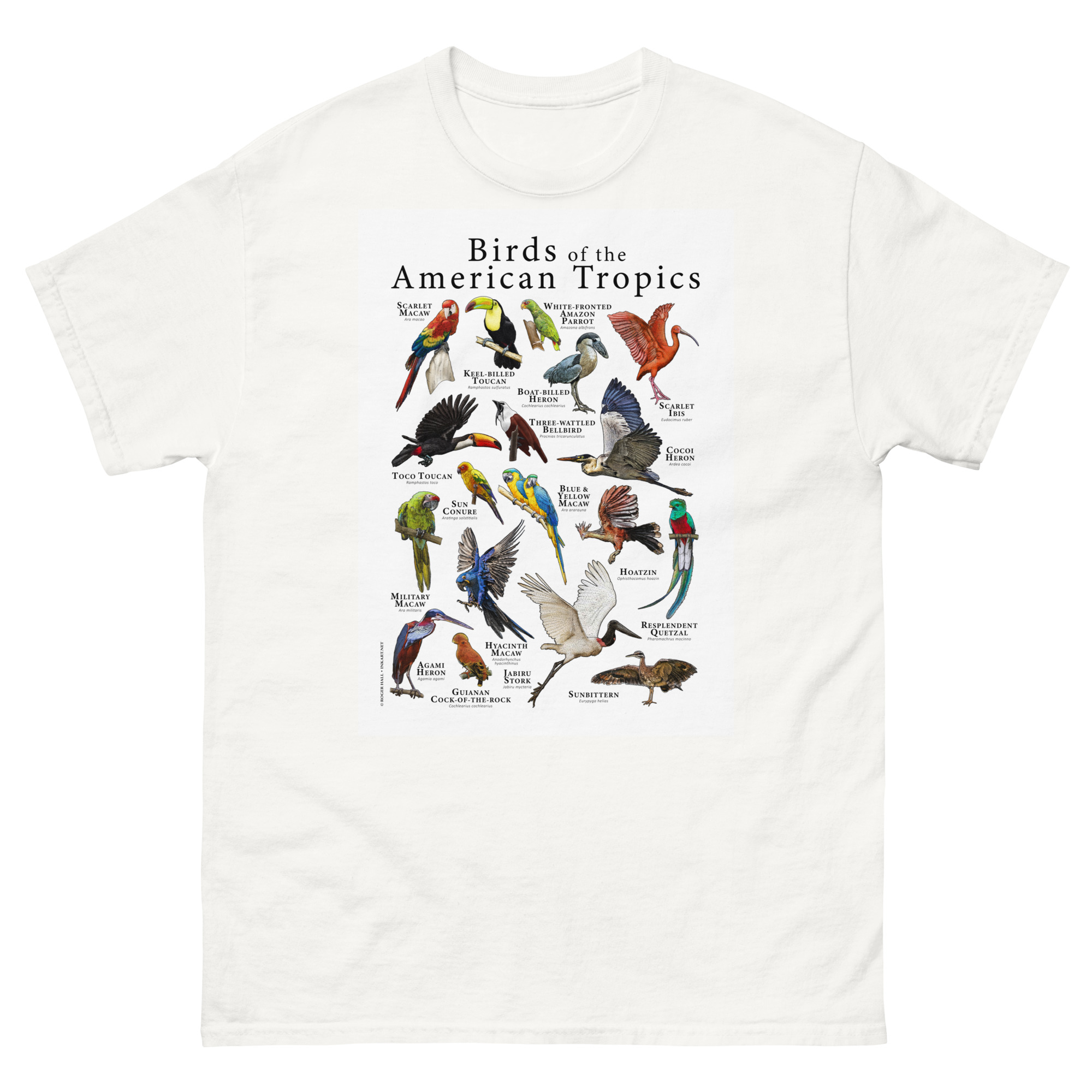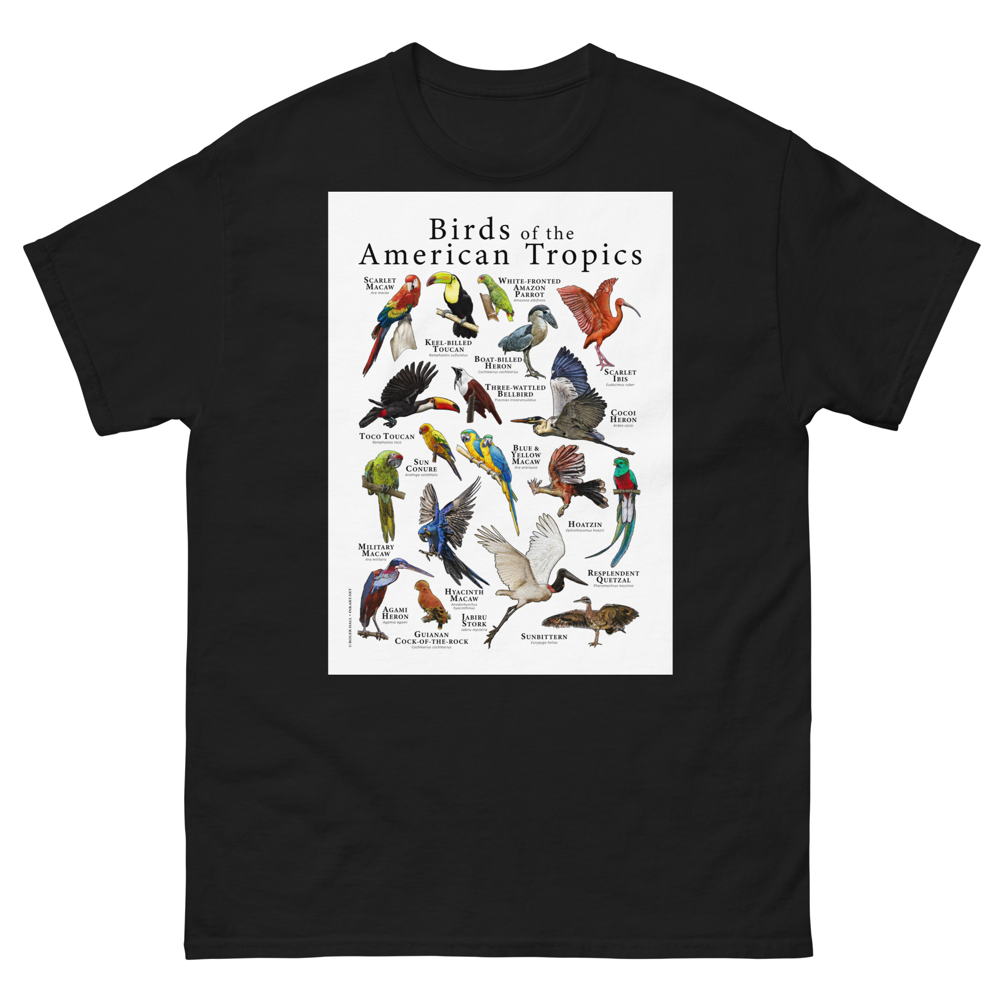 A colorful collage of scientifically accurate illustration of various species of tropical birds of the Americas. The layout features seventeen different types of these wonderful birds which are native to the rainforests of Central and South America. The image is printed on a high-quality 100% men’s cotton t-shirt.