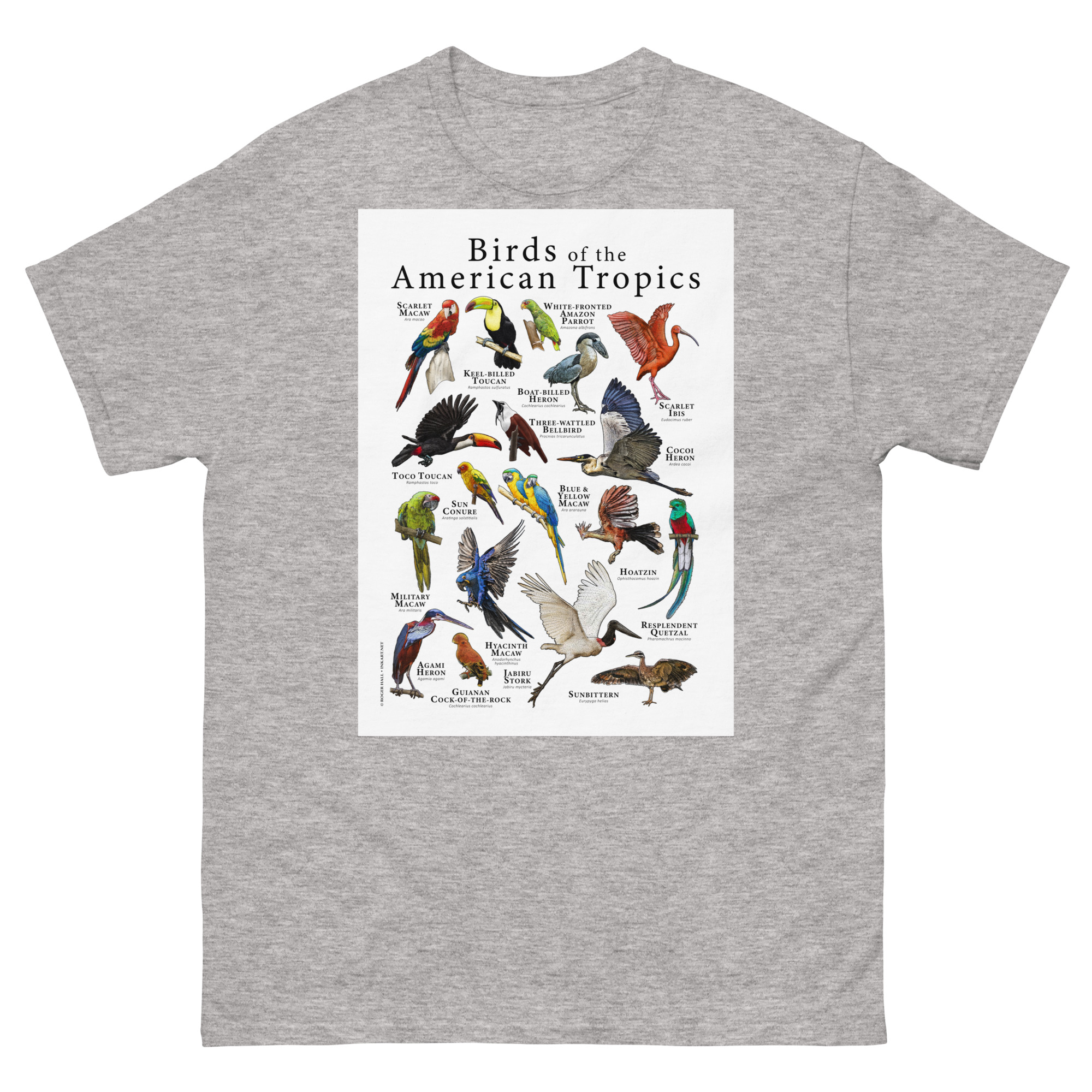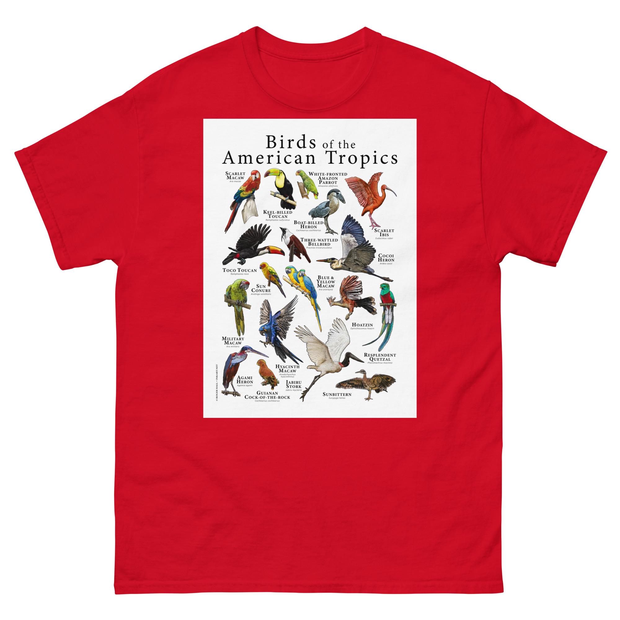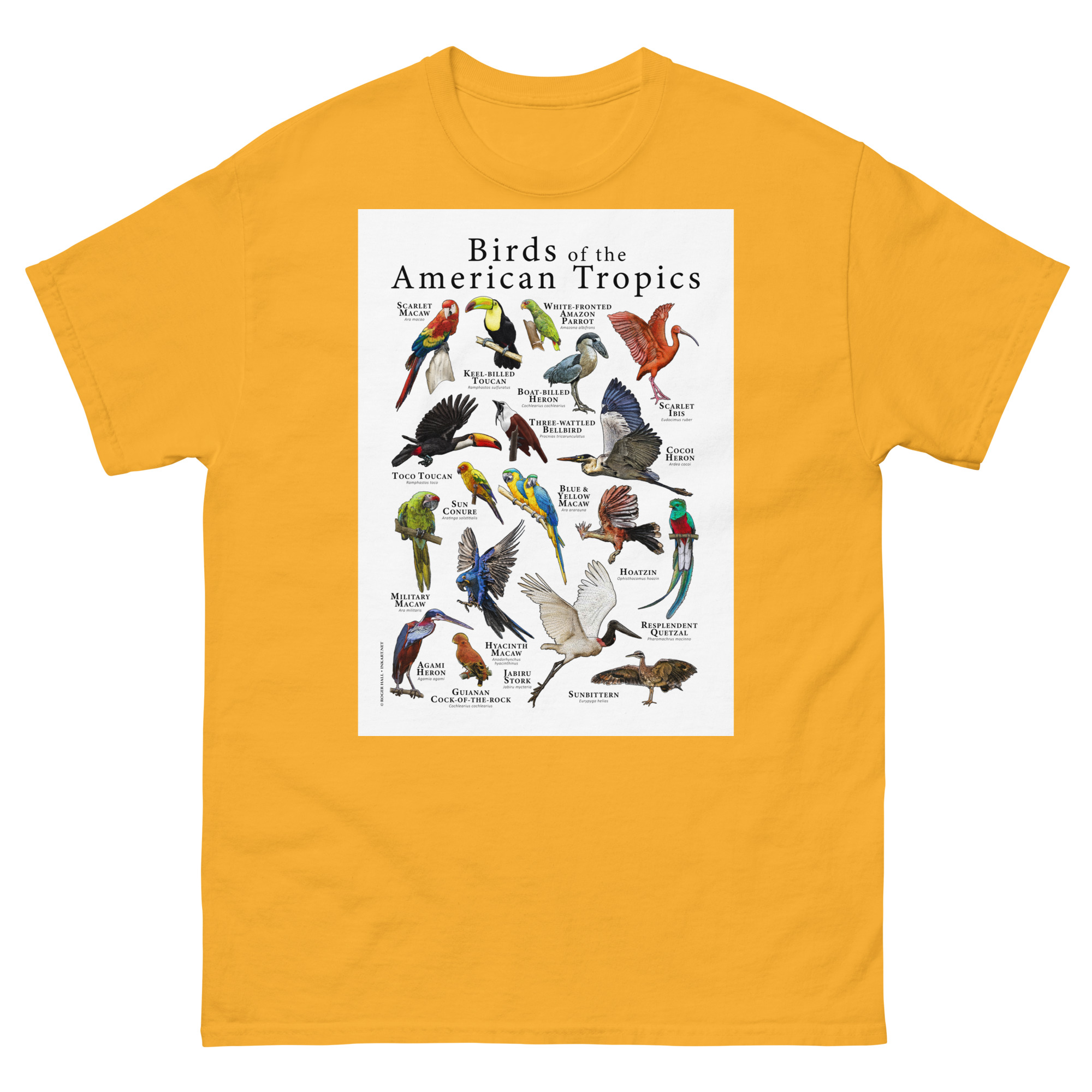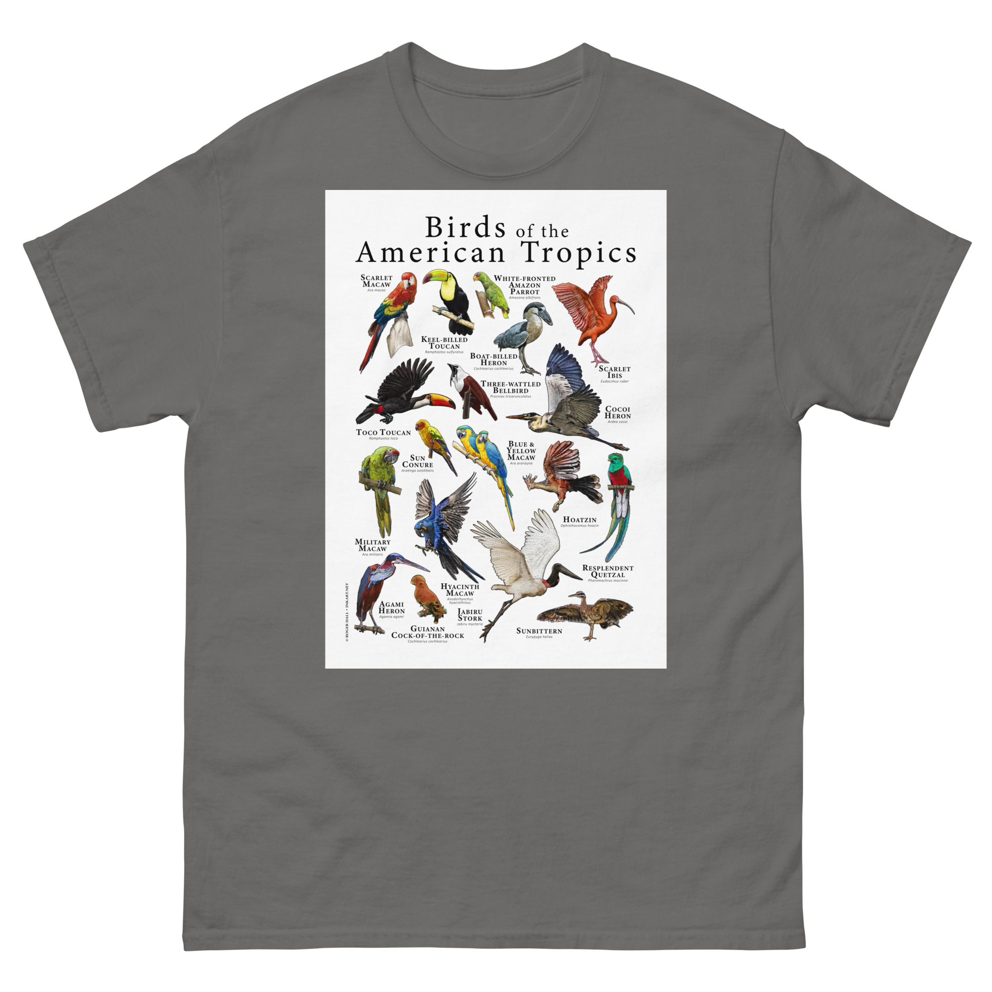 A colorful collage of scientifically accurate illustration of various species of tropical birds of the Americas. The layout features seventeen different types of these wonderful birds which are native to the rainforests of Central and South America. The image is printed on a high-quality 100% men’s cotton t-shirt.
