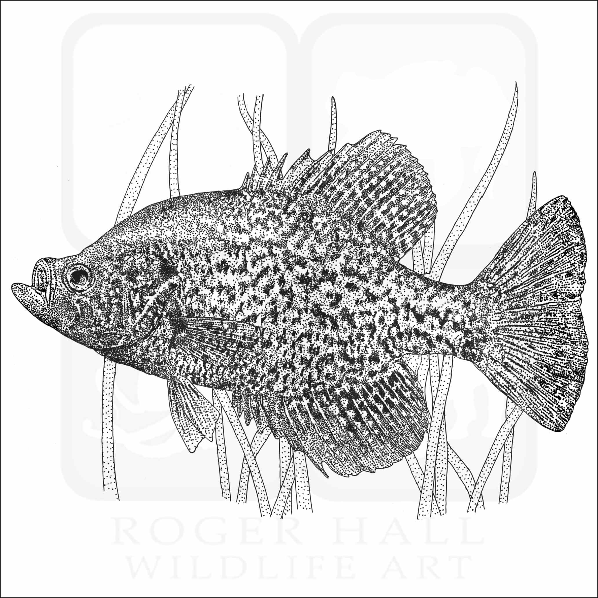 Tags: animal, Black Crappie, clip art, drawing, fine art print, fish, illustration, insect, line art drawing, mammal, north america, pen and ink, Pomoxis nigromaculatus, scientific illustration, wildlife art