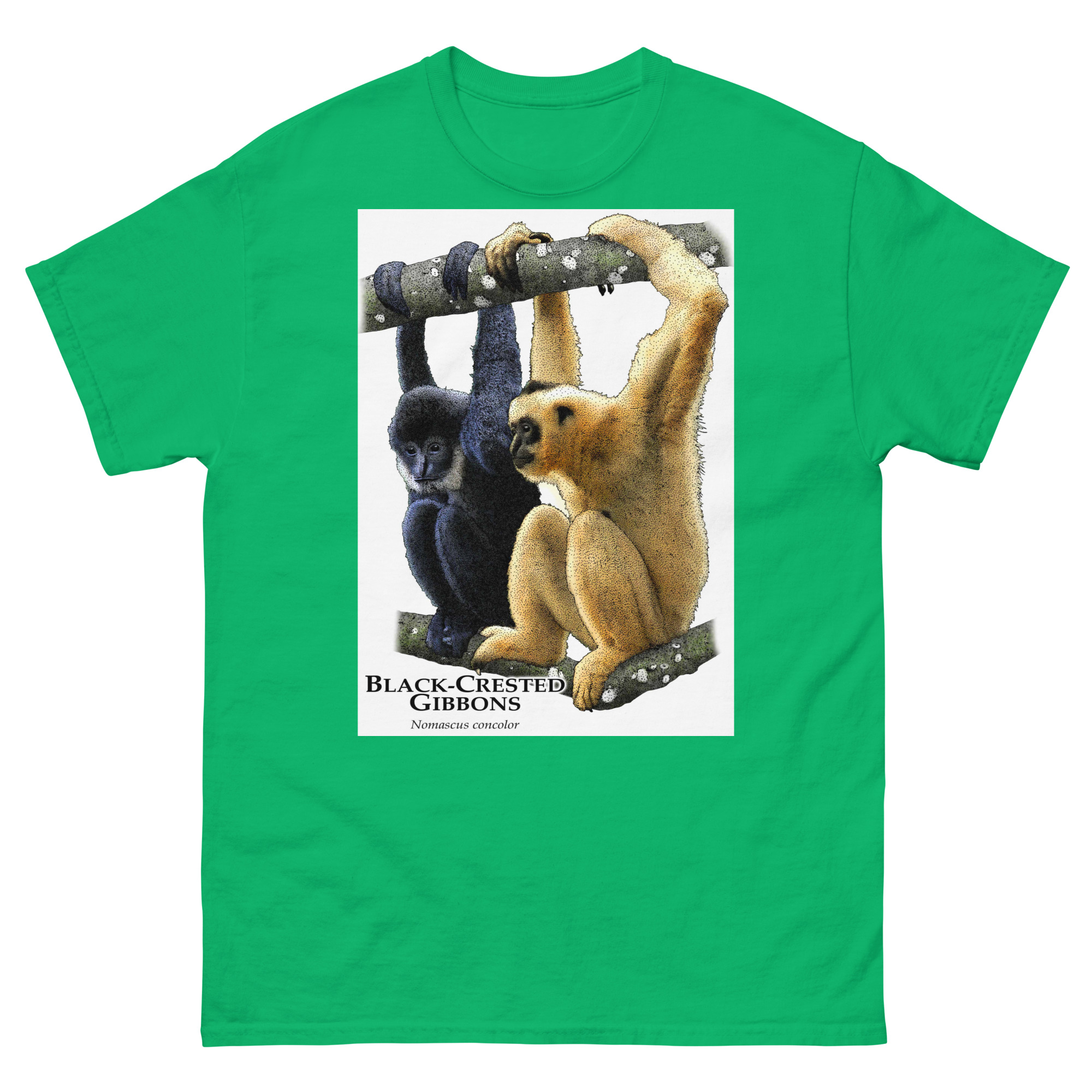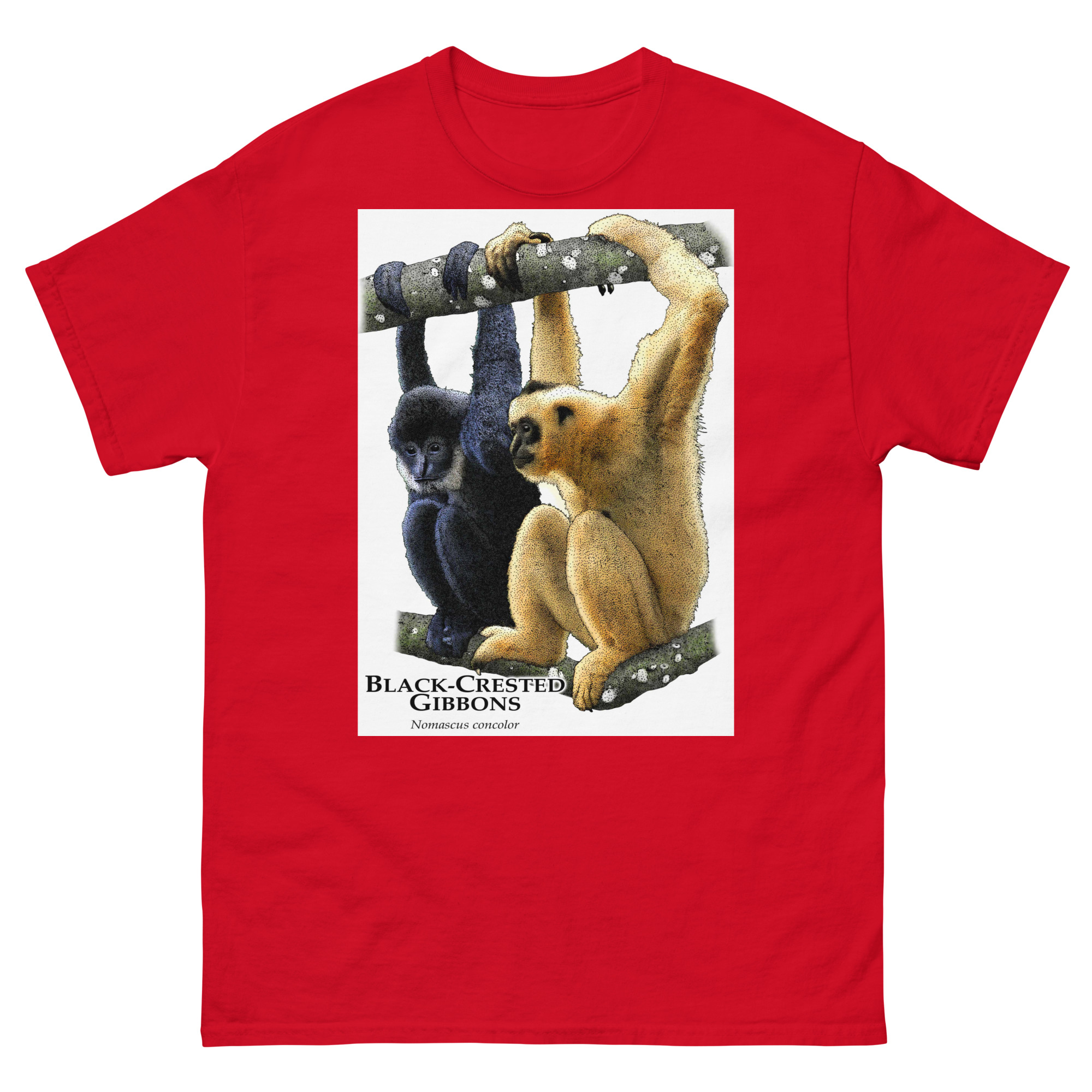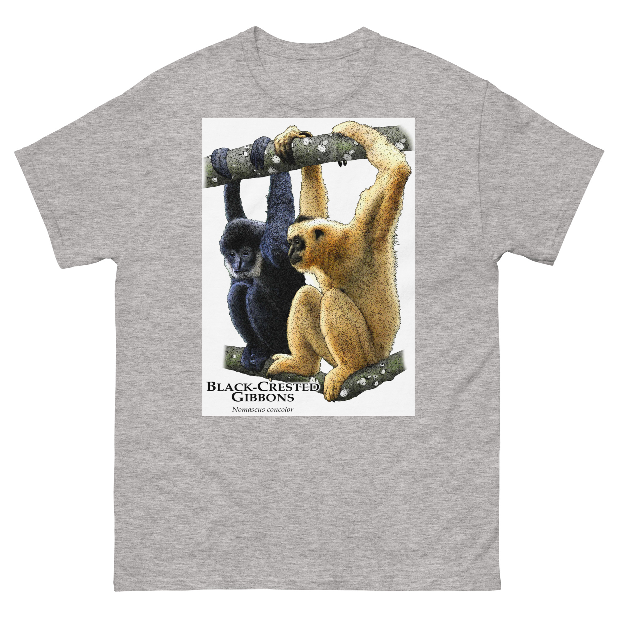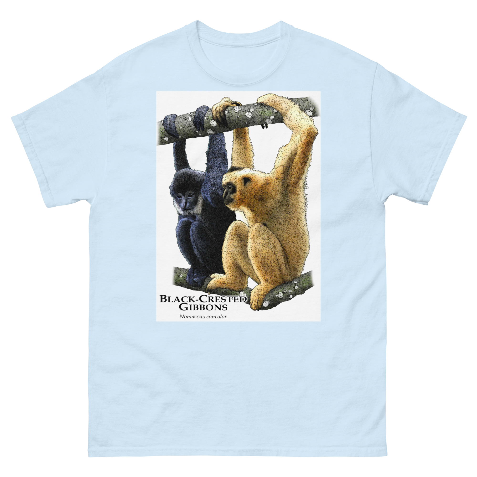 Fine art illustration of a Black-Crested Gibbons (Nomascus concolor) printed on a high-quality 100% unisex cotton t-shirt.