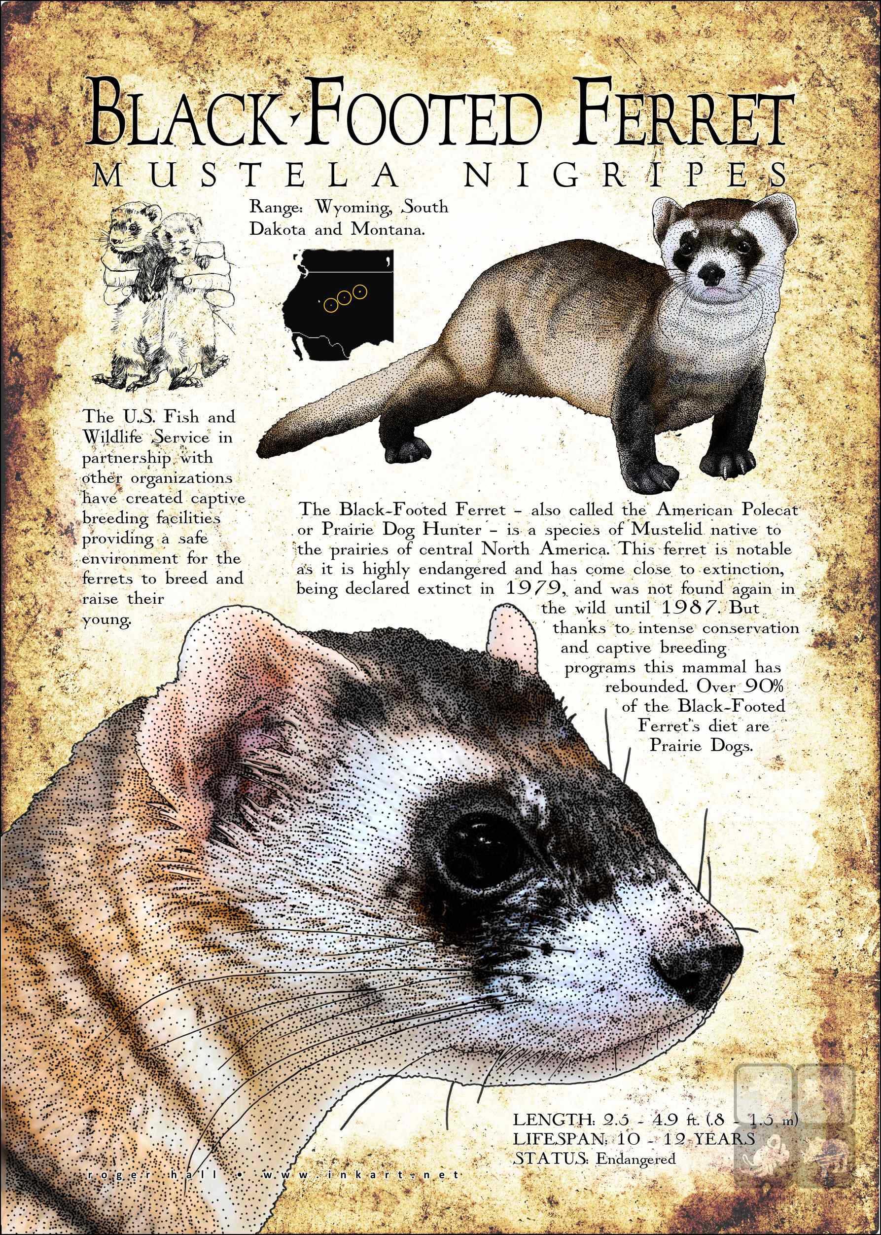 This poster features an informational graphic of the Black-Footed Ferret (Mustela nigripes). It includes a map of the its range, along with three illustrations and a small paragraph with information about this species of endangered mammal.
