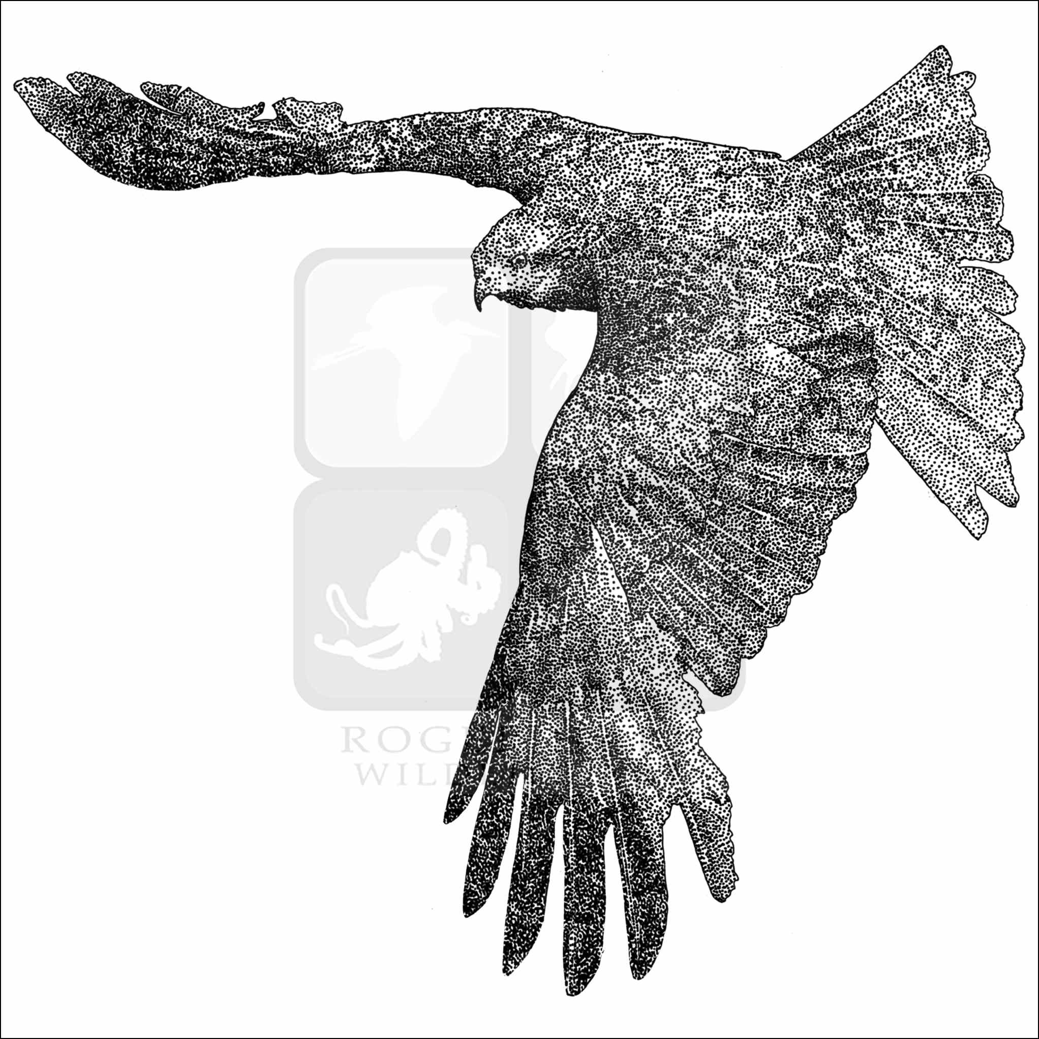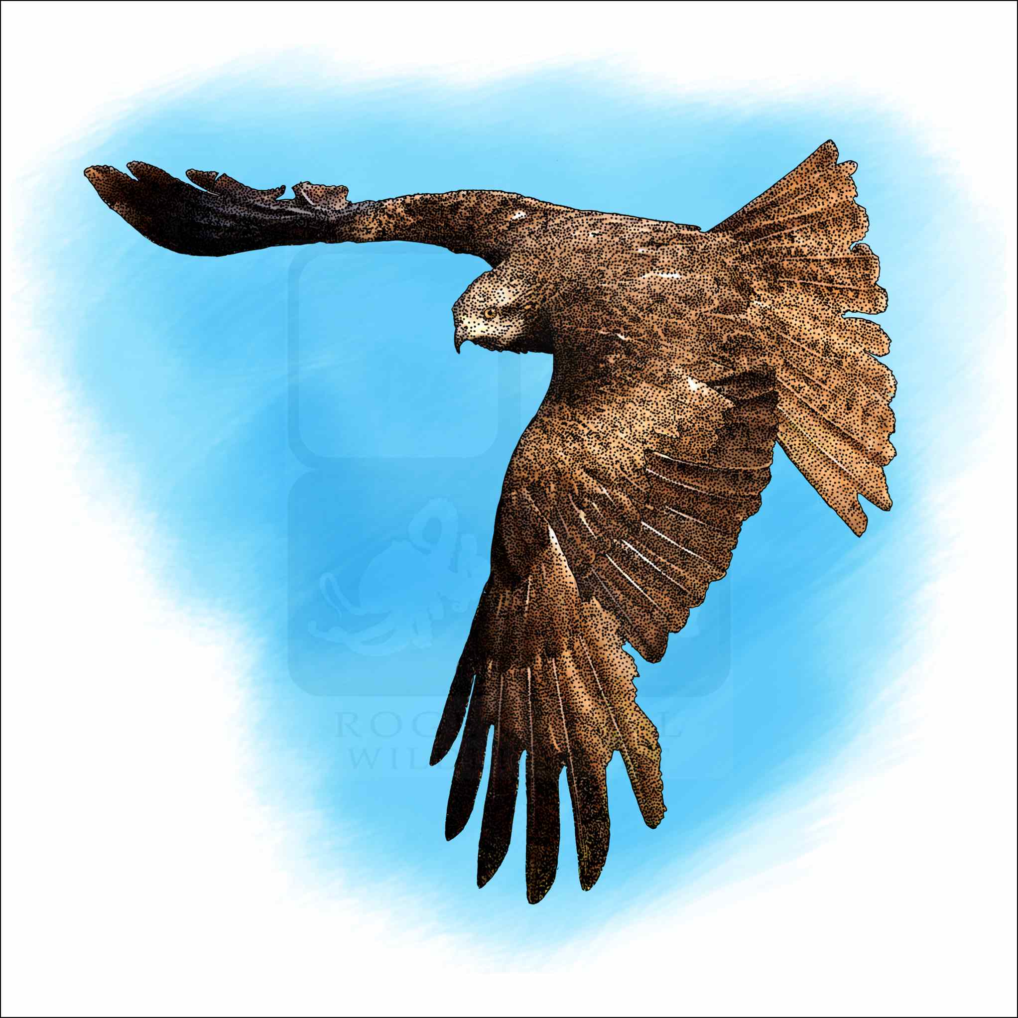 Fine art illustration of a Black Kite (Milvus migrans.) The illustration is available in black and white or color.