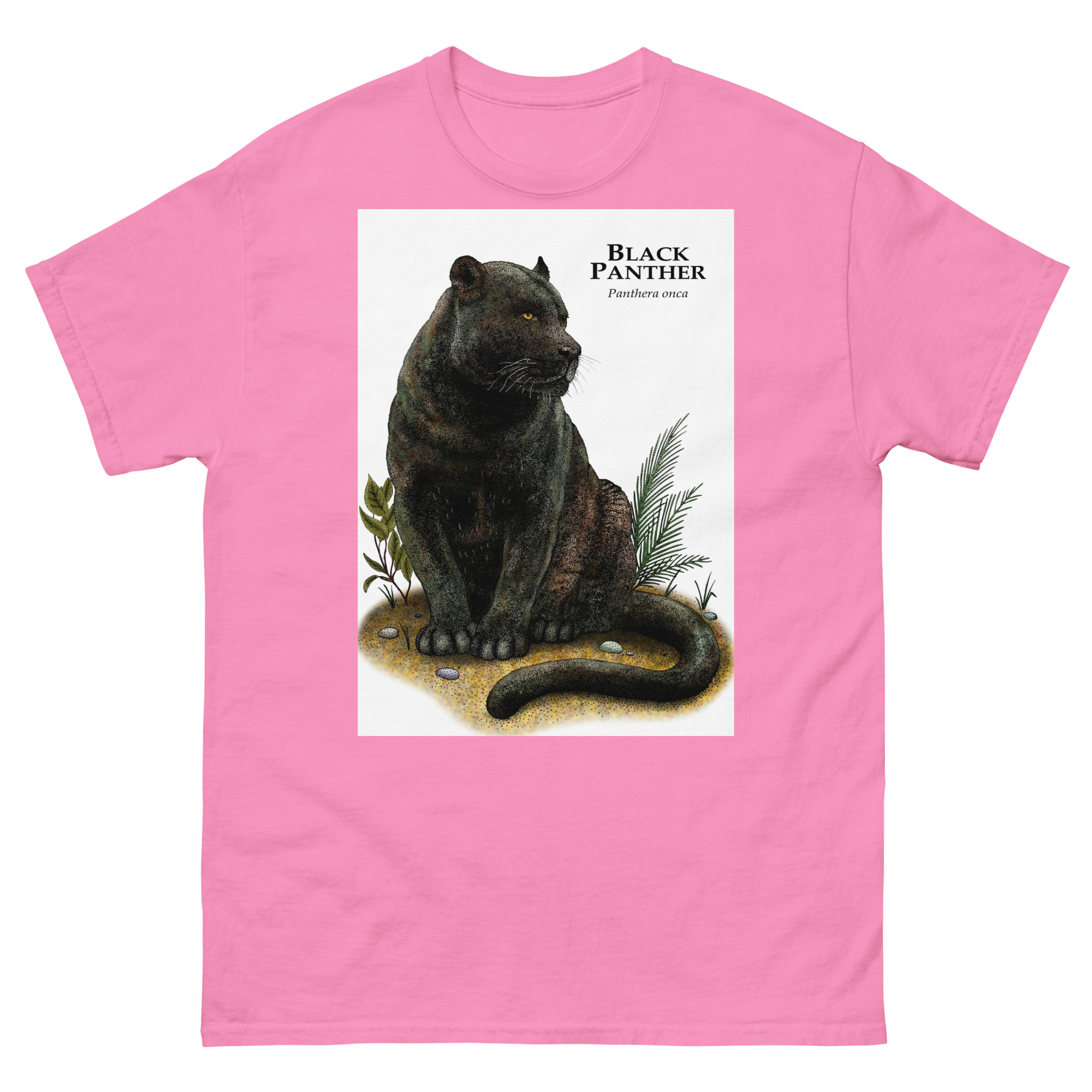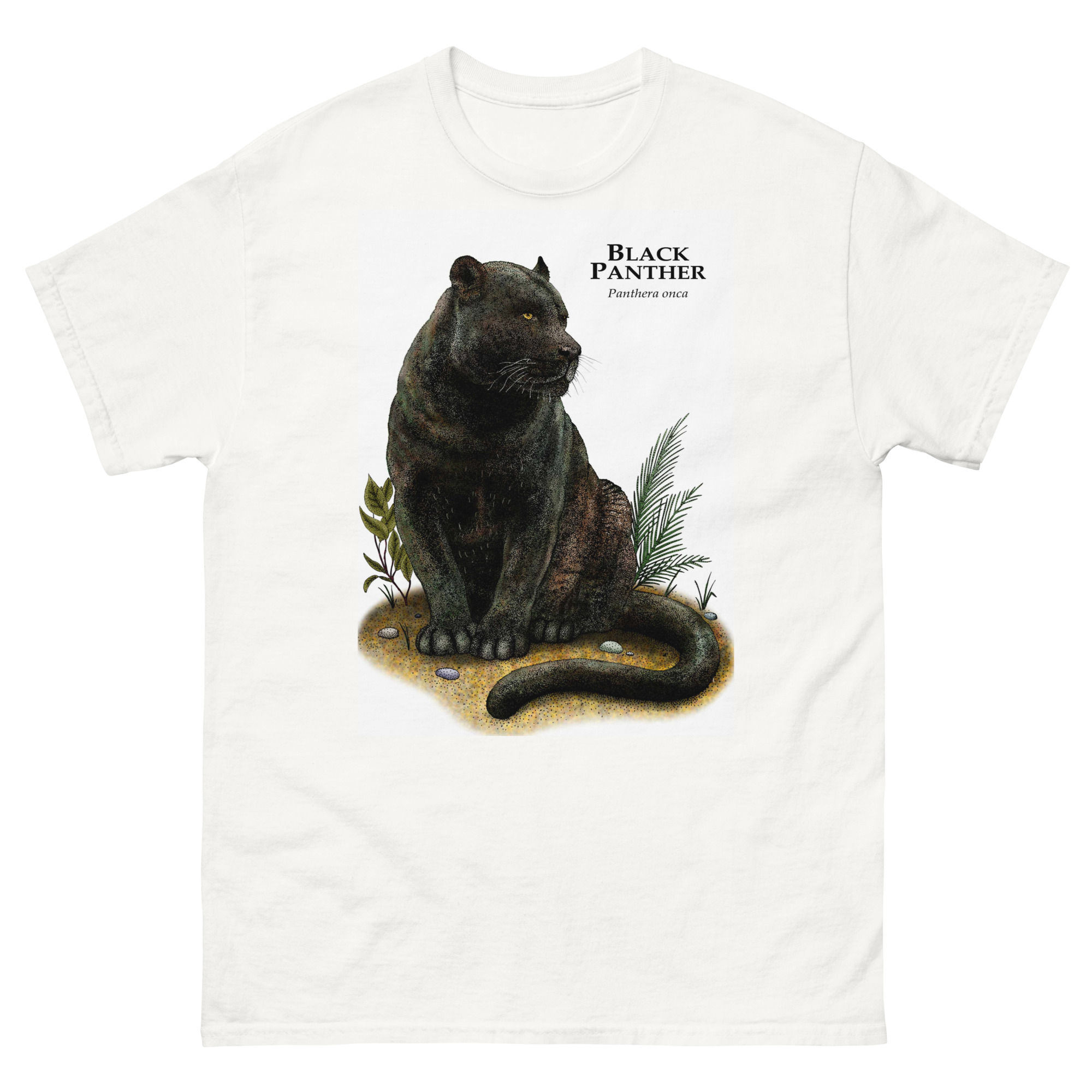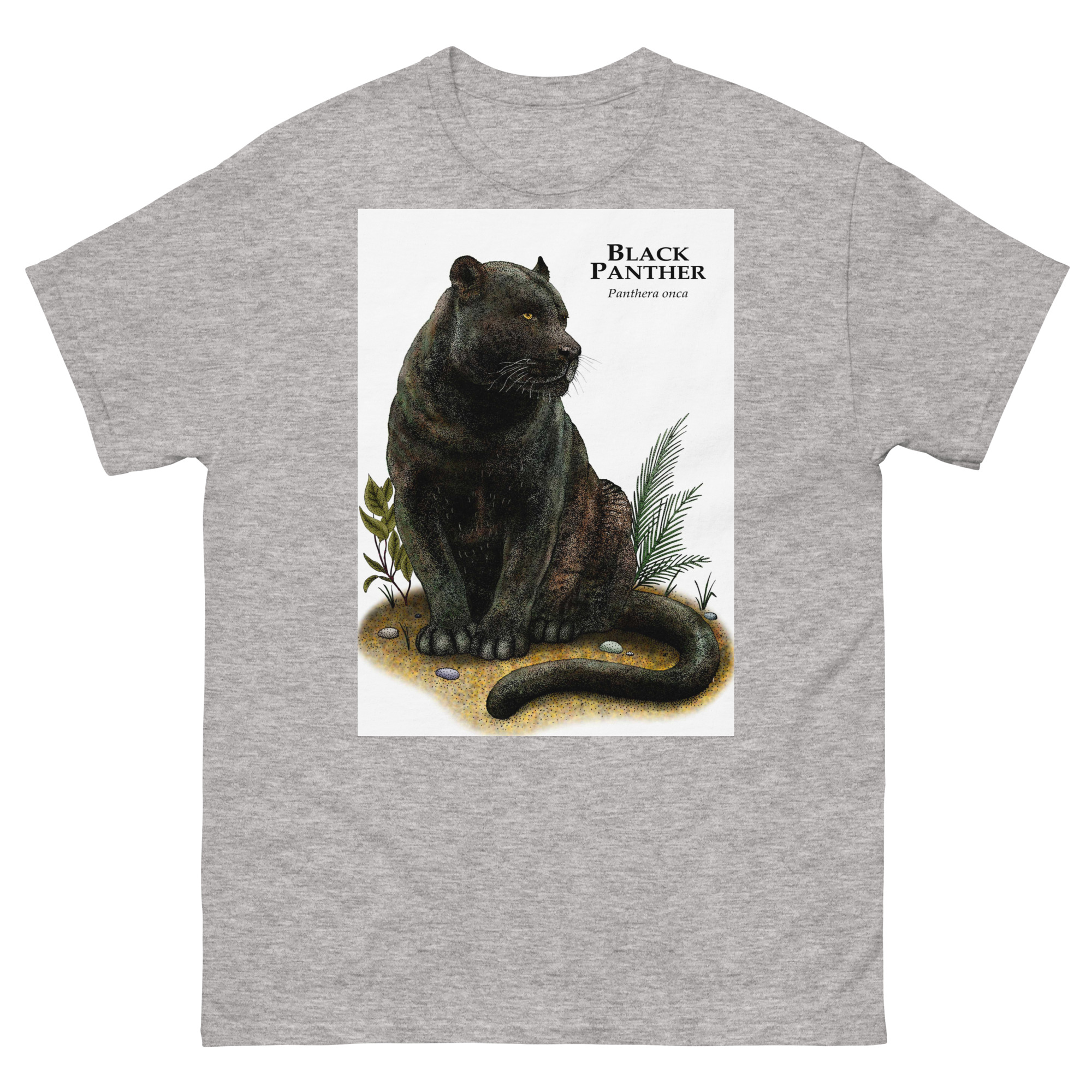 Fine art illustration of a Black Panther or Jaguar (Panthera onca) printed on a high-quality 100% unisex cotton t-shirt.