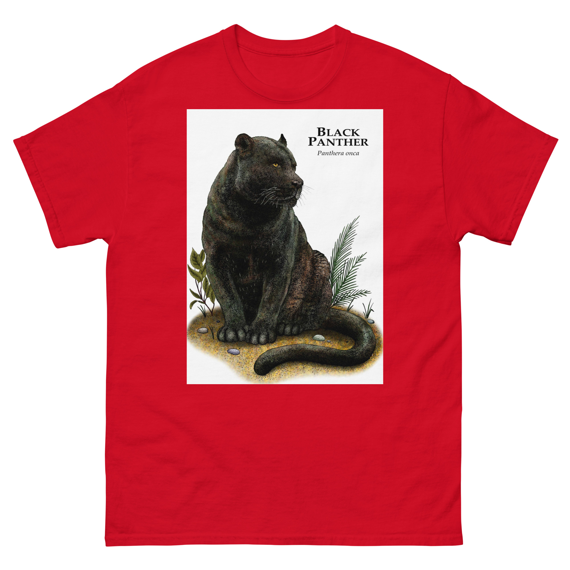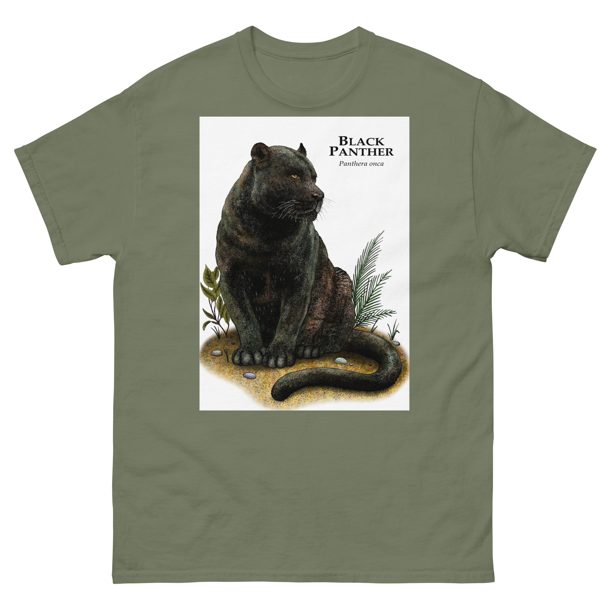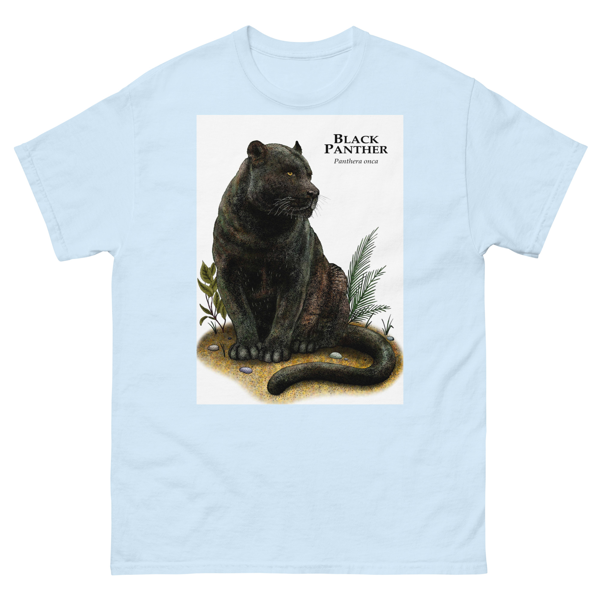 Fine art illustration of a Black Panther or Jaguar (Panthera onca) printed on a high-quality 100% unisex cotton t-shirt.