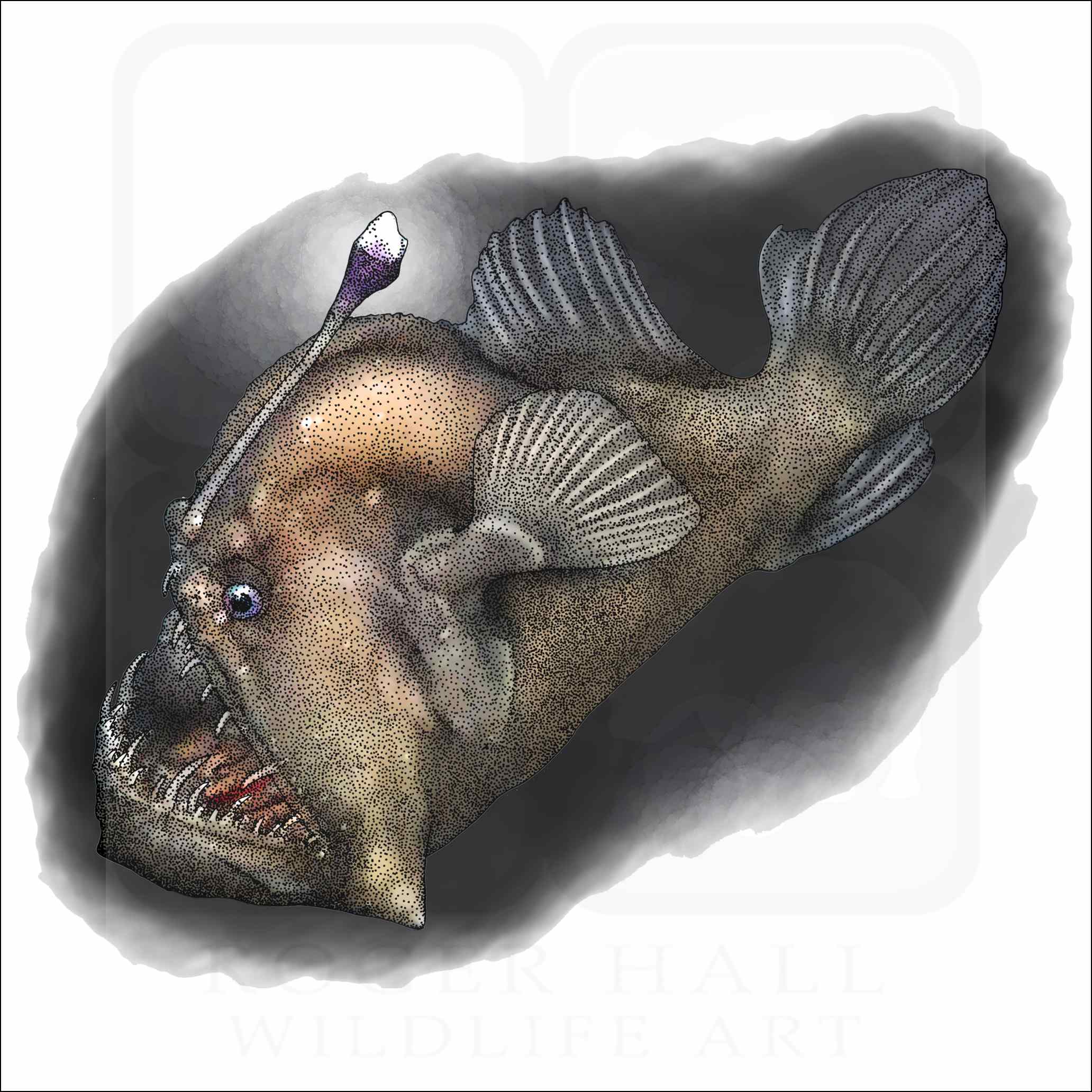 Fine art illustration of a Black Seadevil or Anglerfish (Melanocetus sp). The illustration is available in black and white or color.