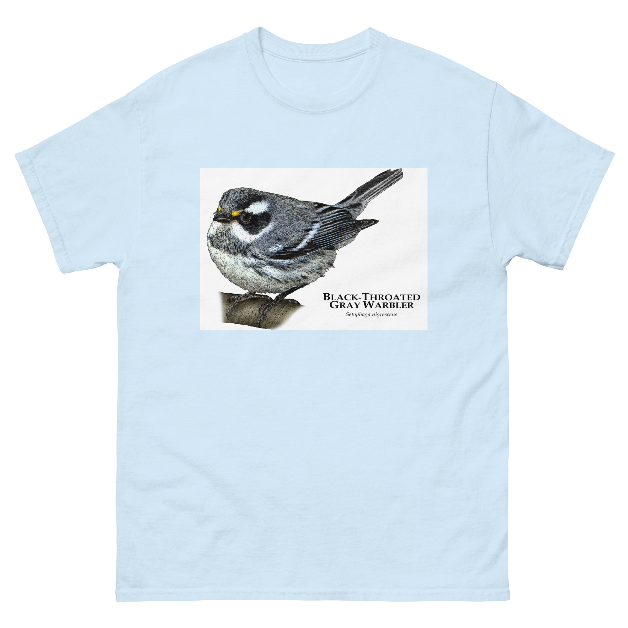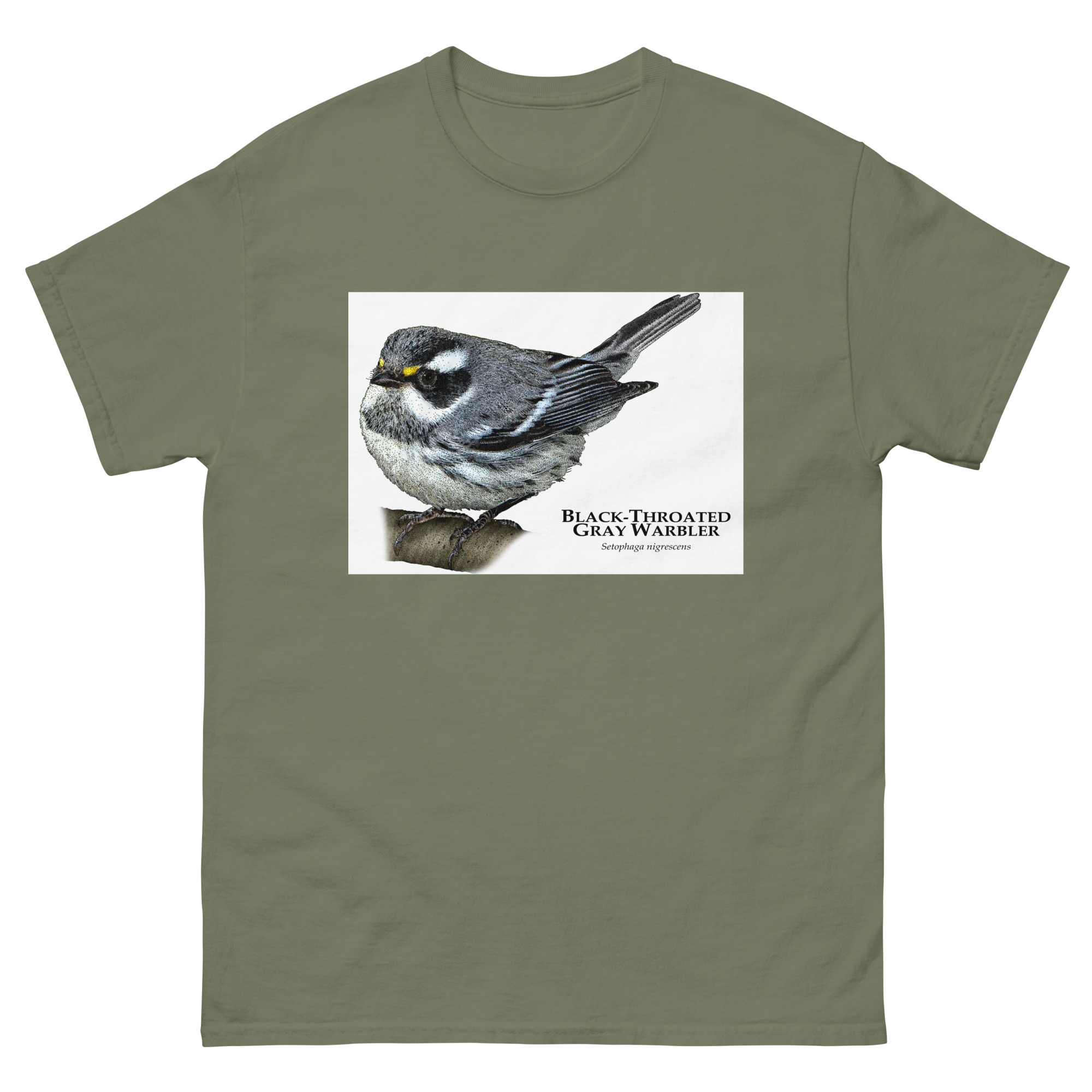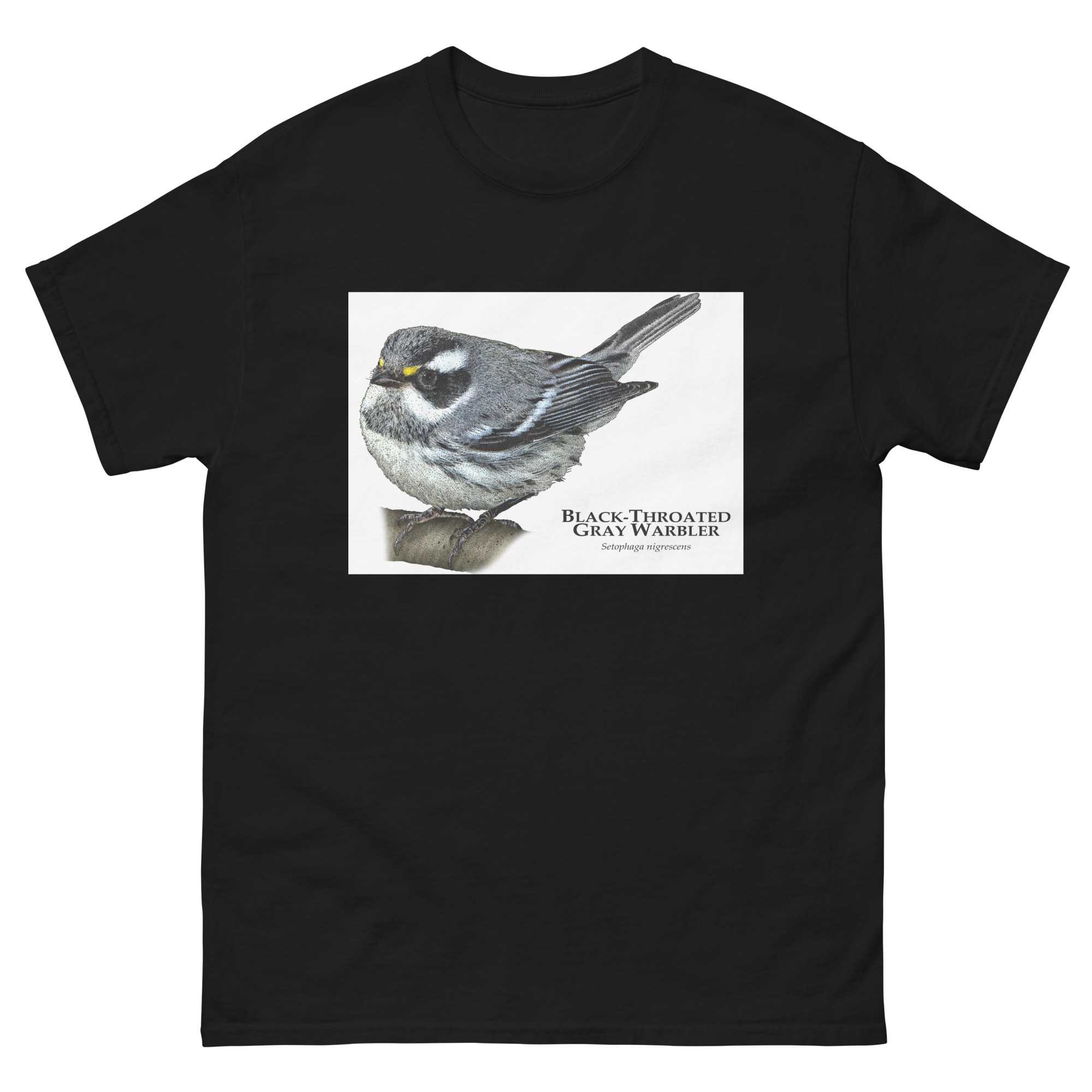 Fine art illustration of a Black-Throated Gray Warbler (Setophaga nigrescens) printed on a high-quality 100% unisex cotton t-shirt.