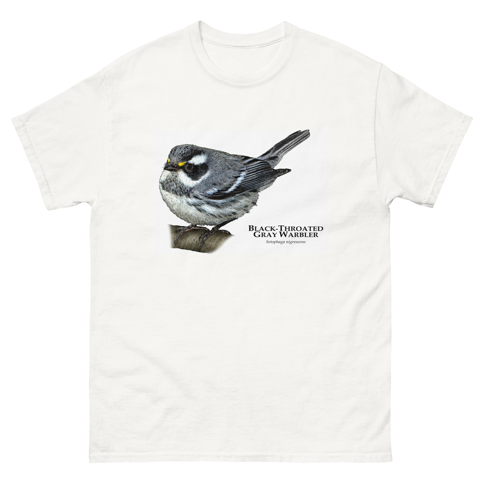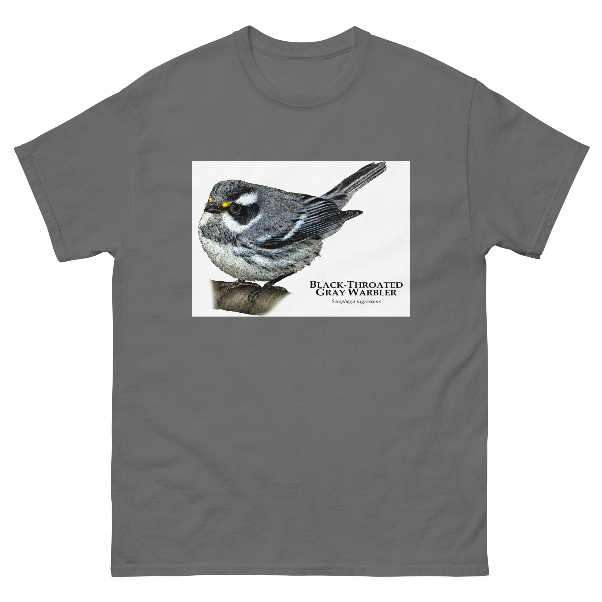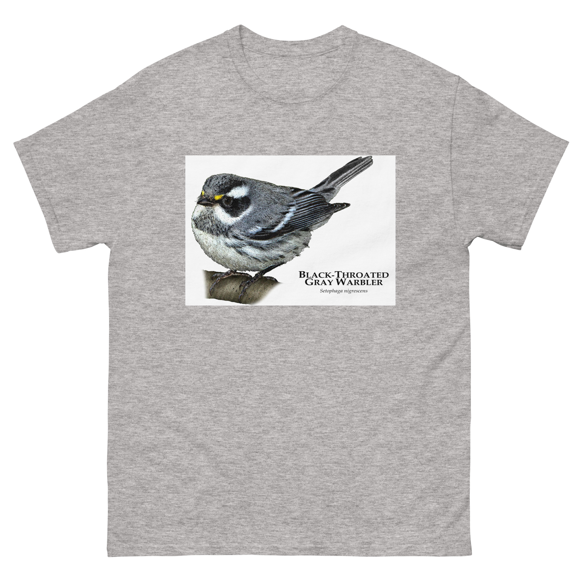 Fine art illustration of a Black-Throated Gray Warbler (Setophaga nigrescens) printed on a high-quality 100% unisex cotton t-shirt.