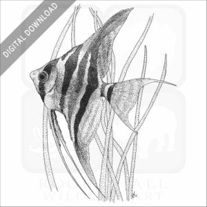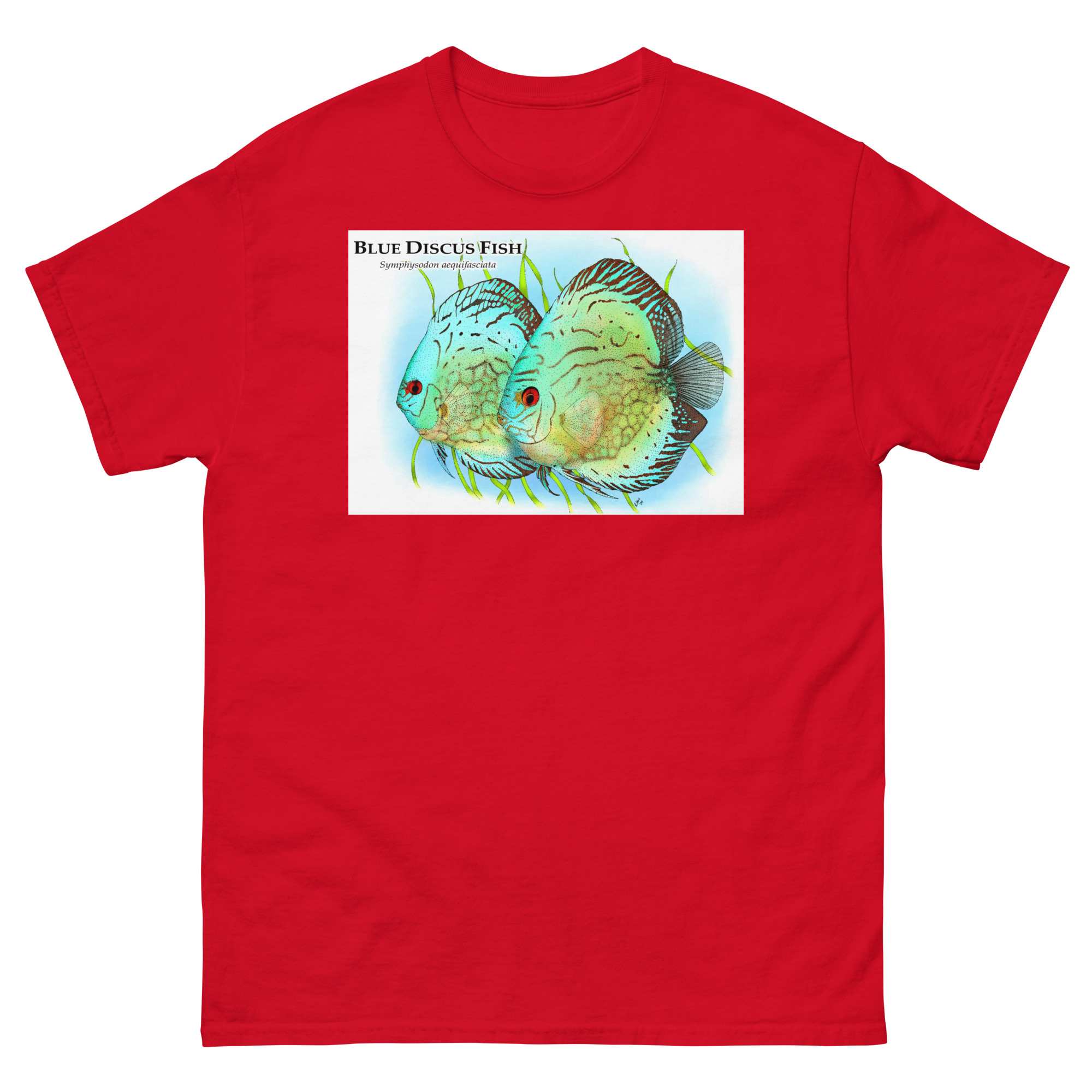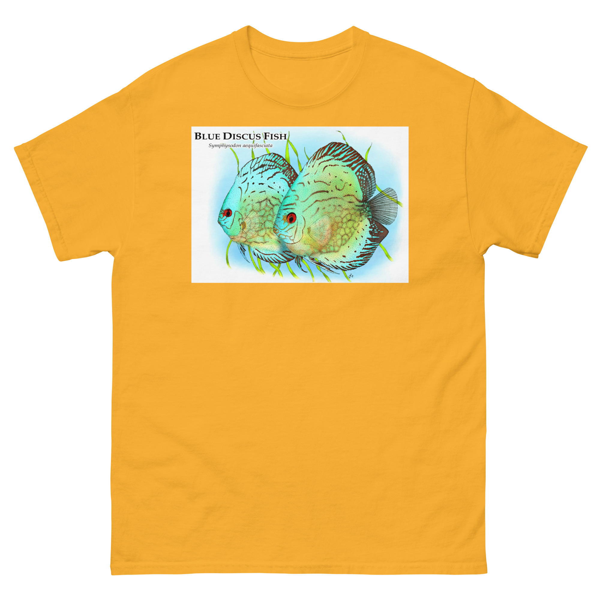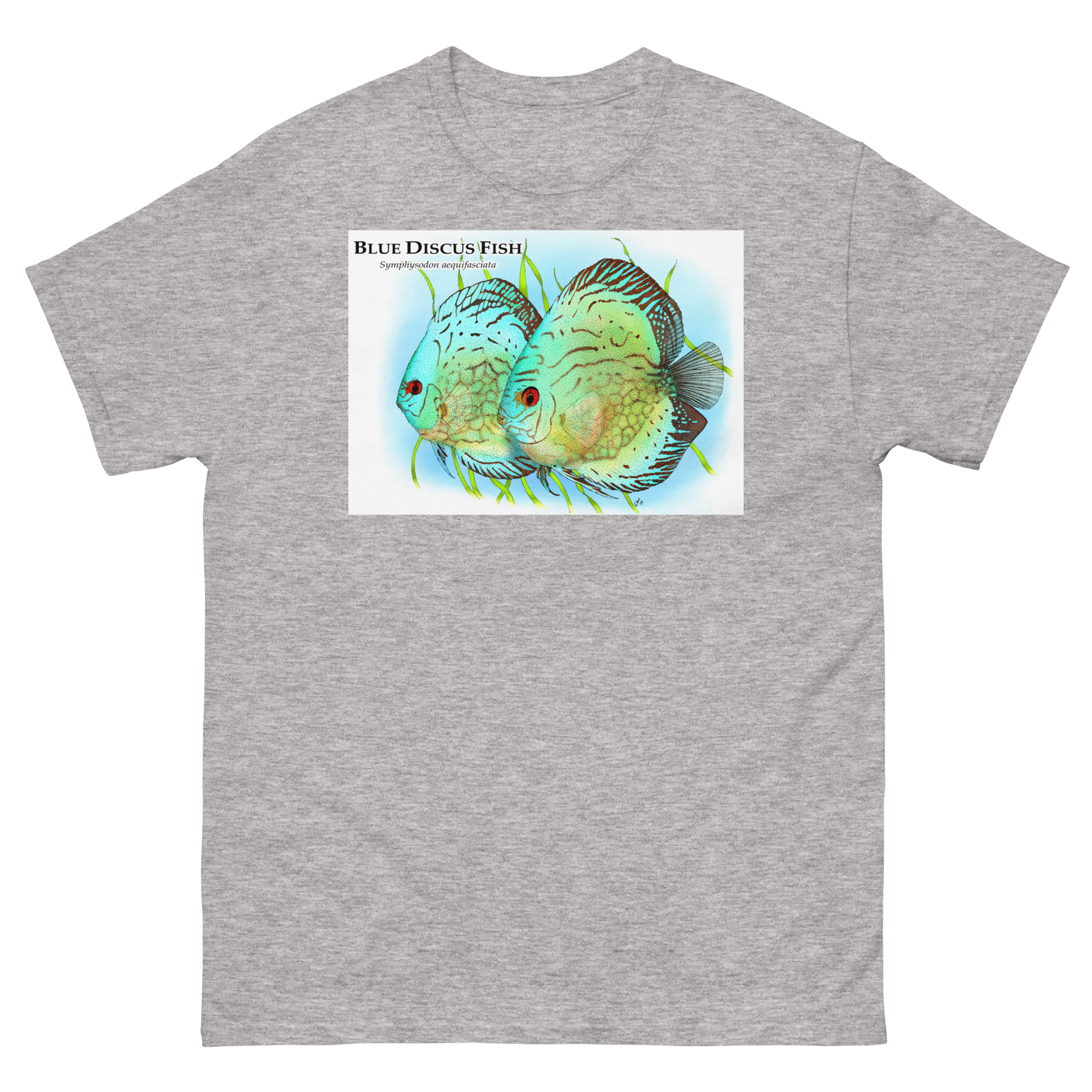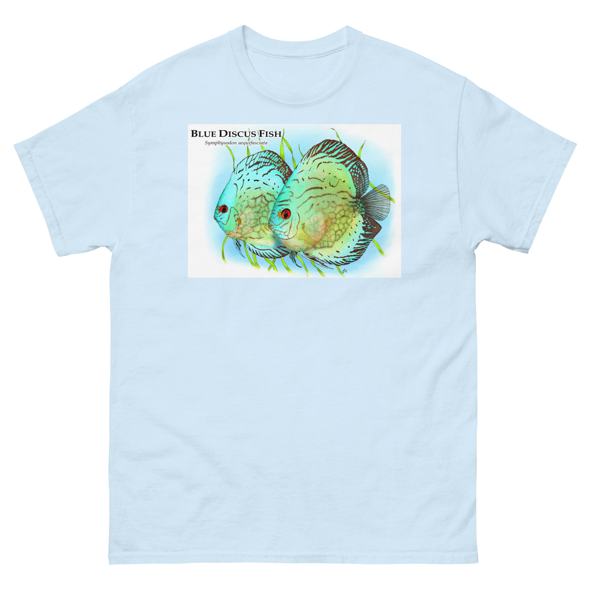 Fine art illustration of a Blue Discus Fish (Symphysodon aequifasciatus) printed on a high-quality 100% men’s cotton t-shirt.