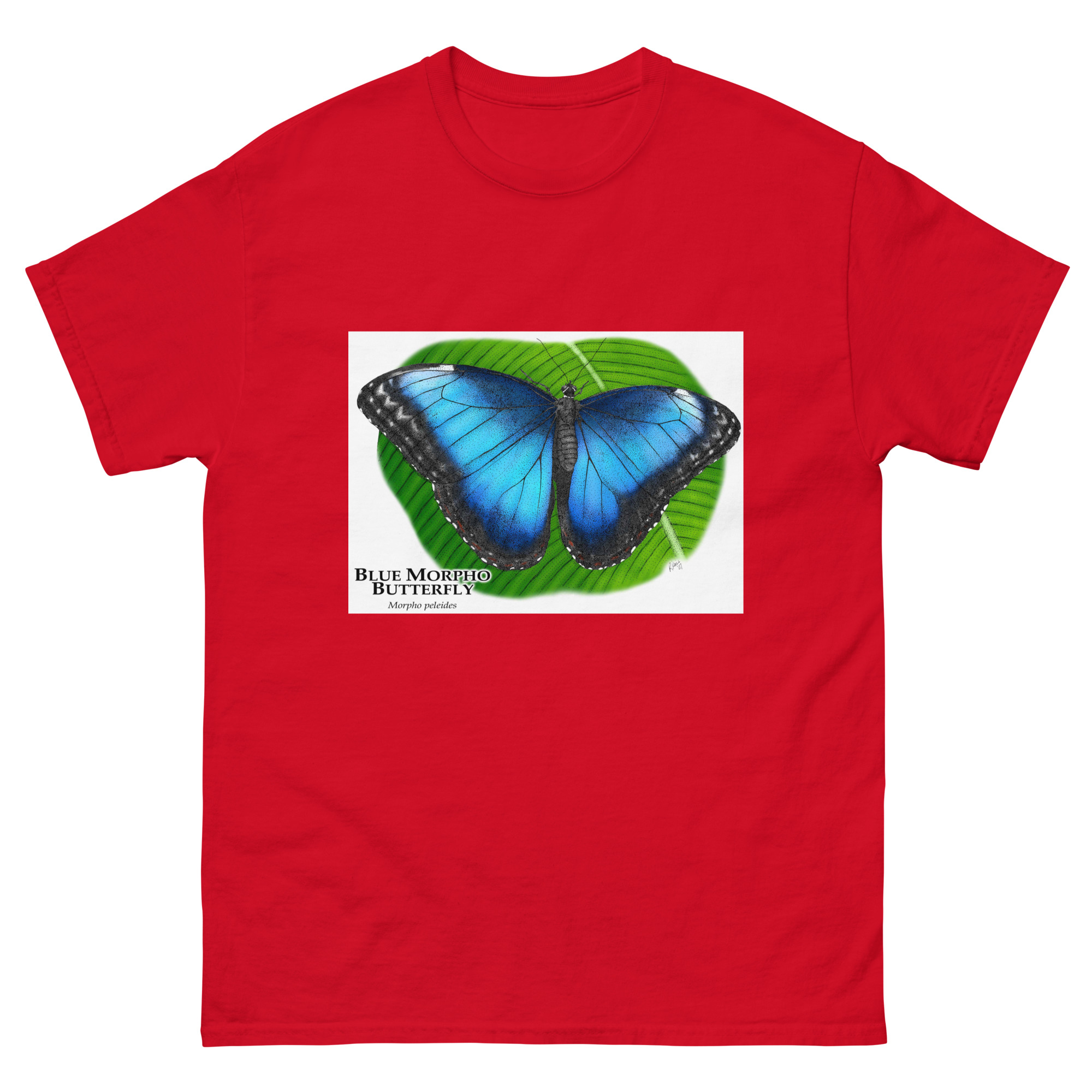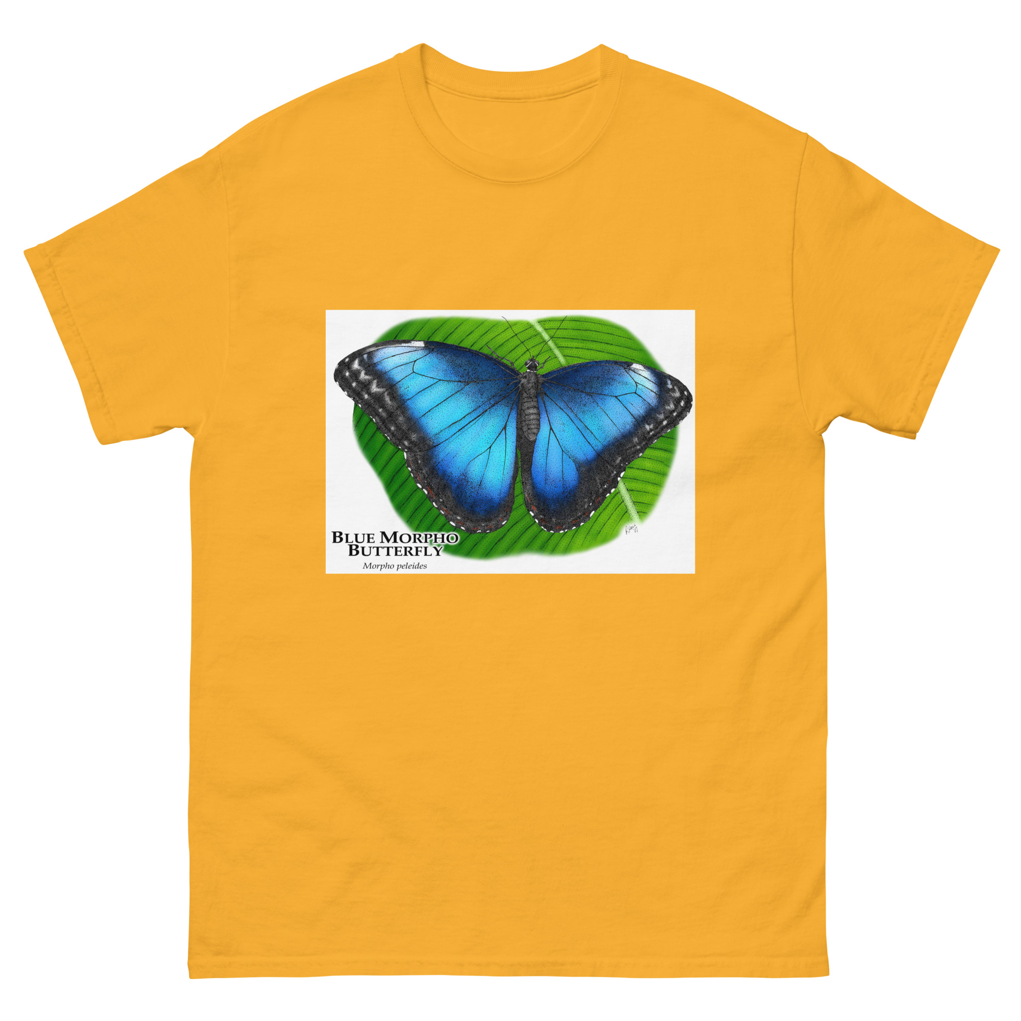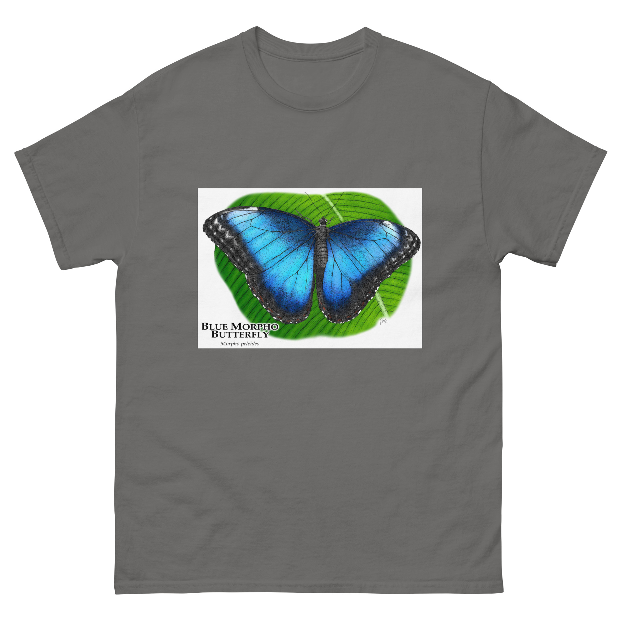 Fine art illustration of a Blue Morpho Butterfly (Morpho menelaus) printed on a high-quality 100% unisex cotton t-shirt.