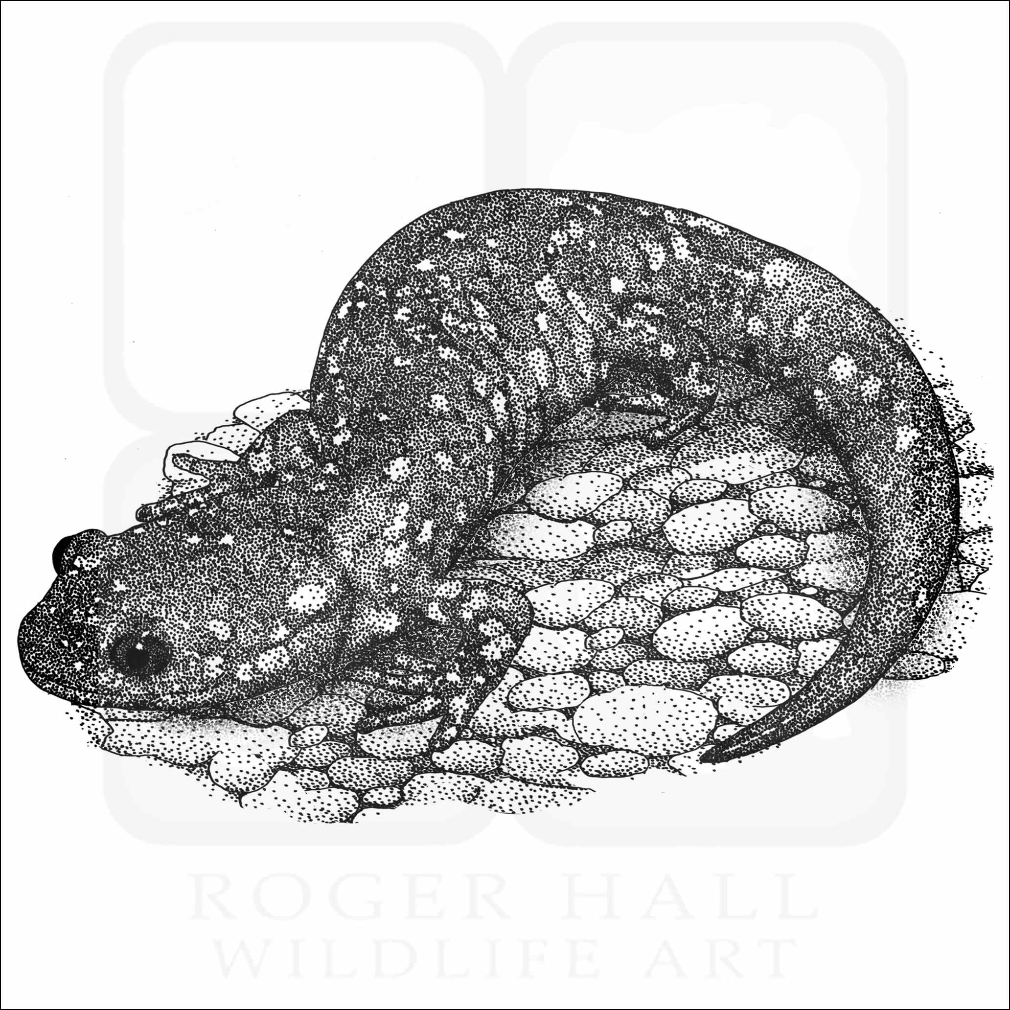 Fine art illustration of a Blue Spotted Salamander (Ambystoma laterale.) The illustration is available in black and white or color.