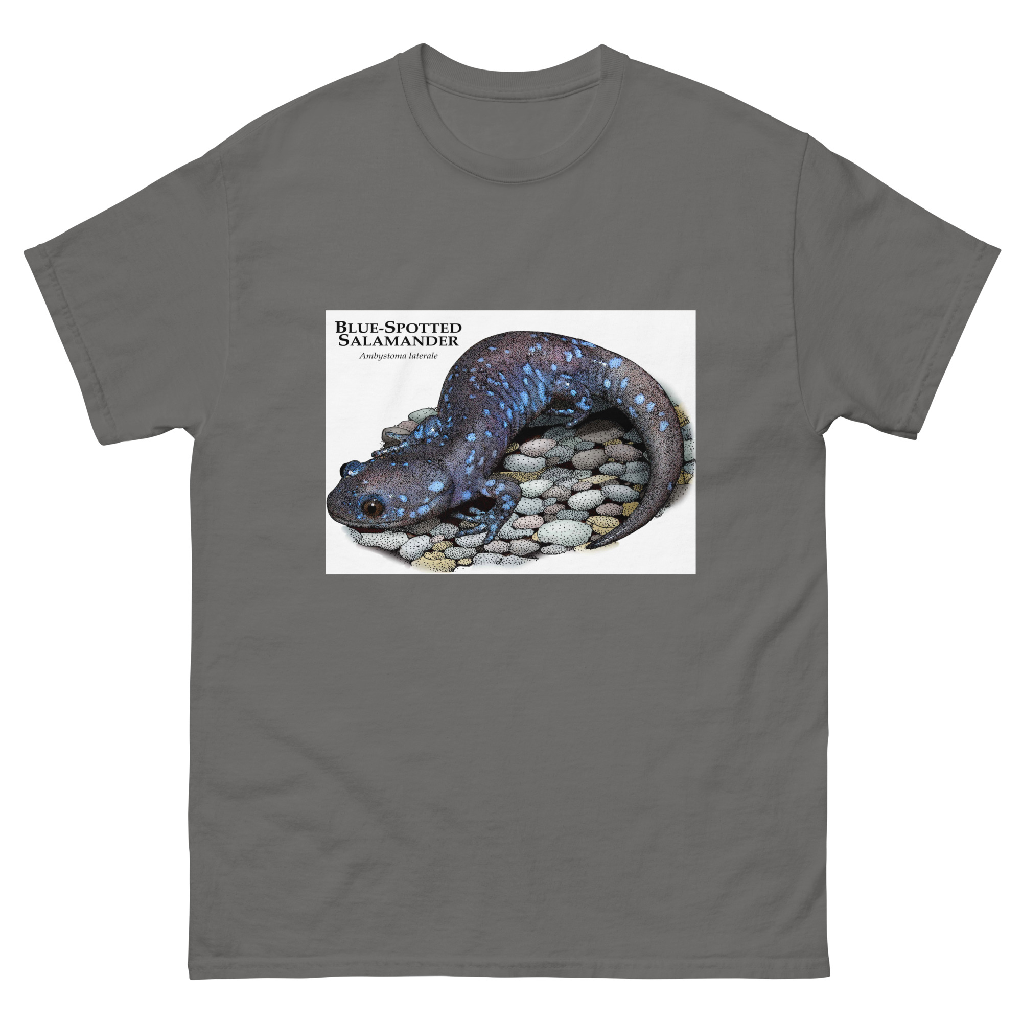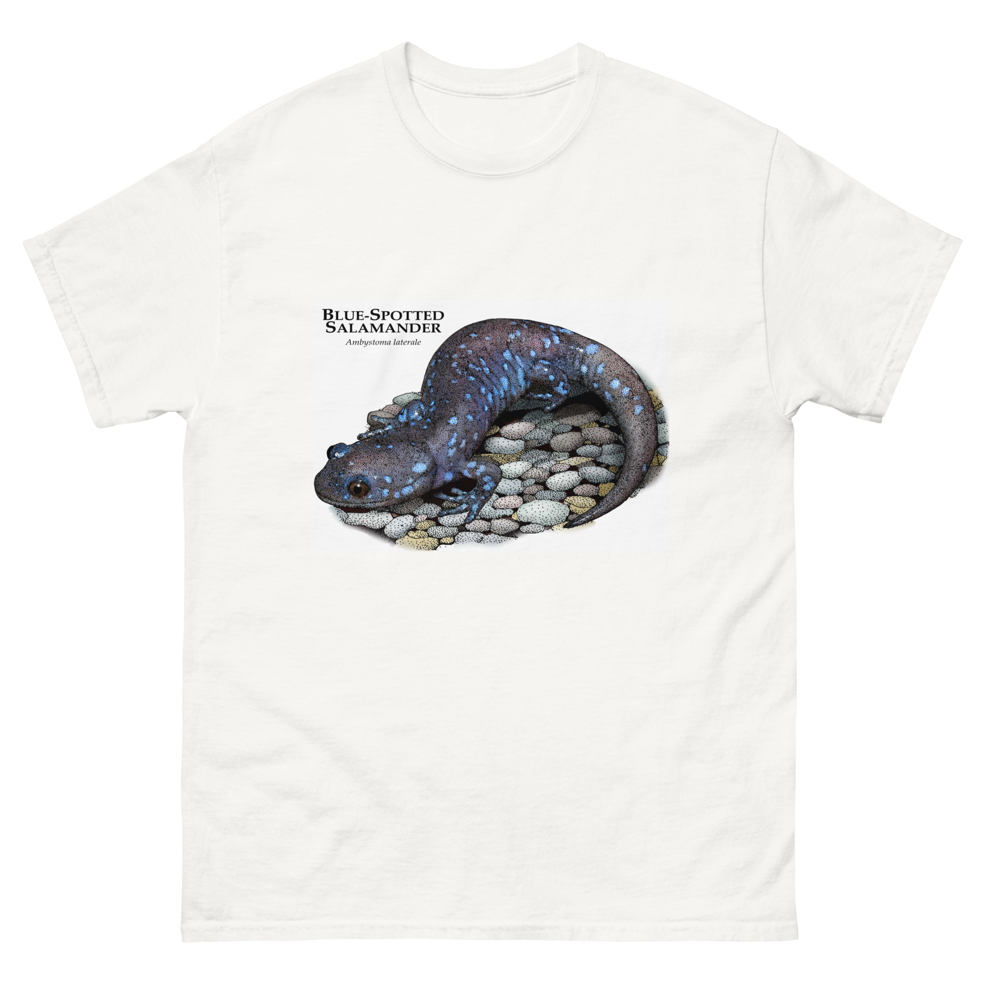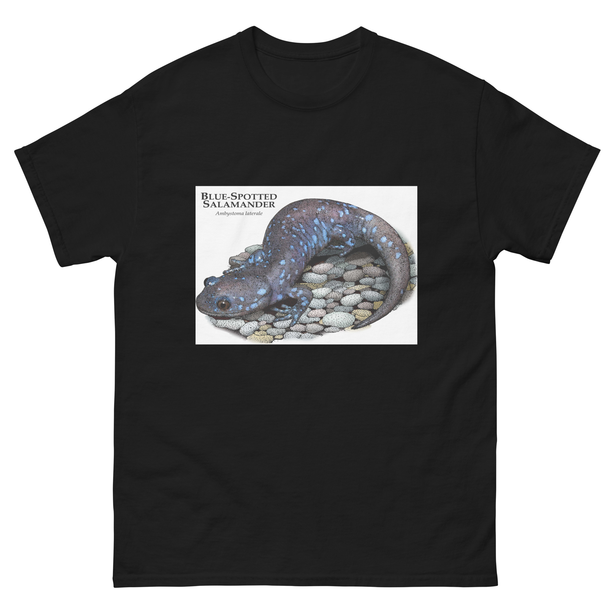 Fine art illustration of a Blue-Spotted Salamander (Ambystoma laterale) printed on a high-quality 100% unisex cotton t-shirt.