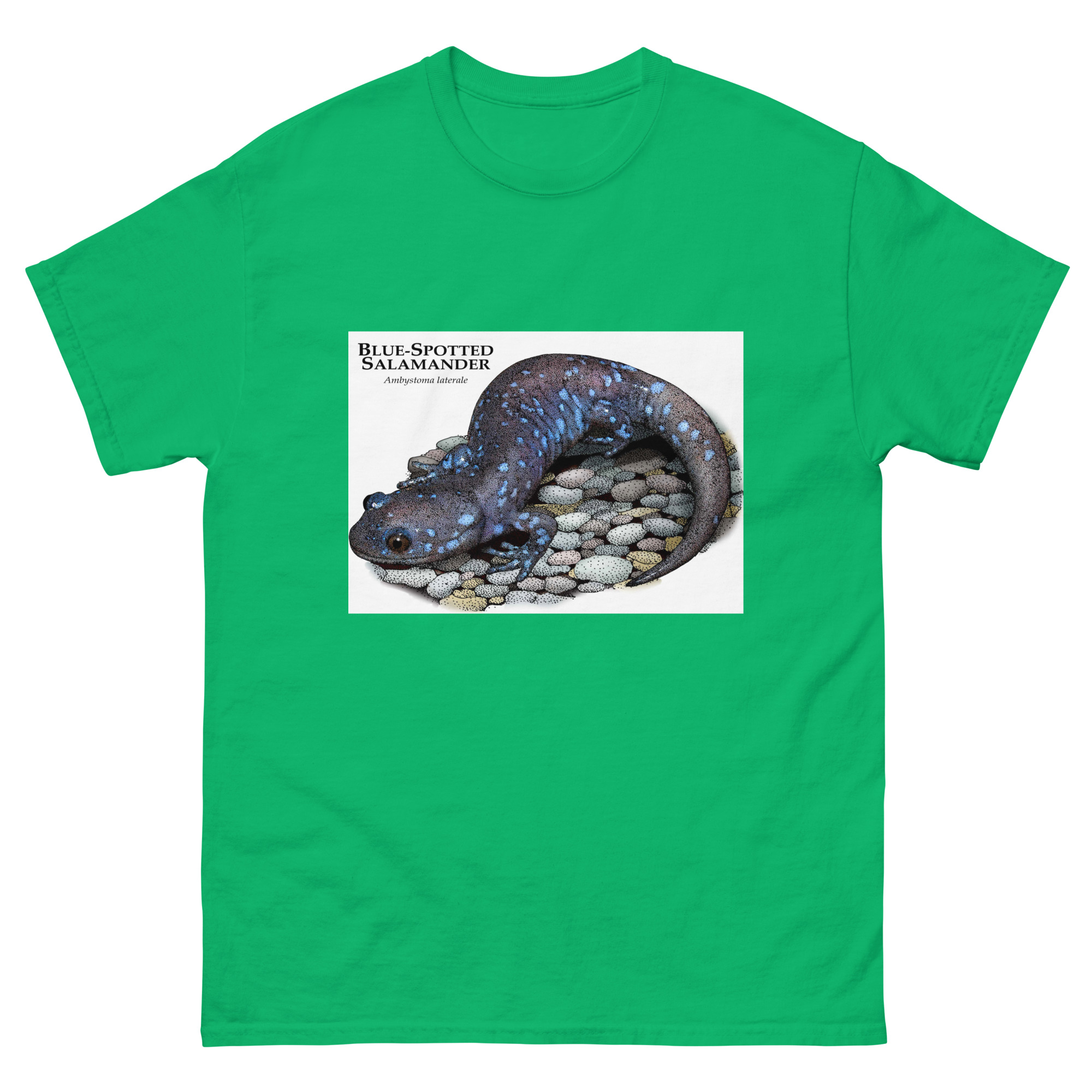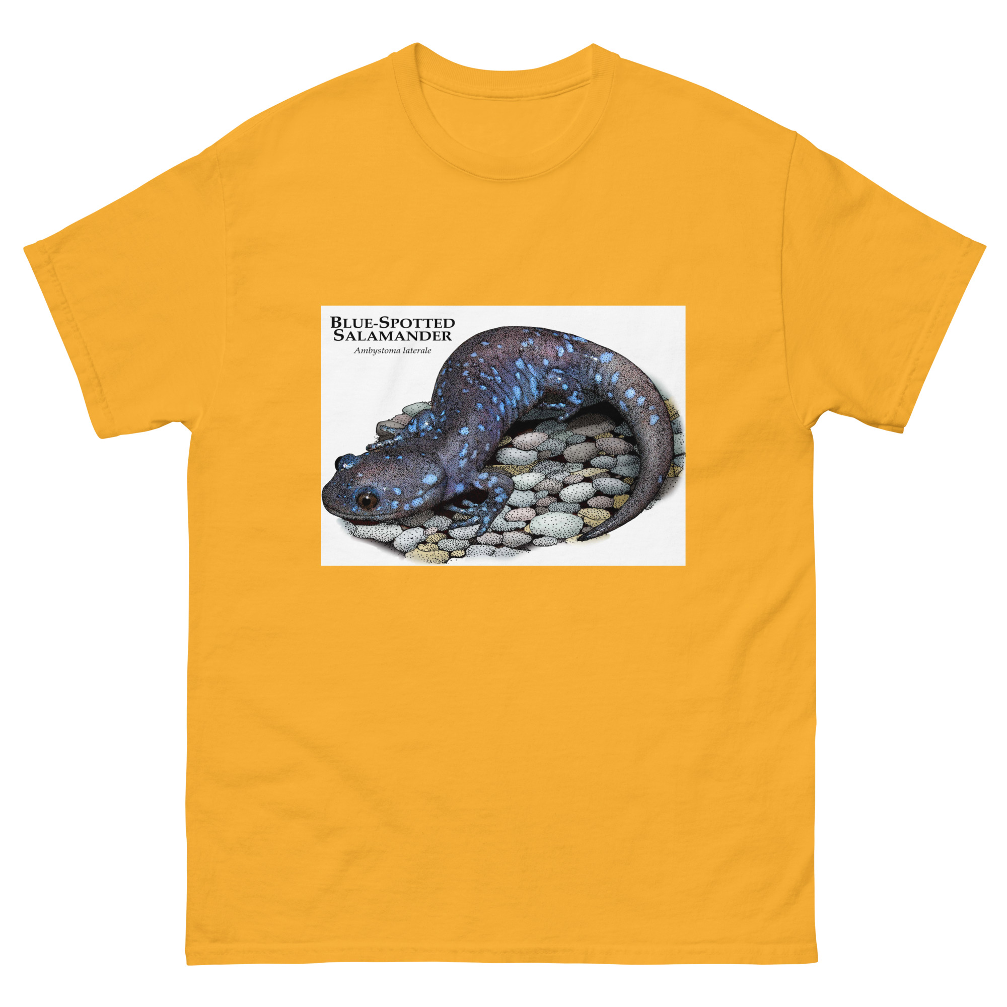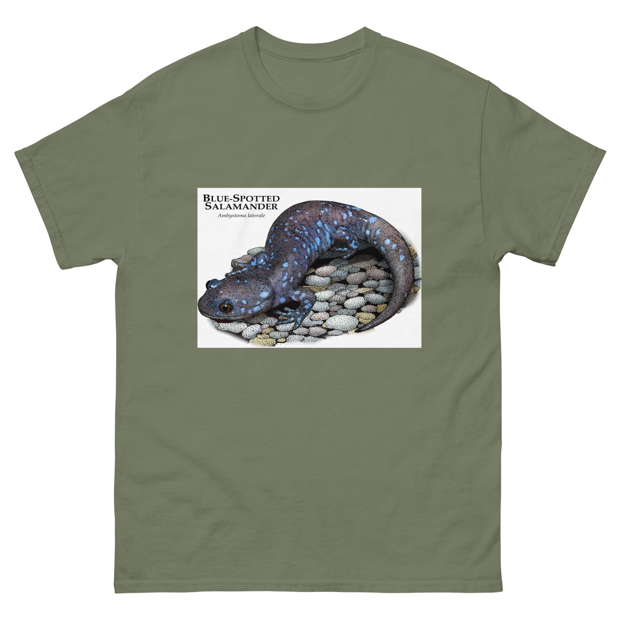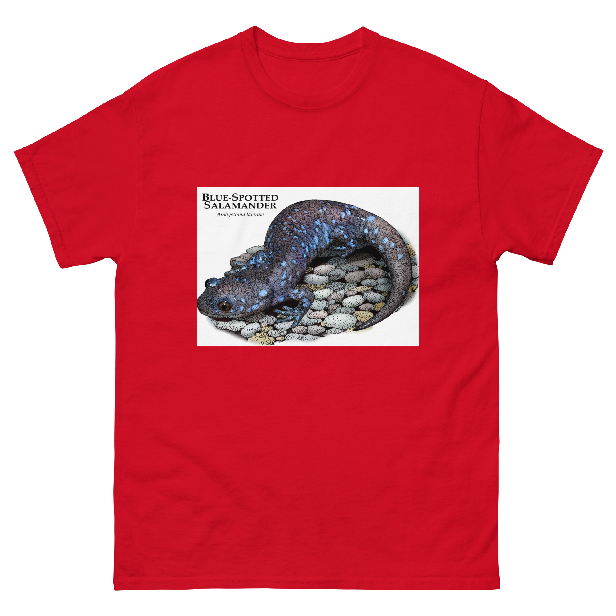Fine art illustration of a Blue-Spotted Salamander (Ambystoma laterale) printed on a high-quality 100% unisex cotton t-shirt.