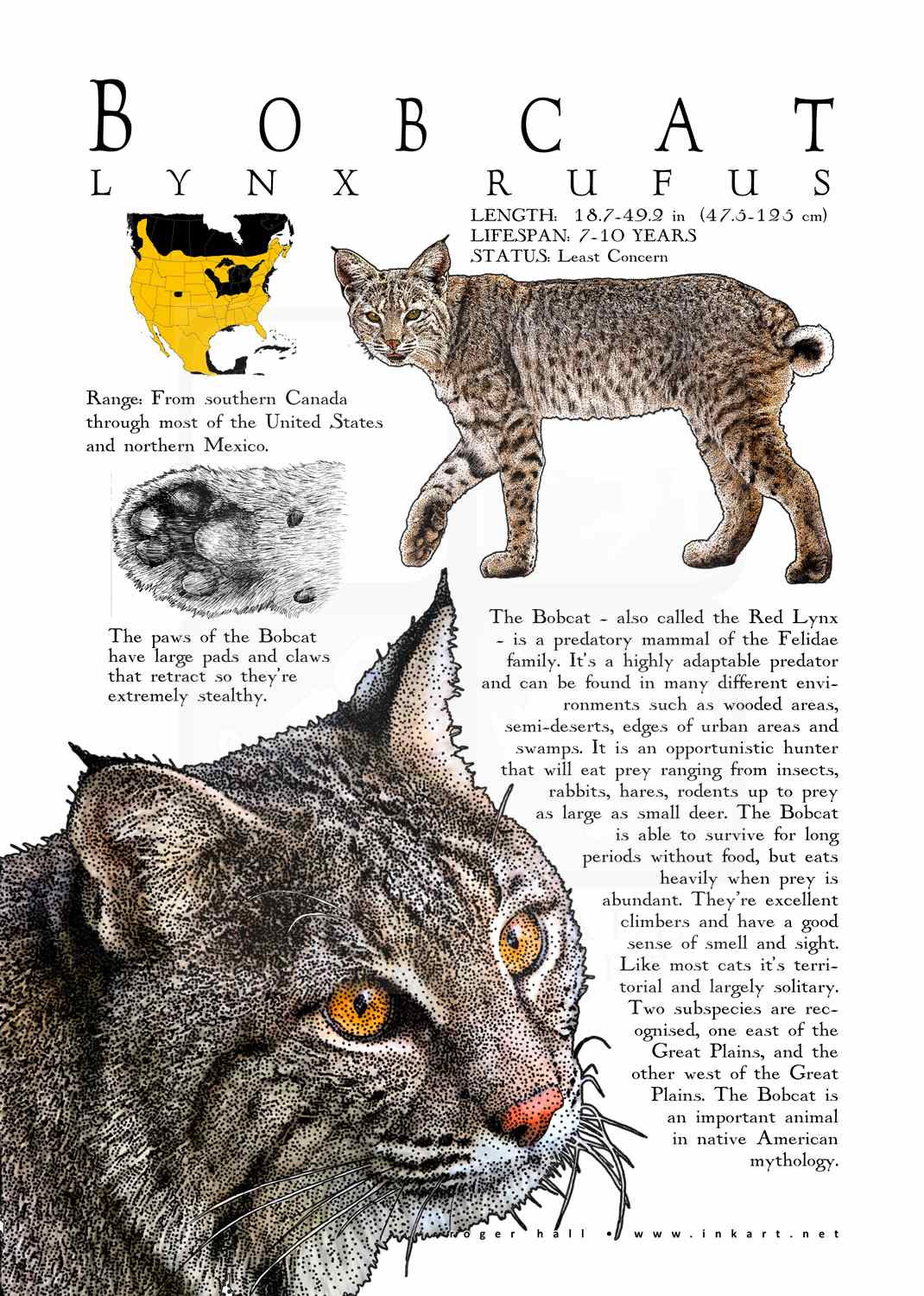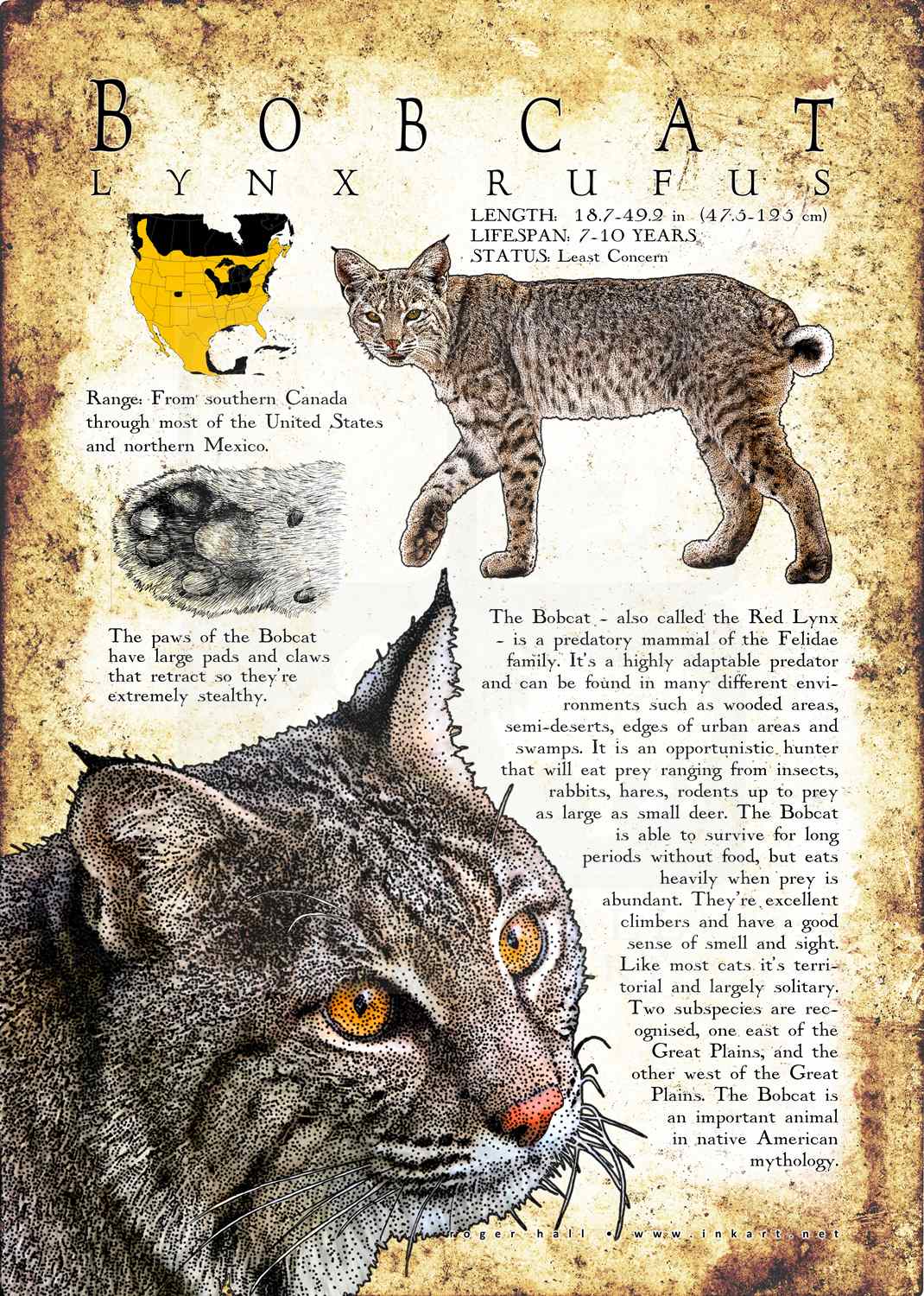 This poster features an informational graphic of the Bobcat. It includes a map of the animal’s range, along with three illustrations and a small paragraph with information.