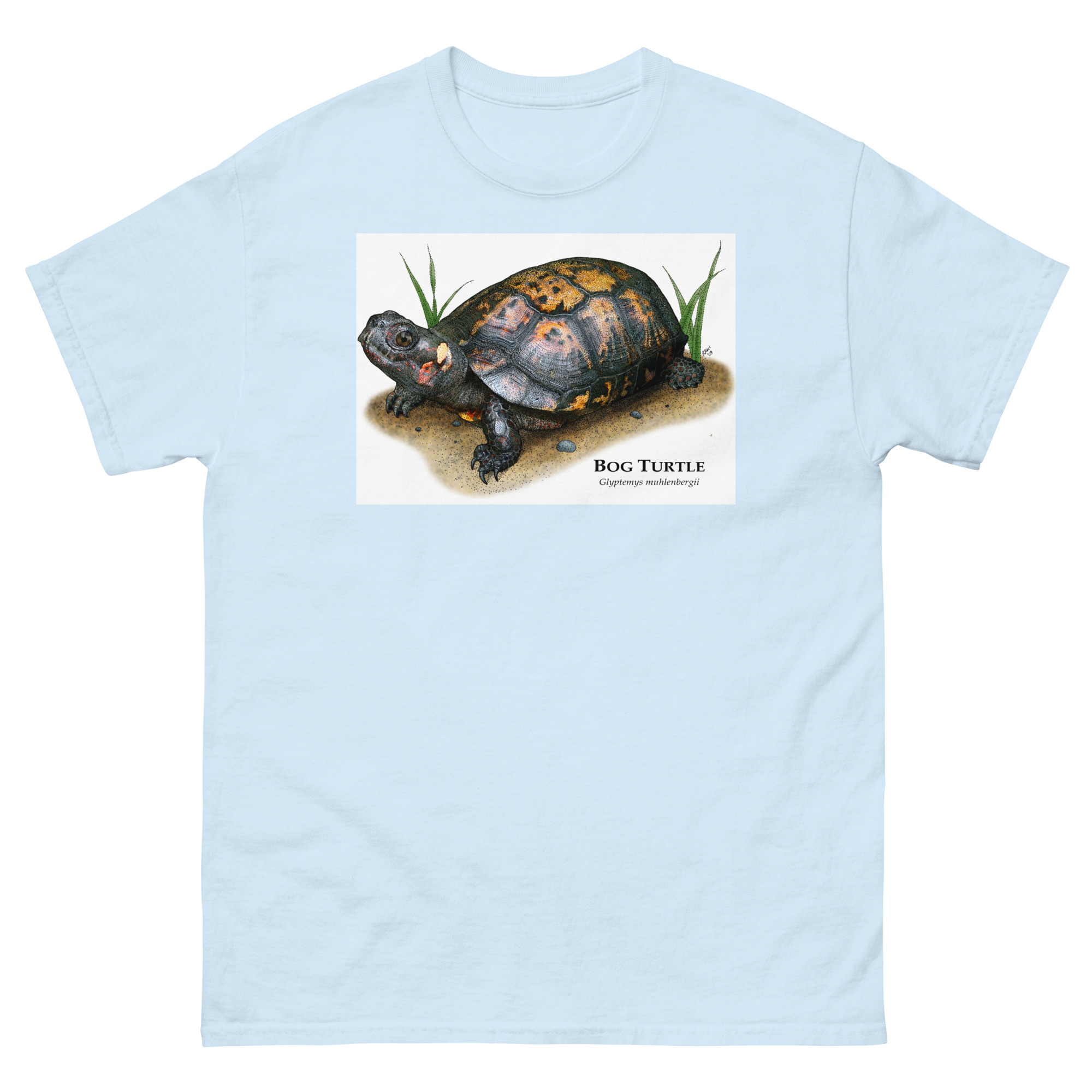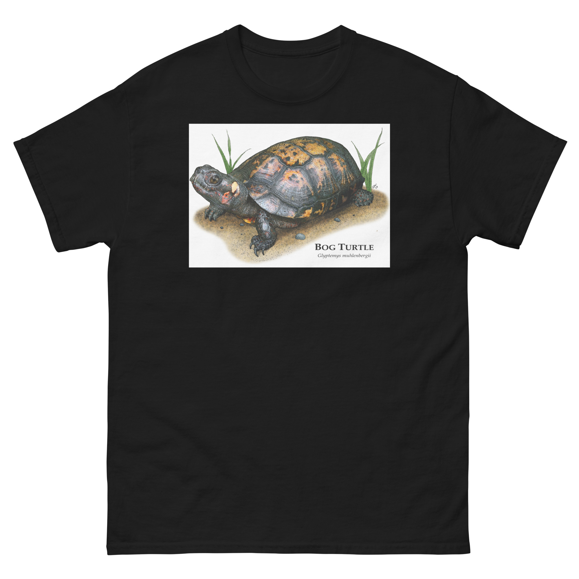 Fine art illustration of a Bog Turtle (Glyptemys muhlenbergii) printed on a high-quality 100% men’s cotton t-shirt.