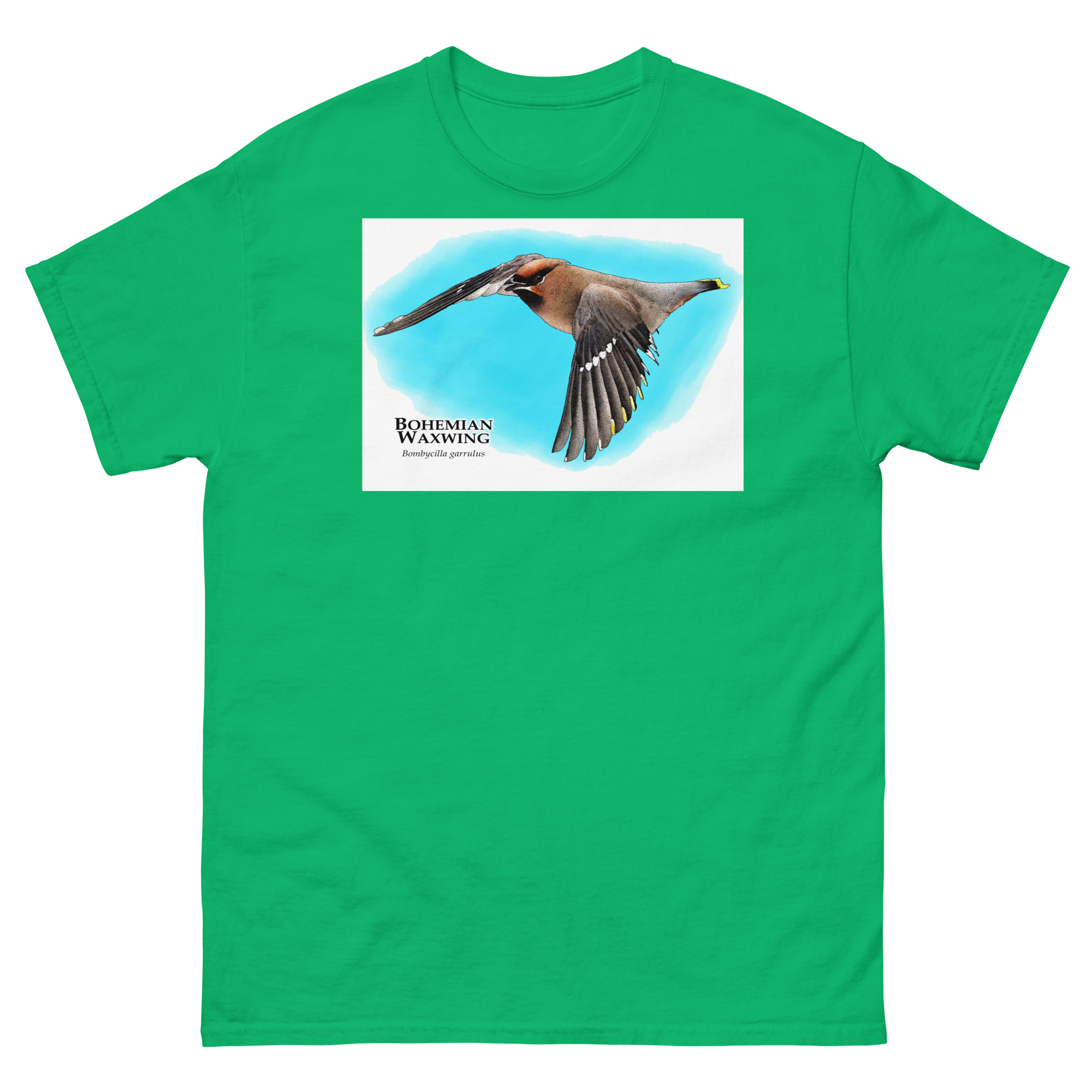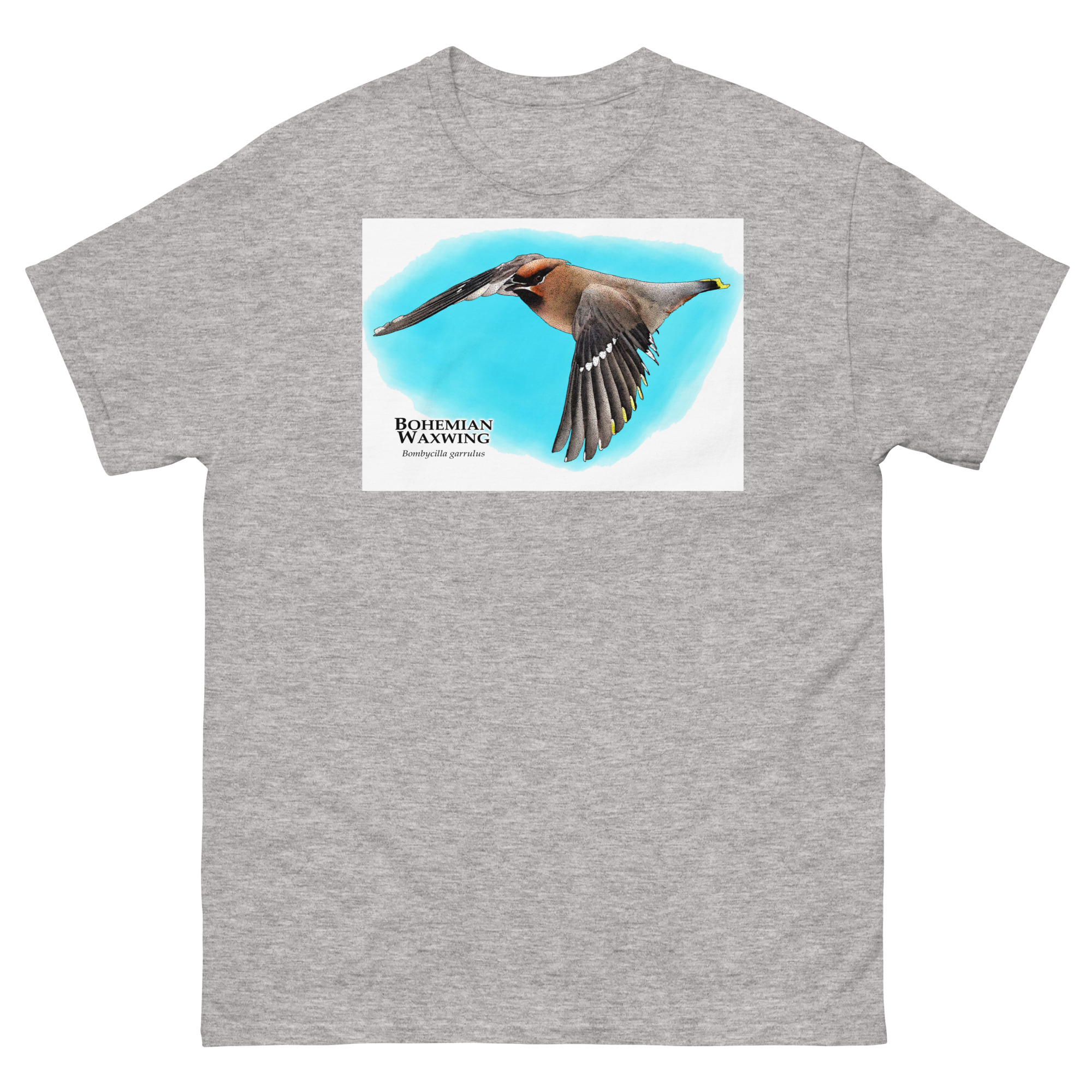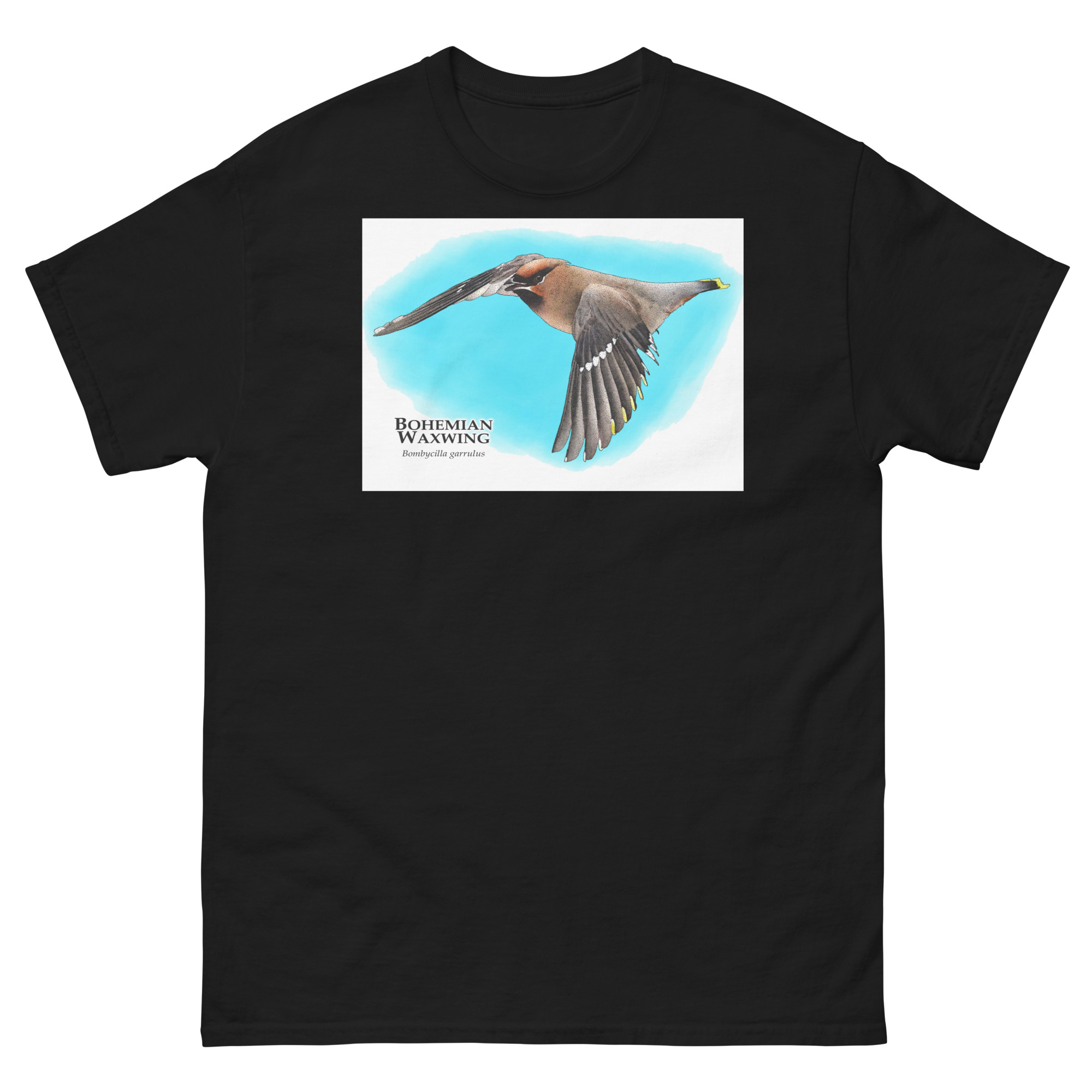Fine art illustration of a Boeheim Waxwing (Bombycilla garrulus) printed on a high-quality 100% men’s cotton t-shirt.