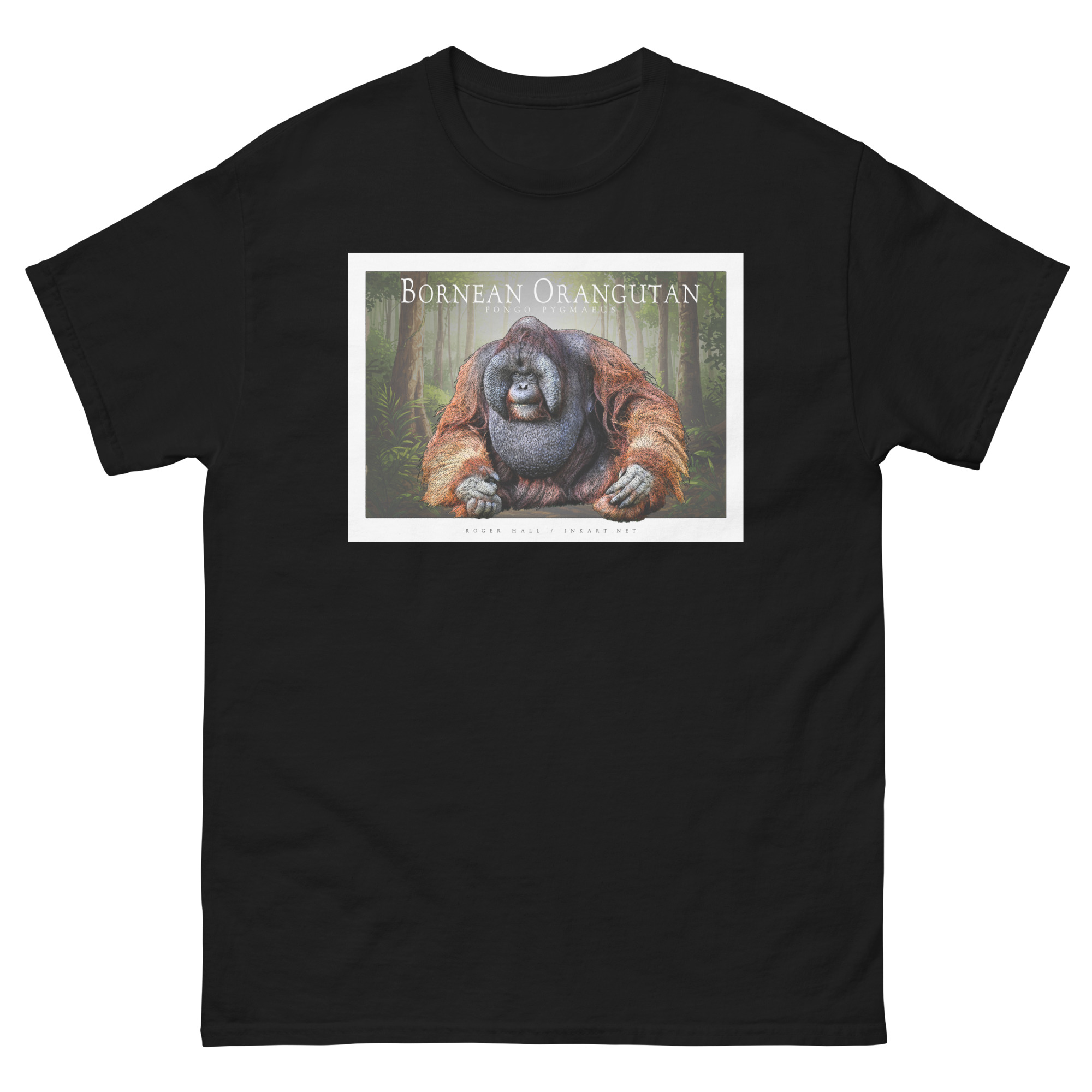 Scientifically accurate drawing of a Bornean Orangutan (Pongo pygmaeus.) The illustration of a printed on a high-quality 100% unisex cotton t-shirt.