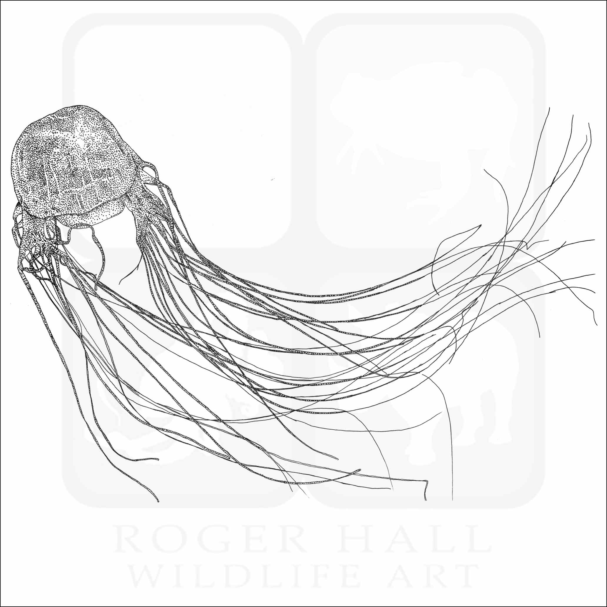 Fine art illustration of a Box Jellyfish (Chironex fleckeri.) The illustration is available in black and white or color.