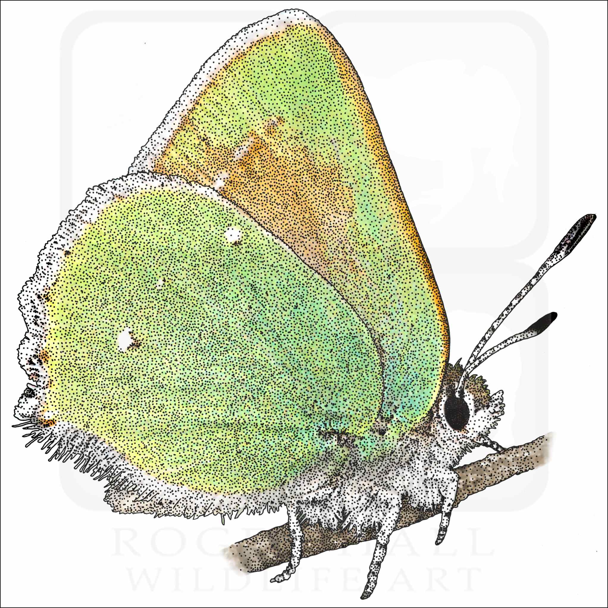 Fine art illustration of a Bramble or Coastal Green Hairstreak Butterfly (Callophrys dumetorum.) The illustration is available in black and white or color.