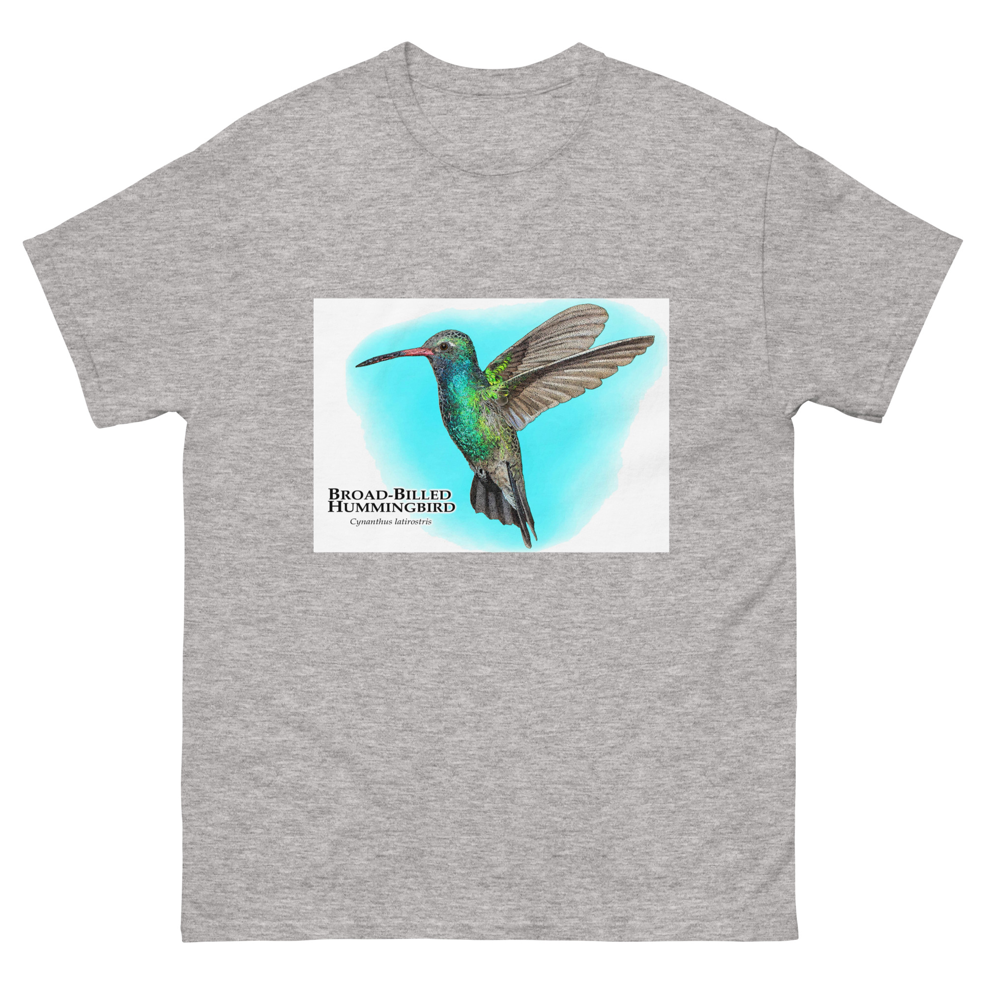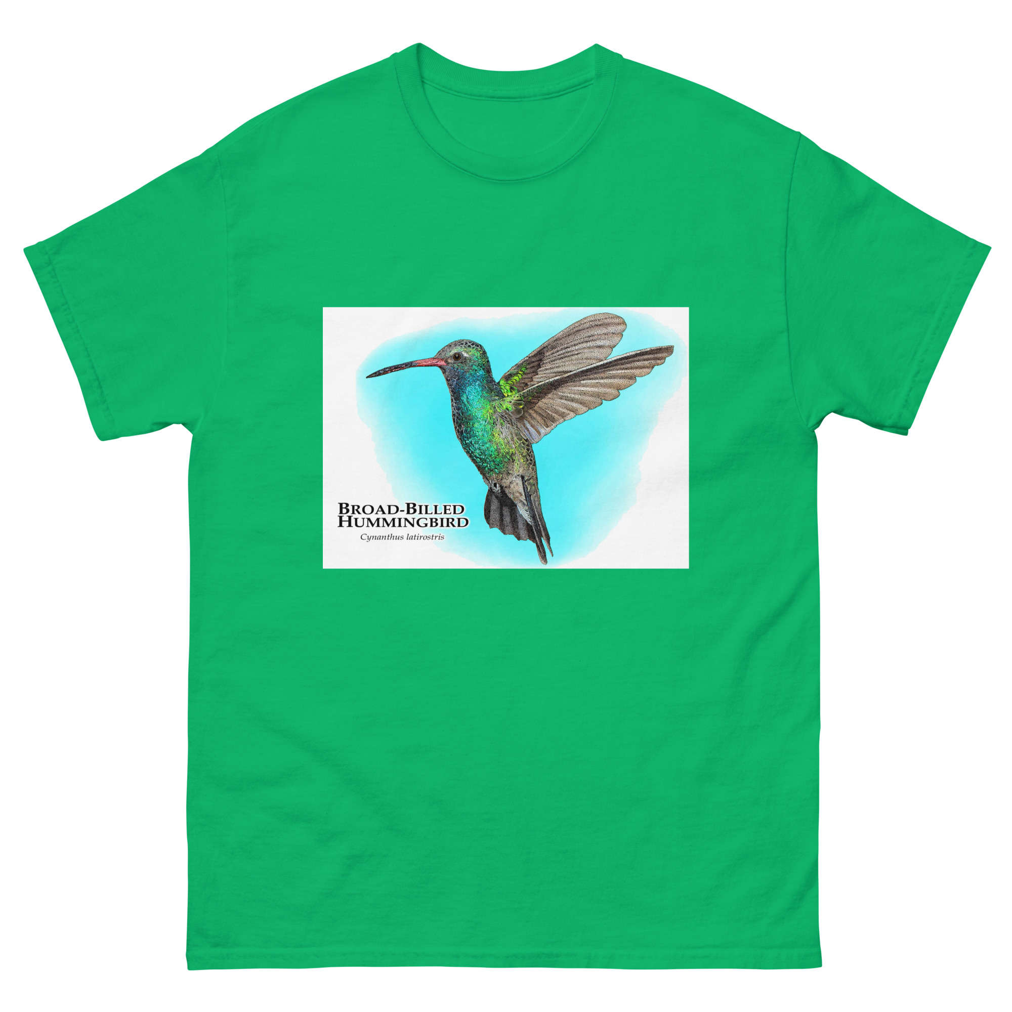 Fine art illustration of a Broad-Billed Hummingbird (Cynanthus latirostris) printed on a high-quality 100% unisex cotton t-shirt.