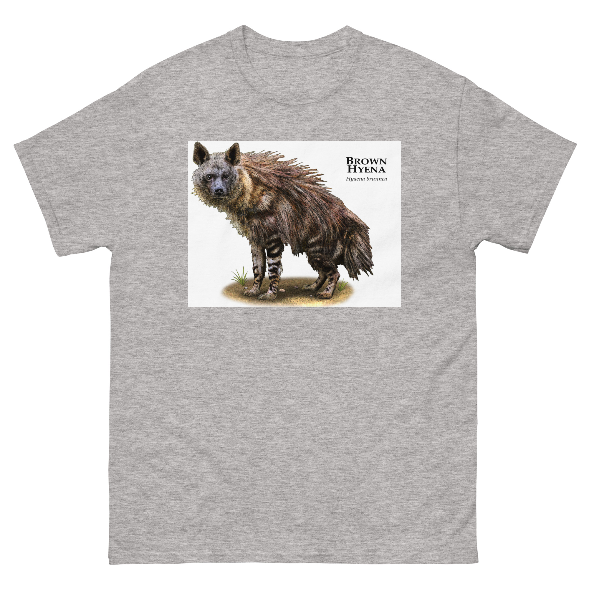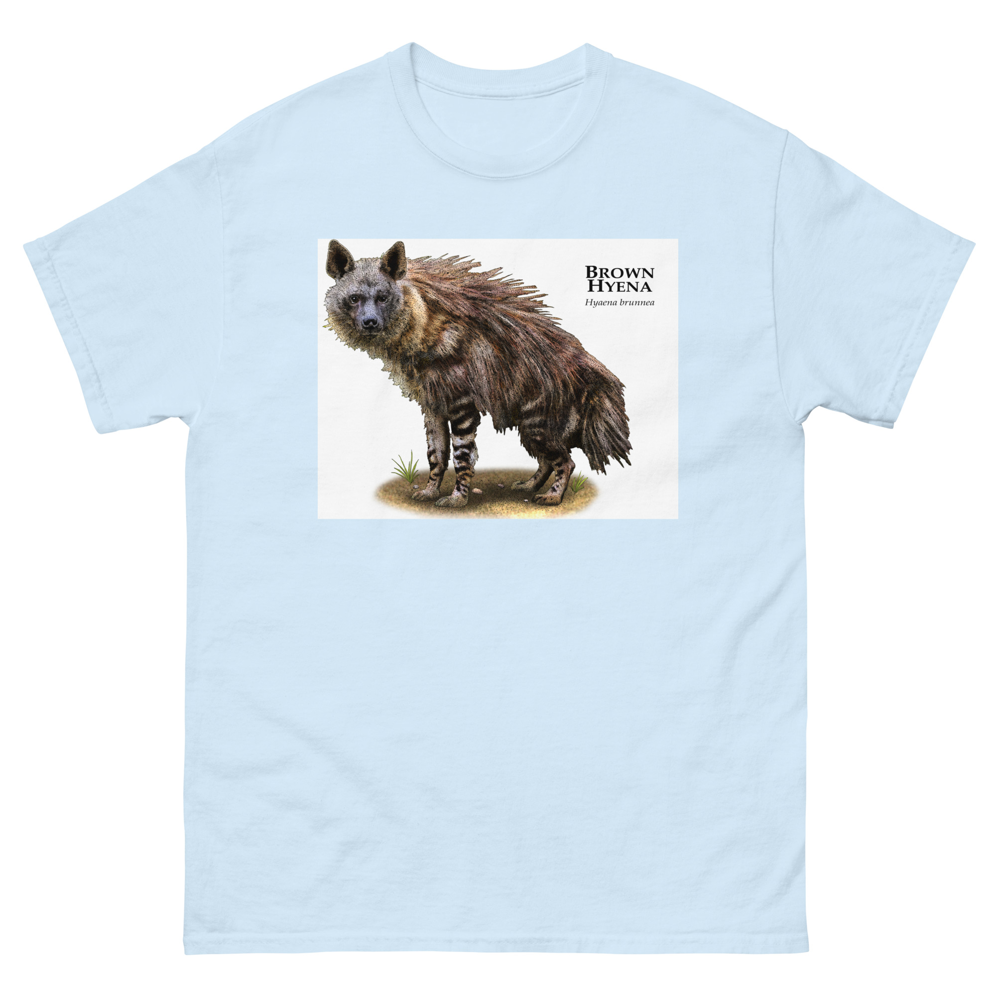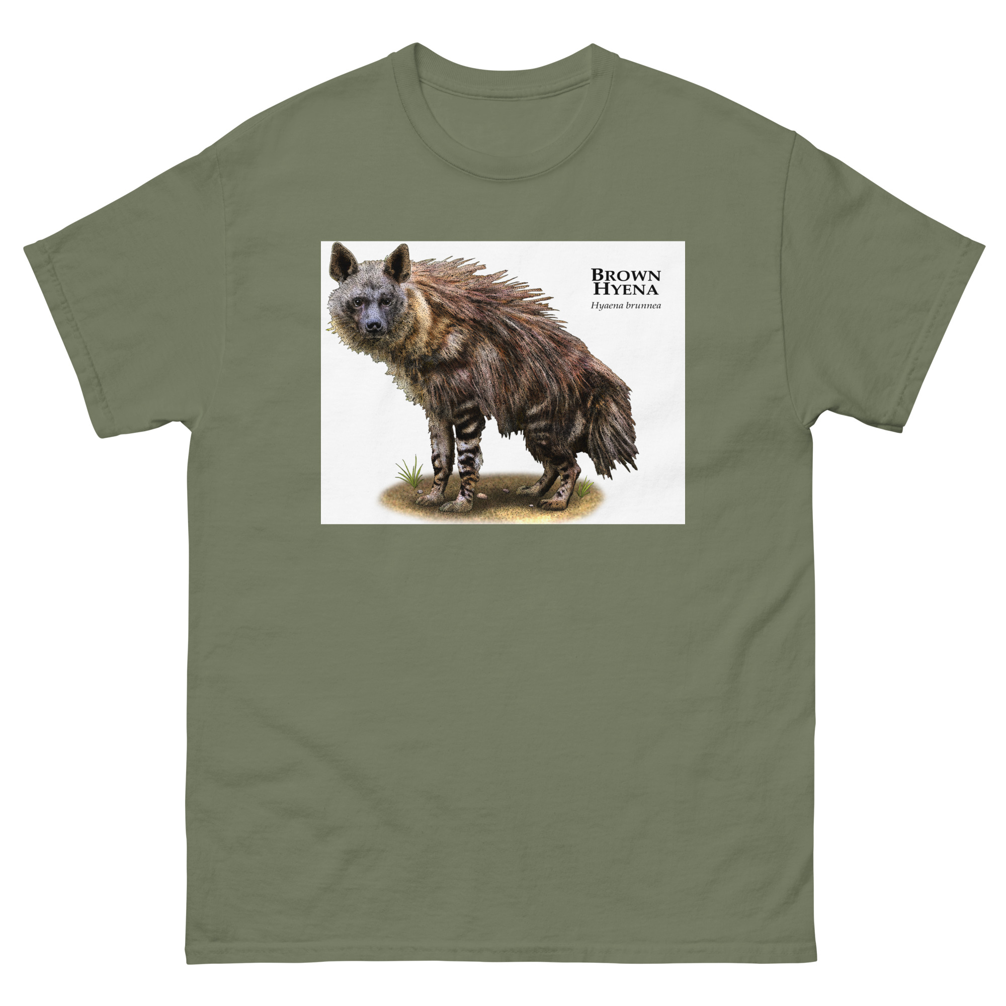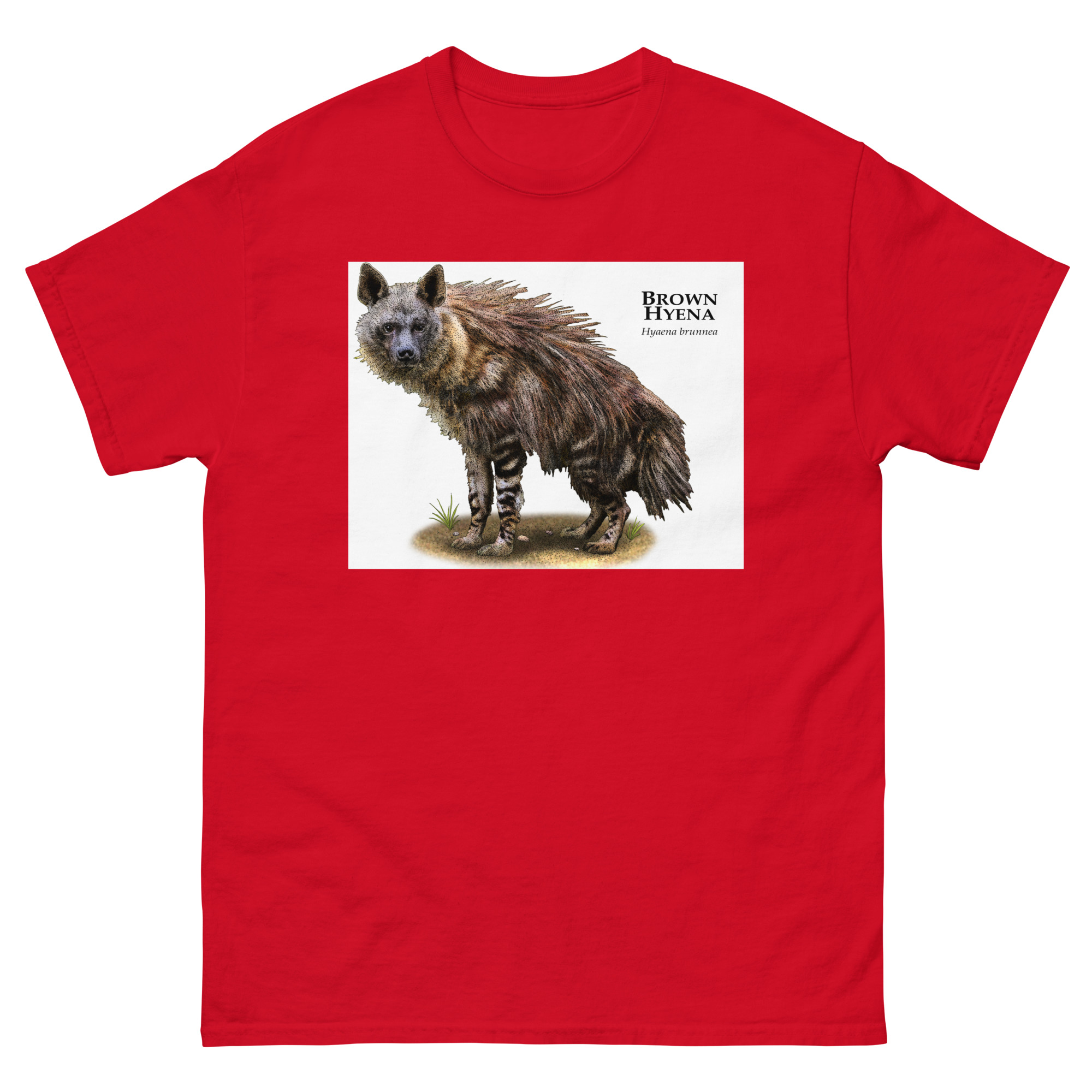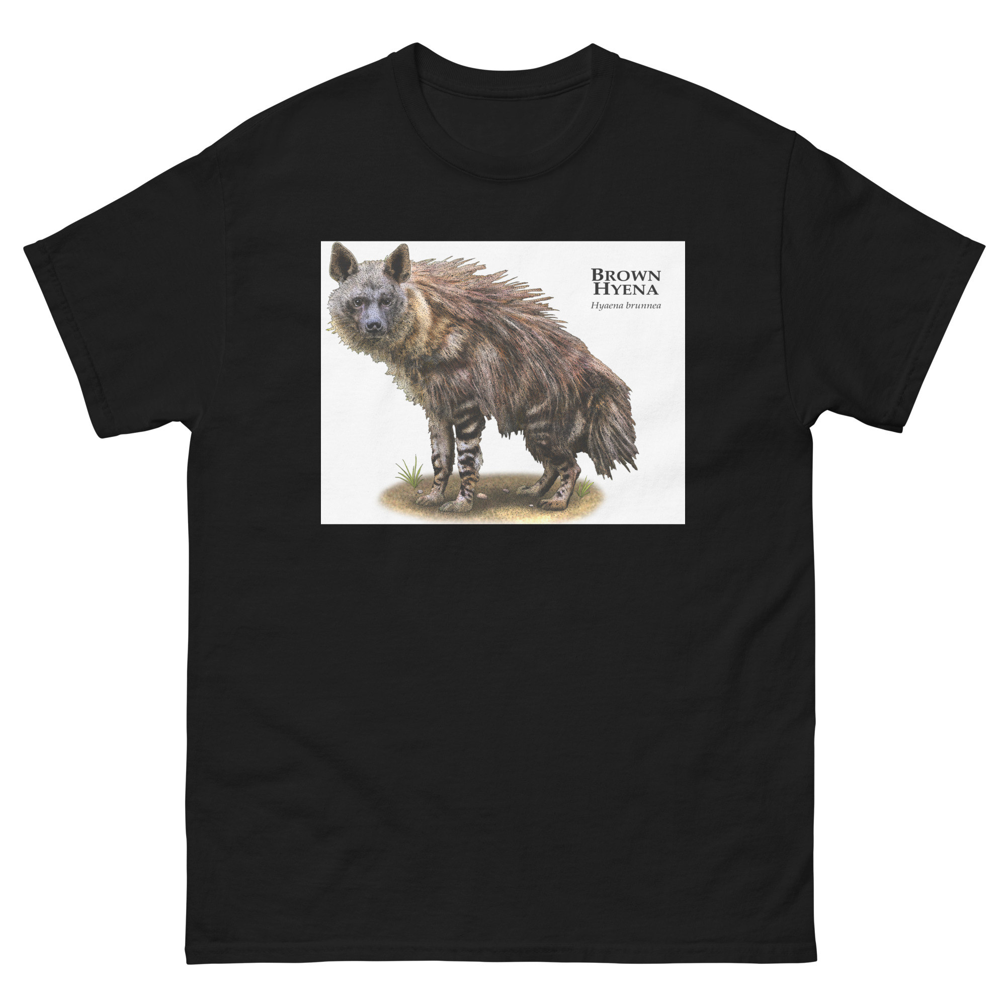 Fine art illustration of a Brown Hyena (Hyaena brunnea) printed on a high-quality 100% unisex cotton t-shirt.