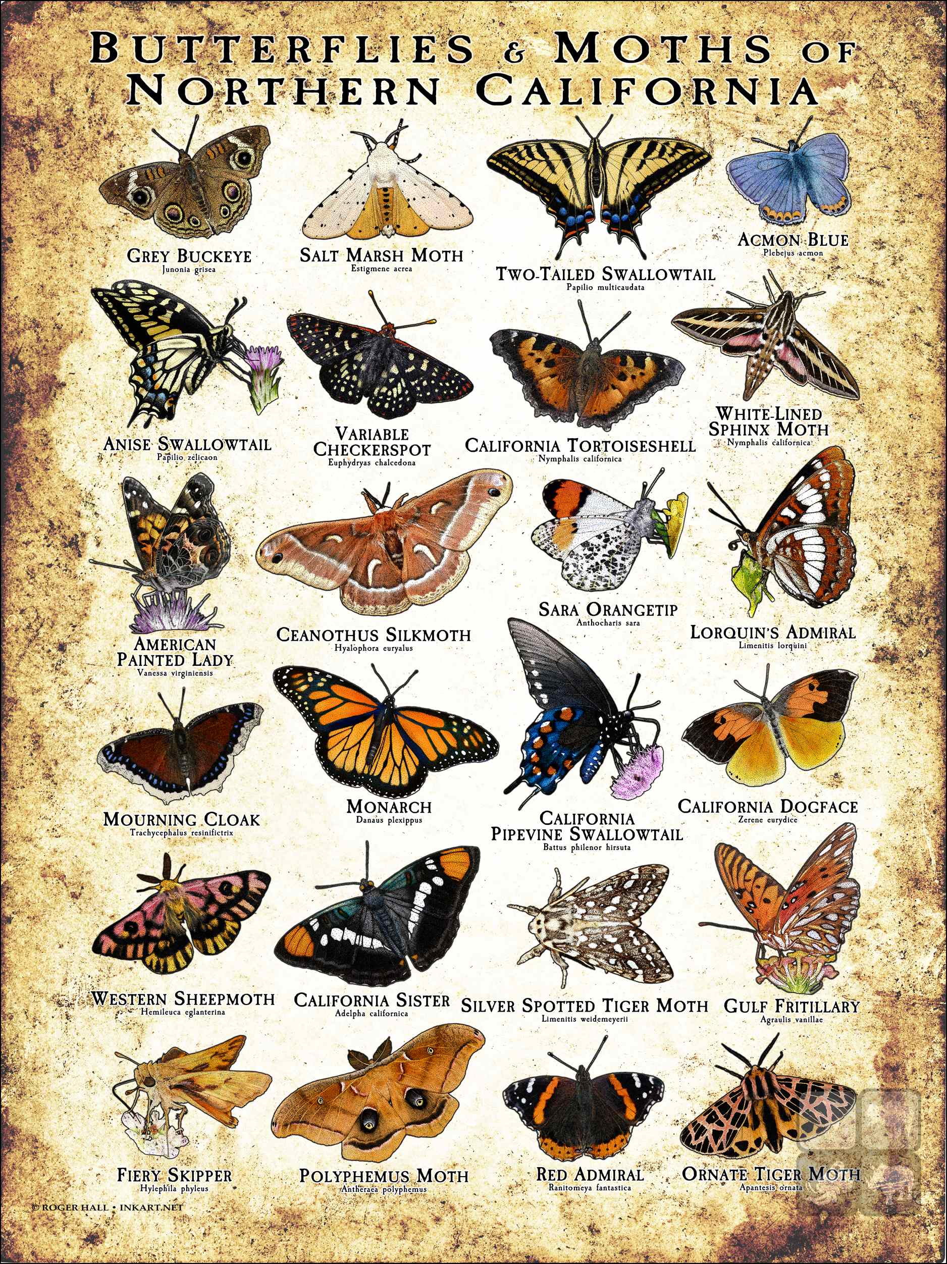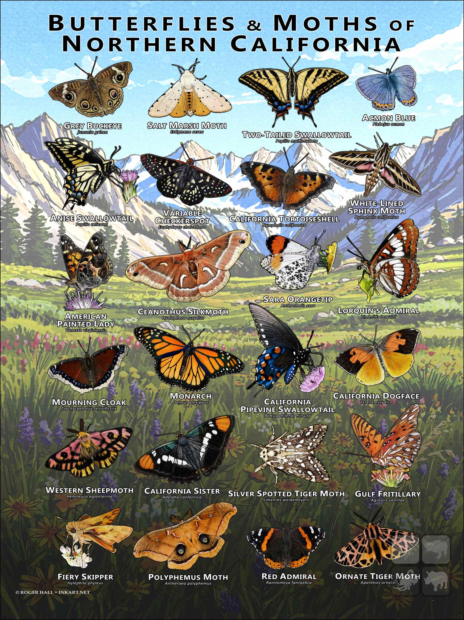 The vast forests, mountain ranges and coastal regions of Northern California has many different types of butterflies and moths raptors. Here are various native species printed on a colorful, high quality poster. All images are drawn beautifully and with amazing scientific accuracy.