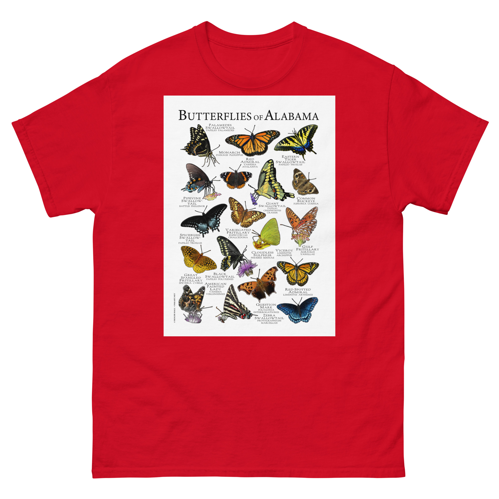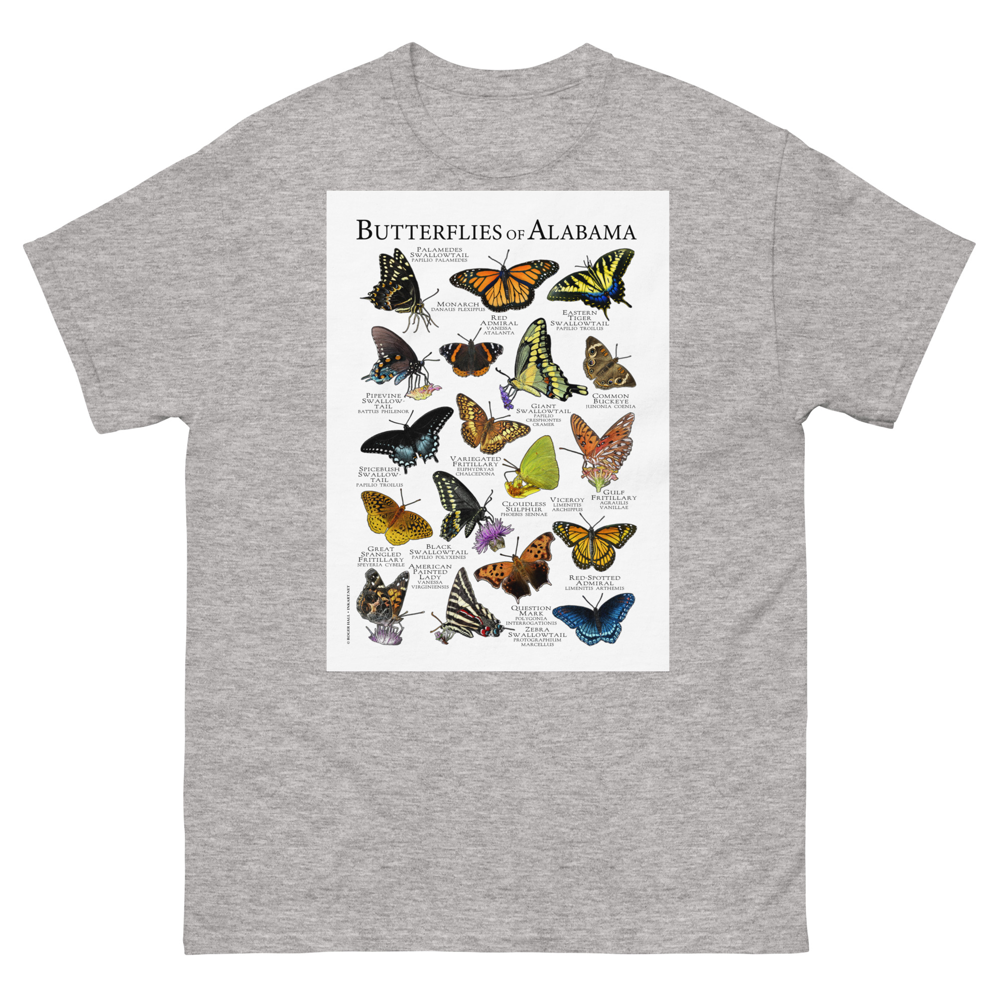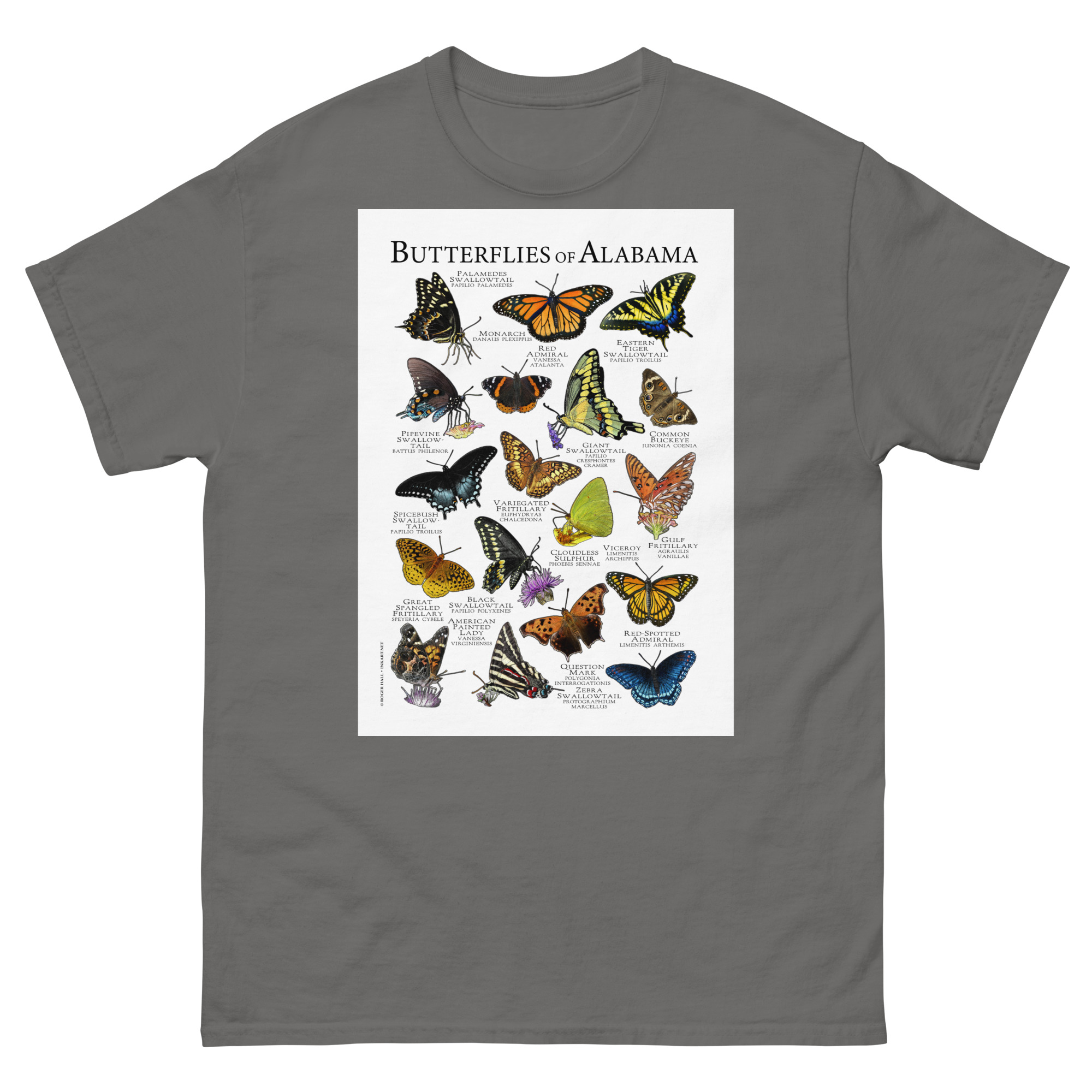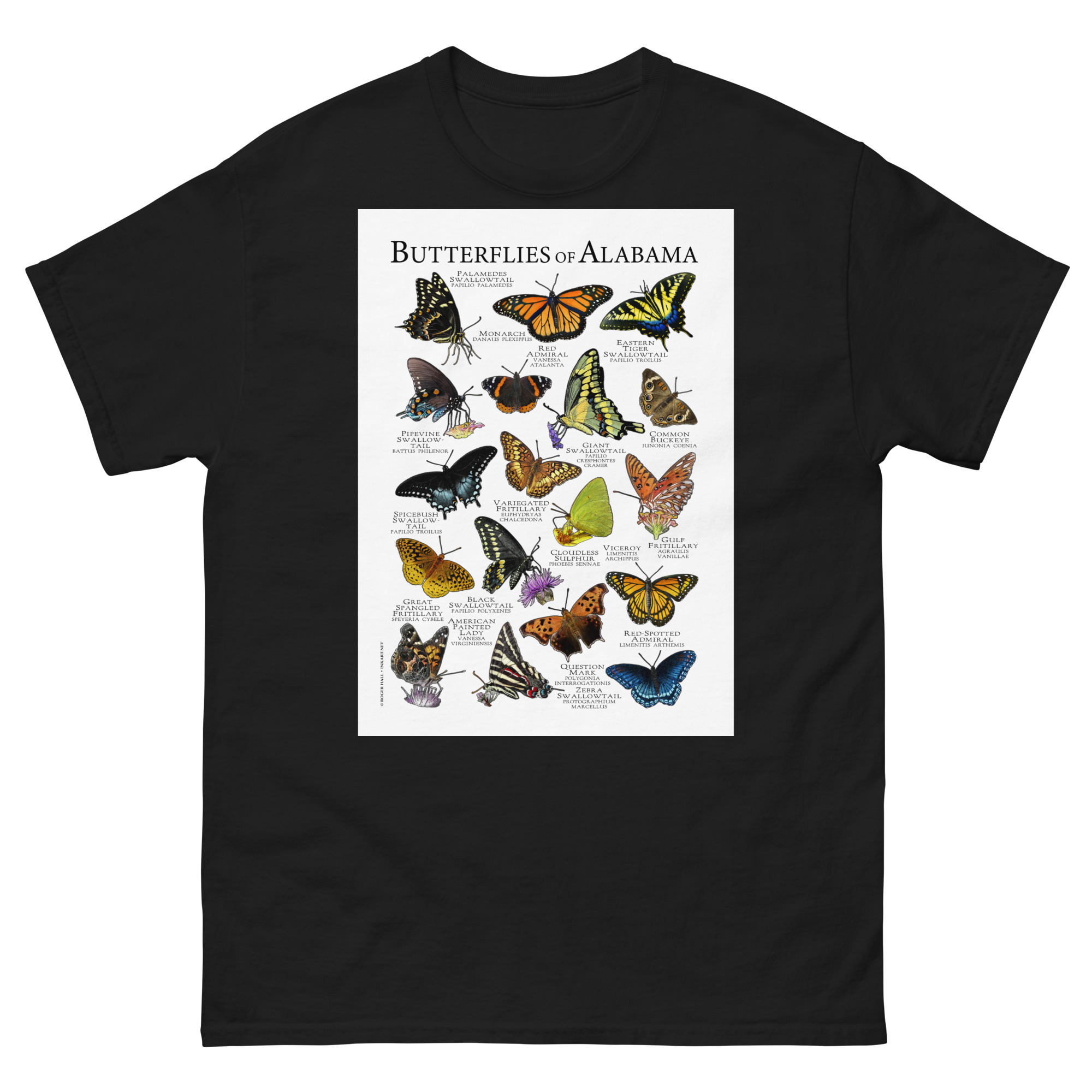 There are about 17,500 species of butterflies in the world, and around 750 species in the United States. This artwork features high-quality illustrations of the various species of butterfly native to the state of Alabama in the USA. The image is printed on a high-quality 100% men’s cotton t-shirt.