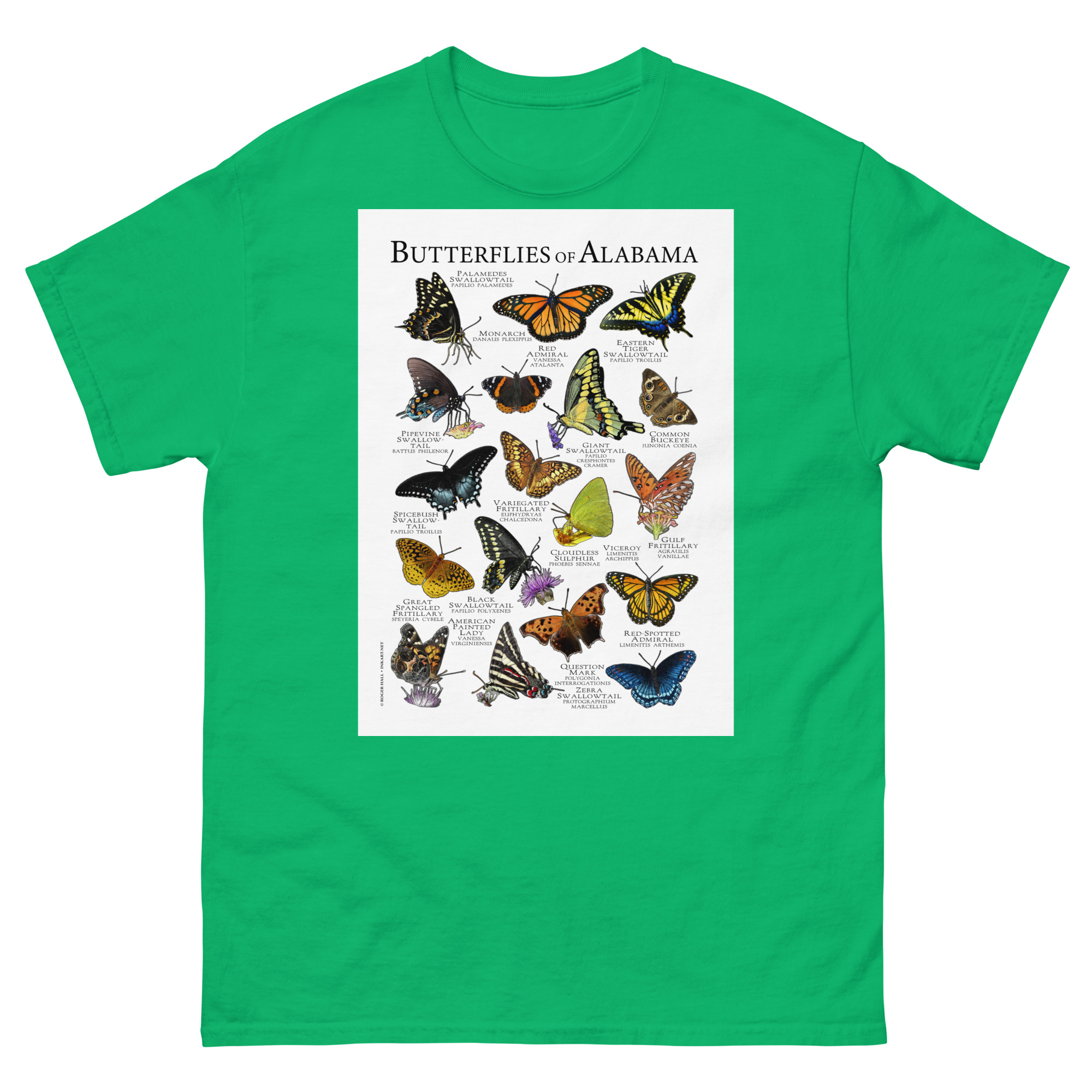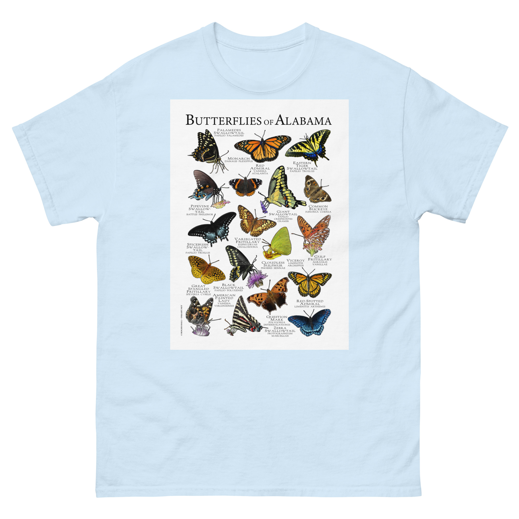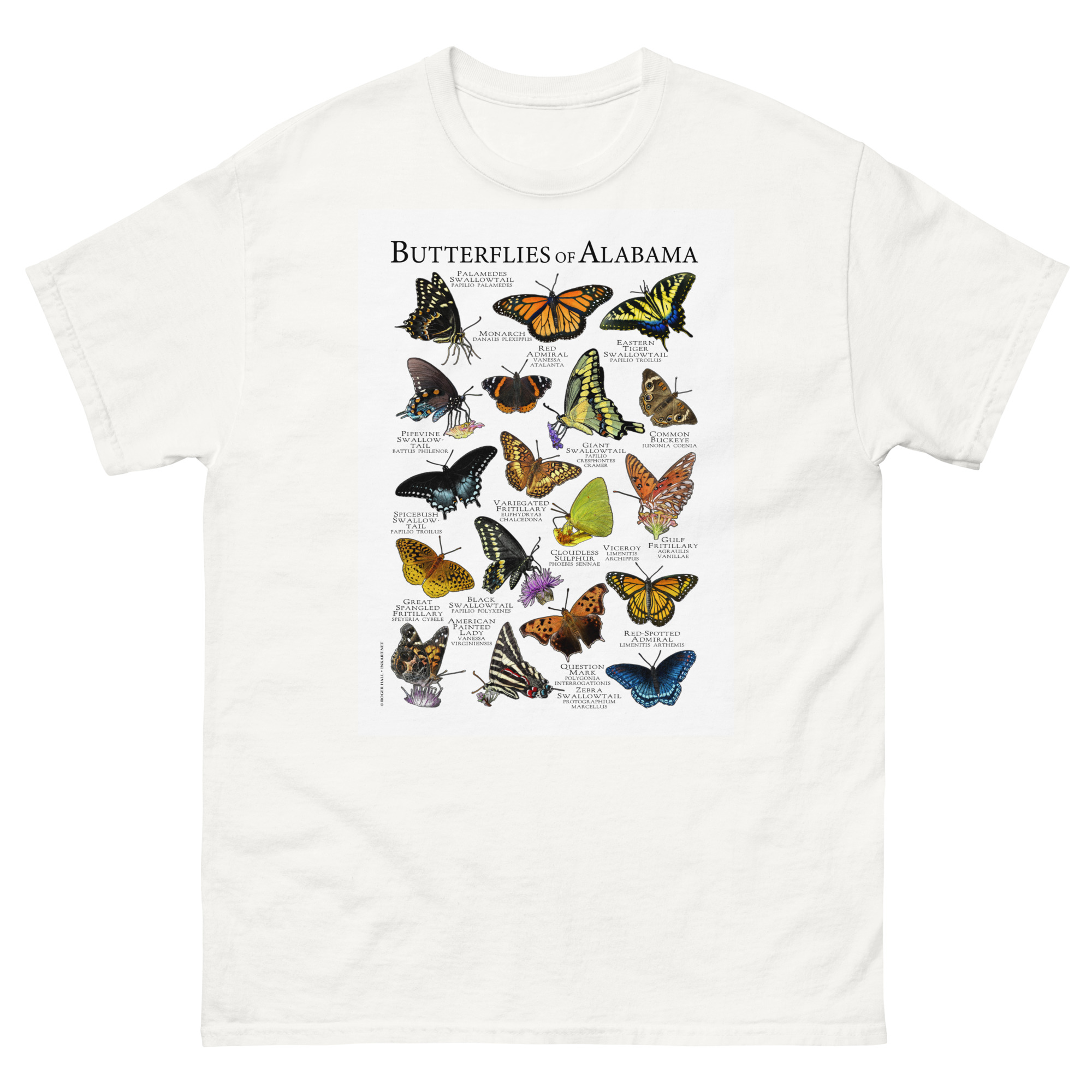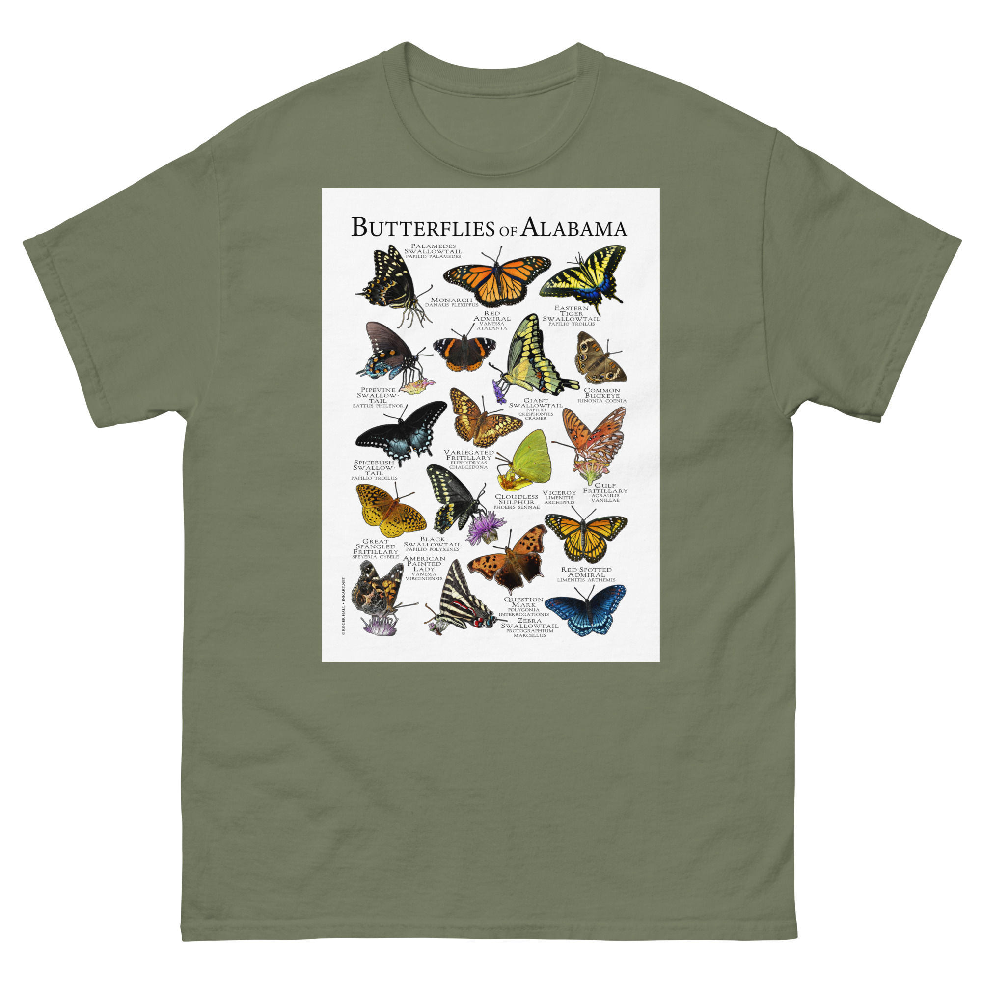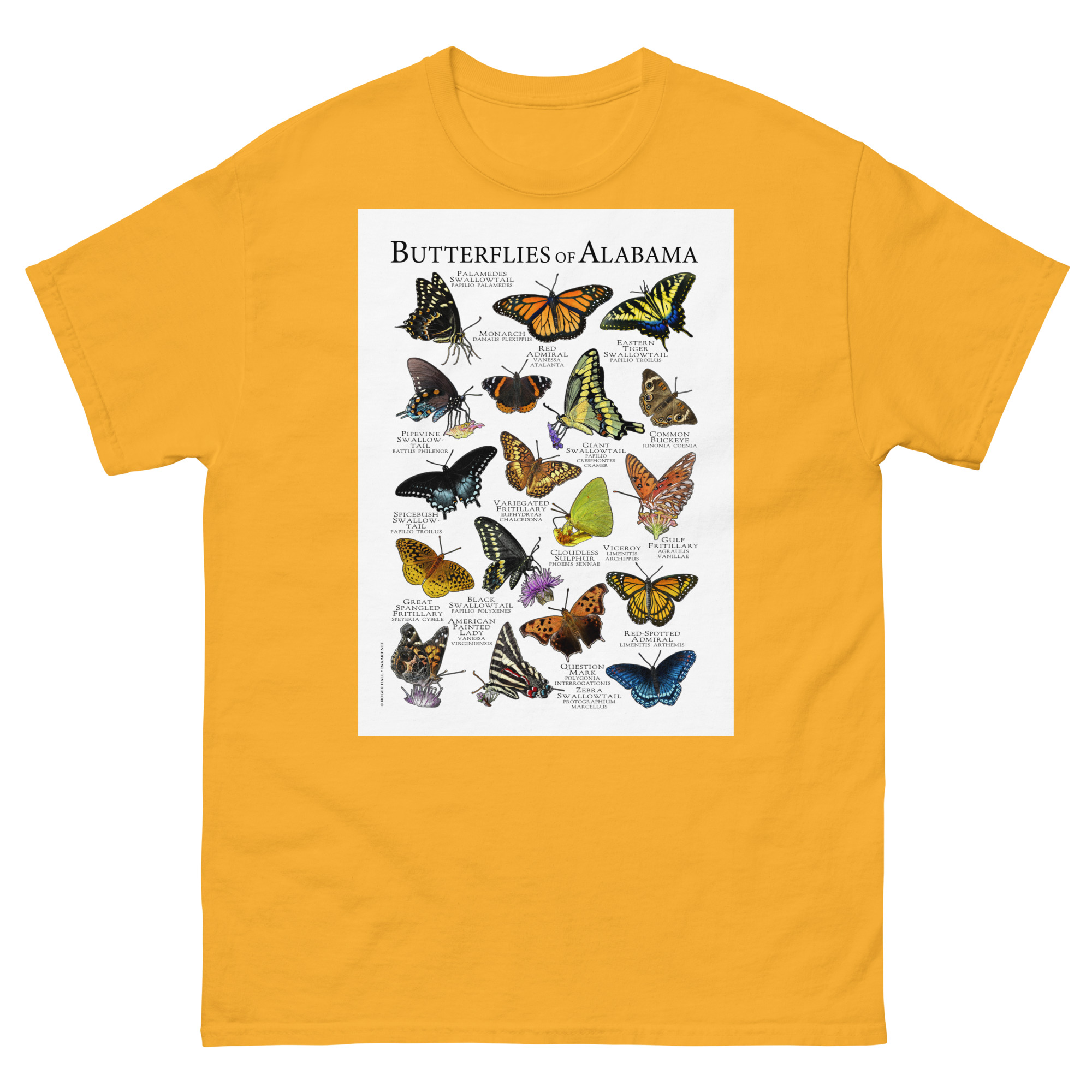 There are about 17,500 species of butterflies in the world, and around 750 species in the United States. This artwork features high-quality illustrations of the various species of butterfly native to the state of Alabama in the USA. The image is printed on a high-quality 100% men’s cotton t-shirt.
