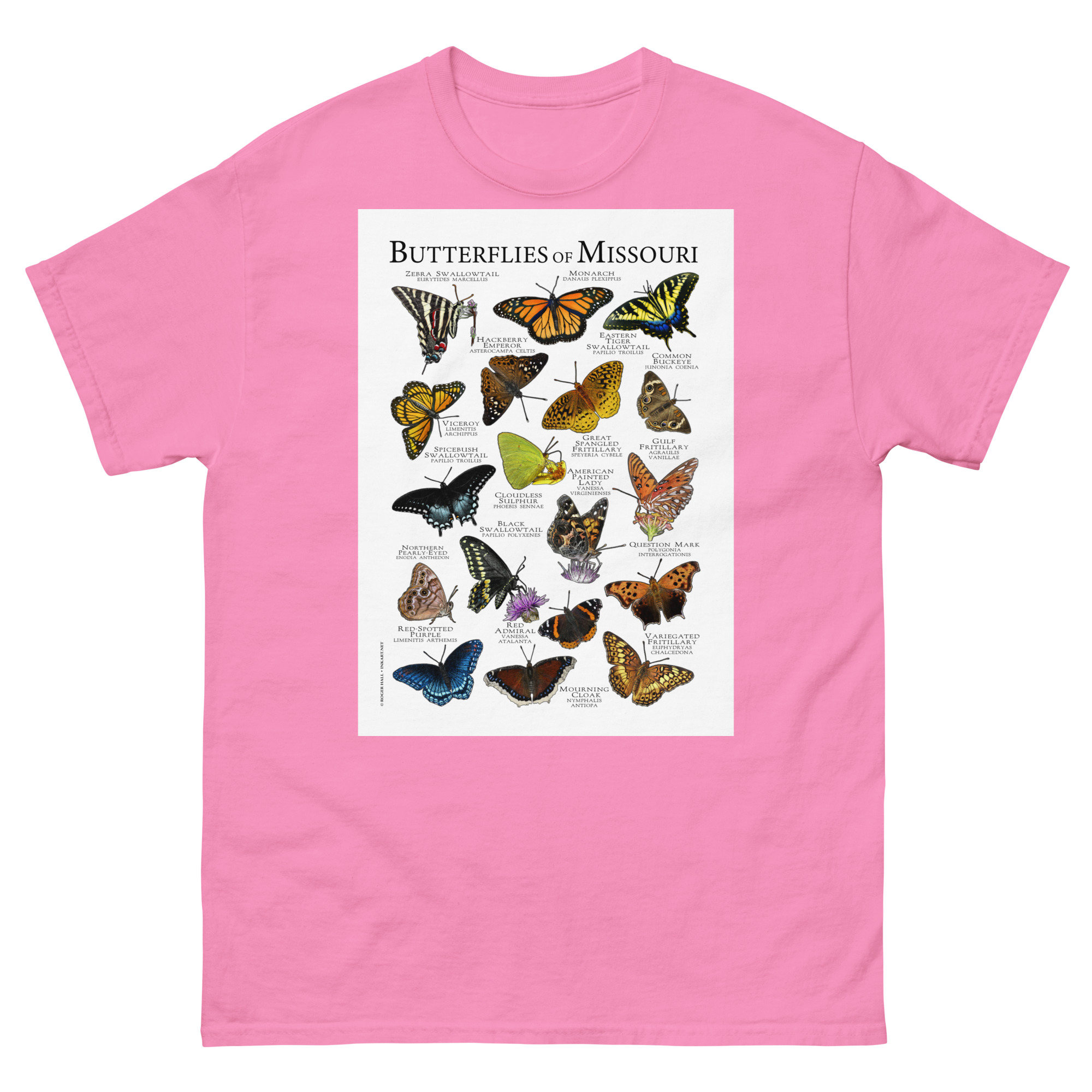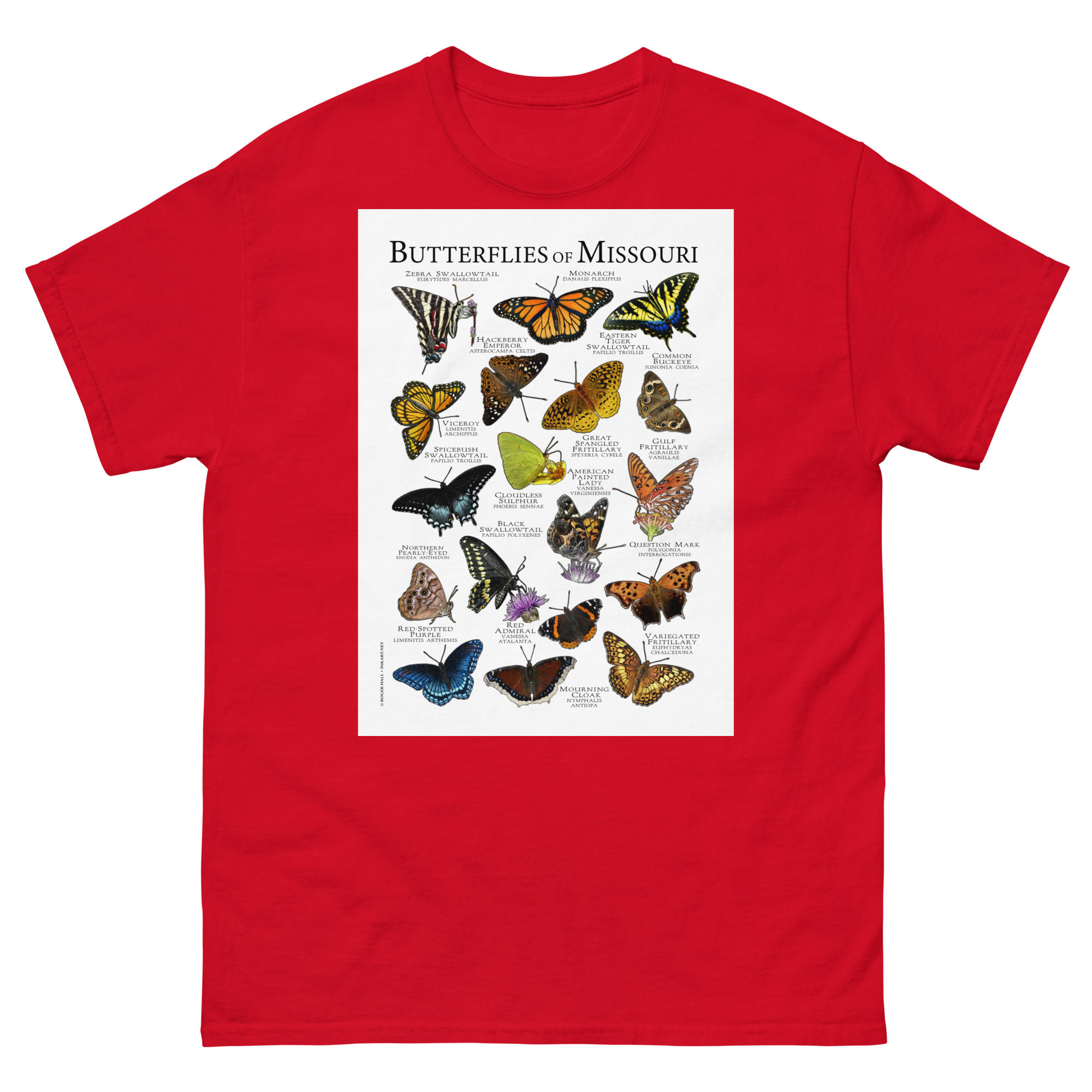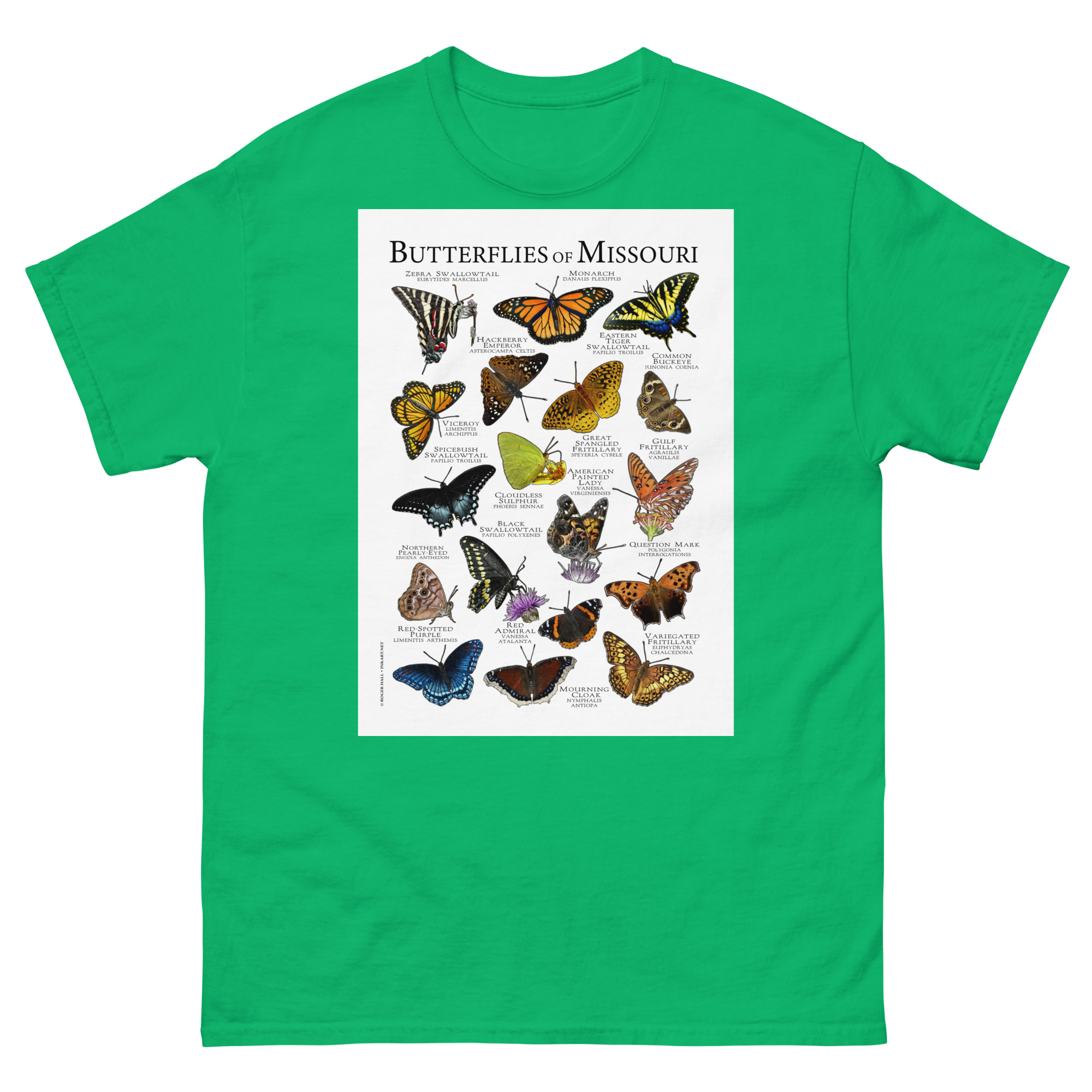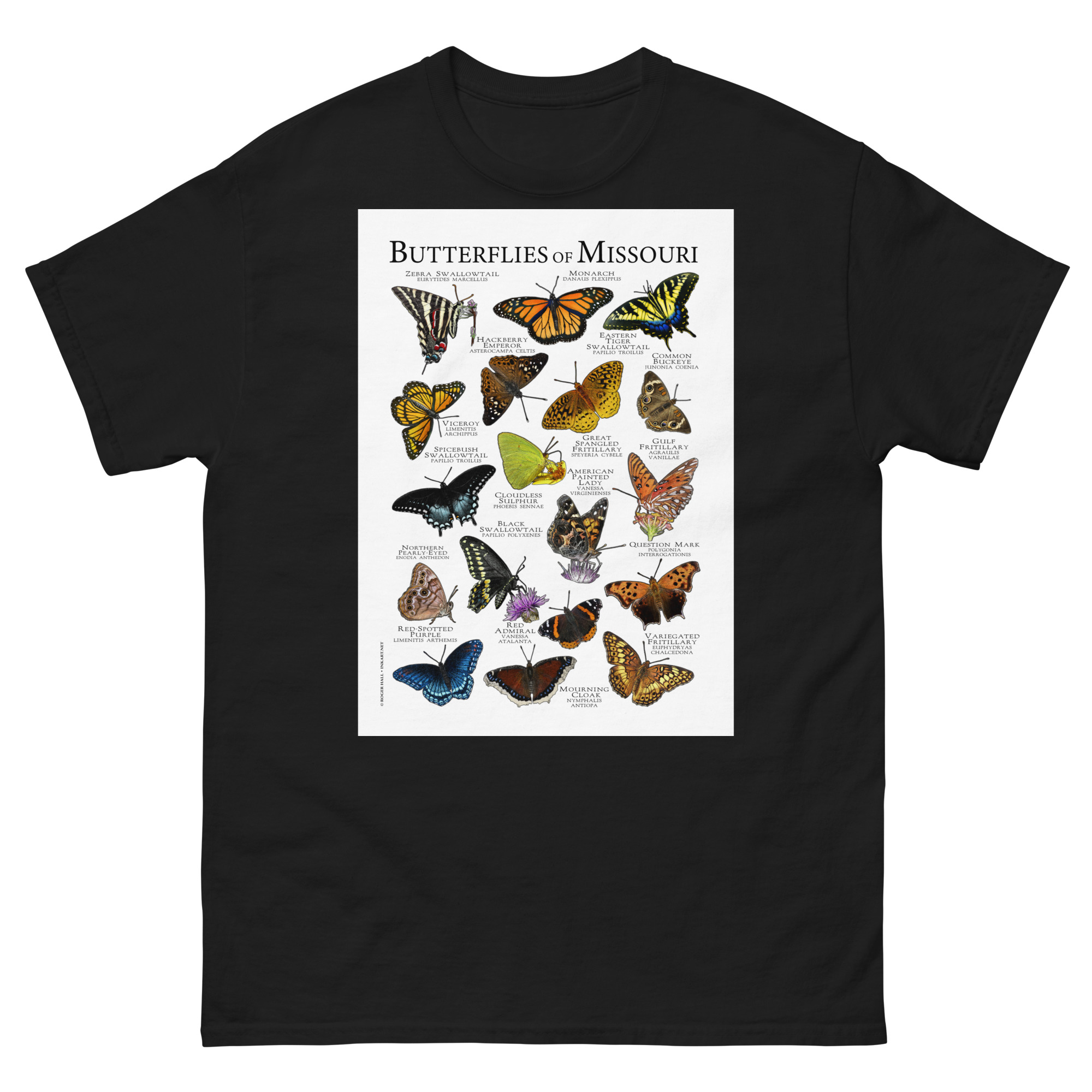 There are about 17,500 species of butterflies in the world, and around 750 species in the United States. This artwork features high-quality illustrations of the various species of butterfly native to the state of Missouri in the USA. The image is printed on a high-quality 100% men’s cotton t-shirt.