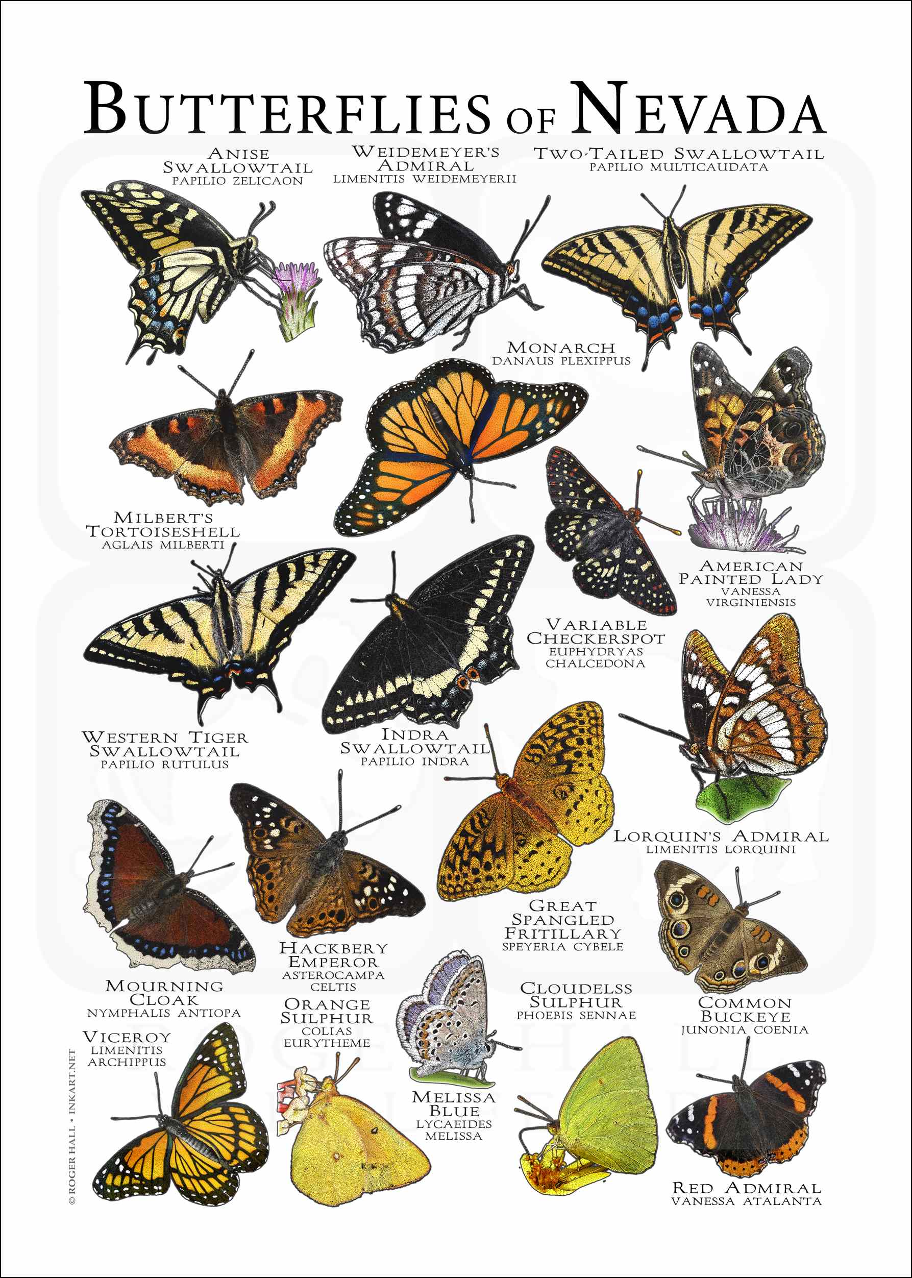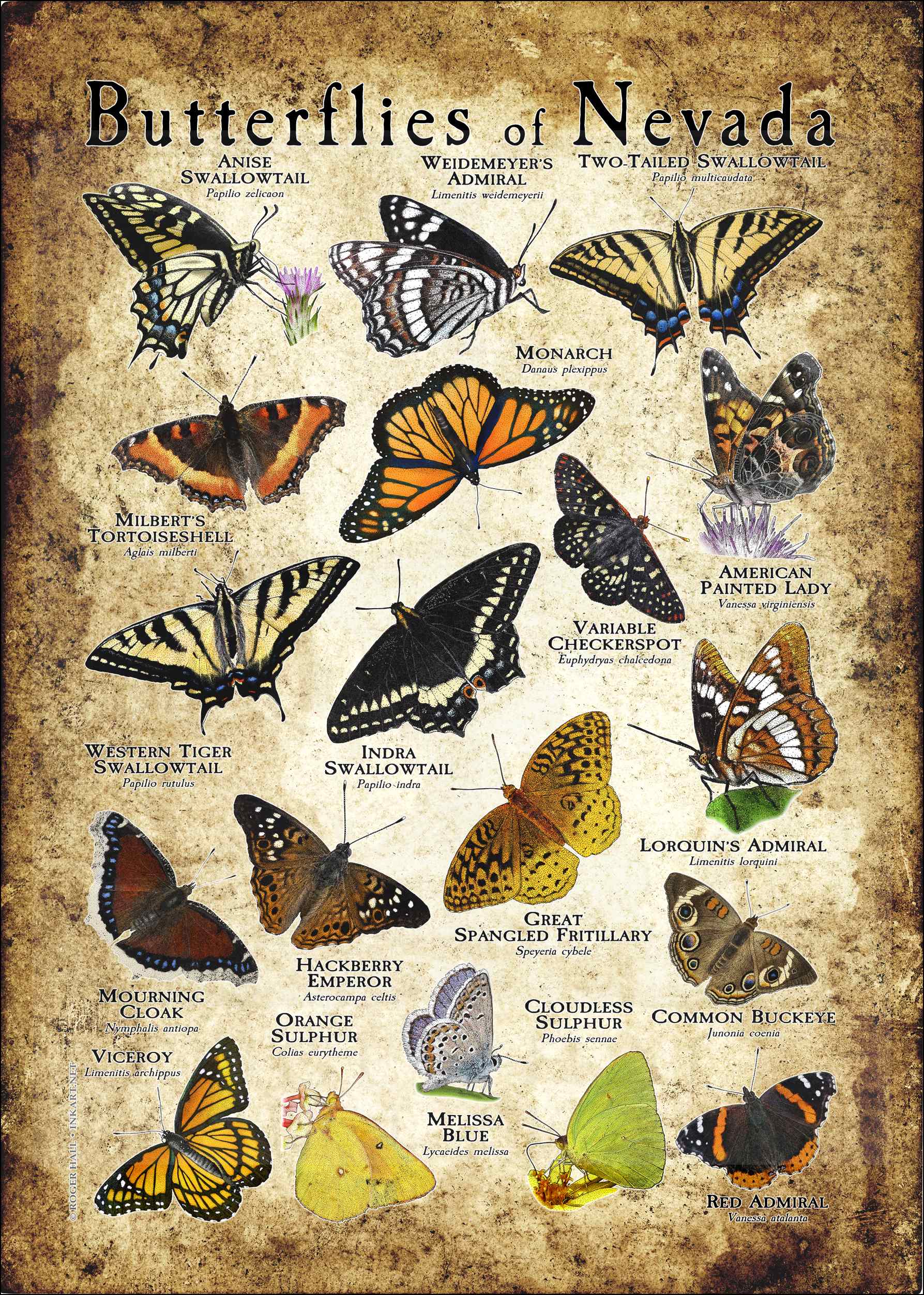A colorful collage of scientifically accurate illustration of various species of butterflies native to Nevada. The layout features several species, including some of the states most beautiful butterflies.