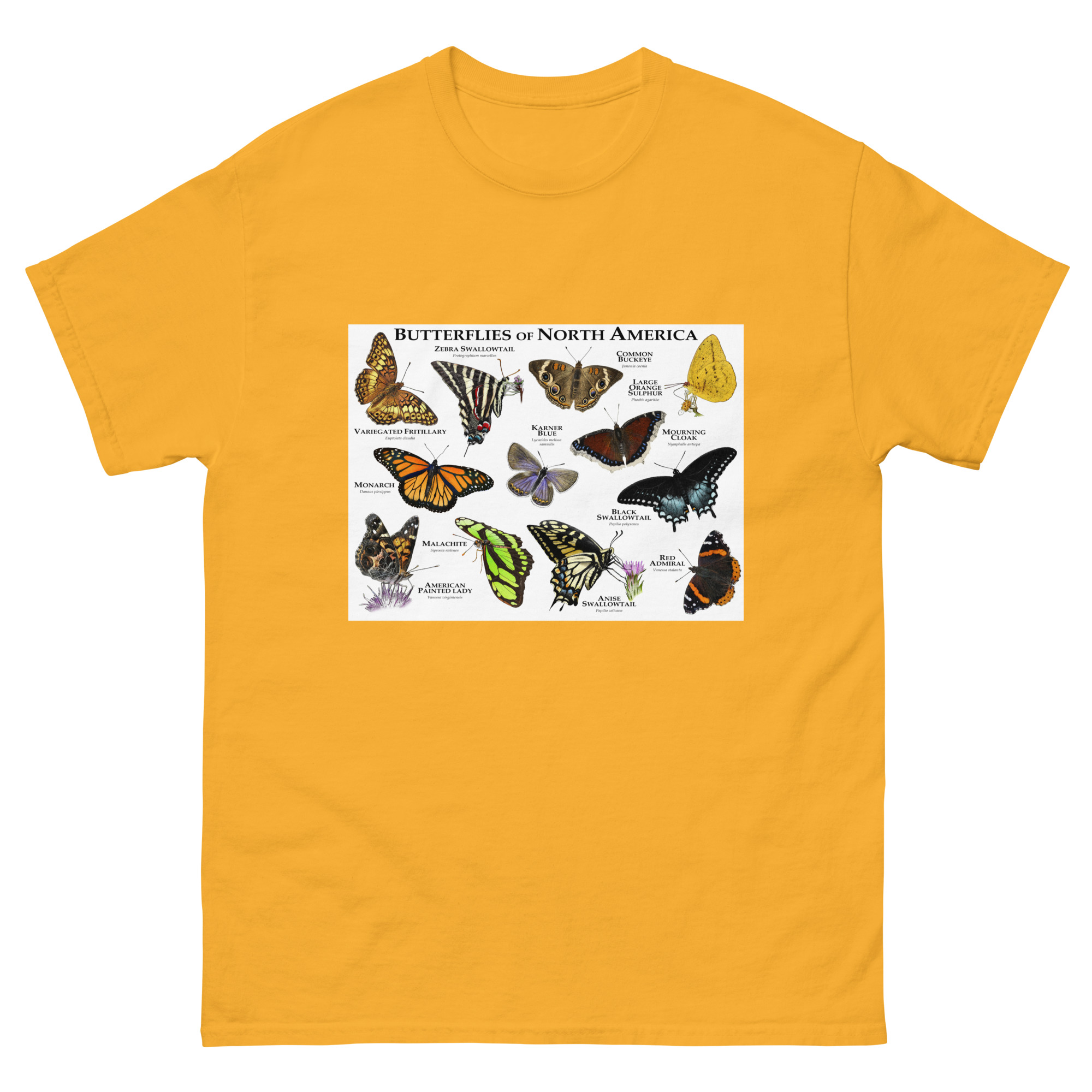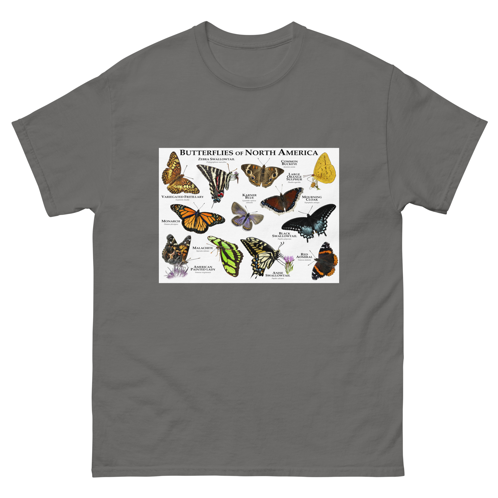 There are roughly 20,000 species of butterflies in the world. Of these, around 600 species are found in Canada and the United States. The image features some of the more commonly encountered species of butterfly printed on a high-quality t-shirt.