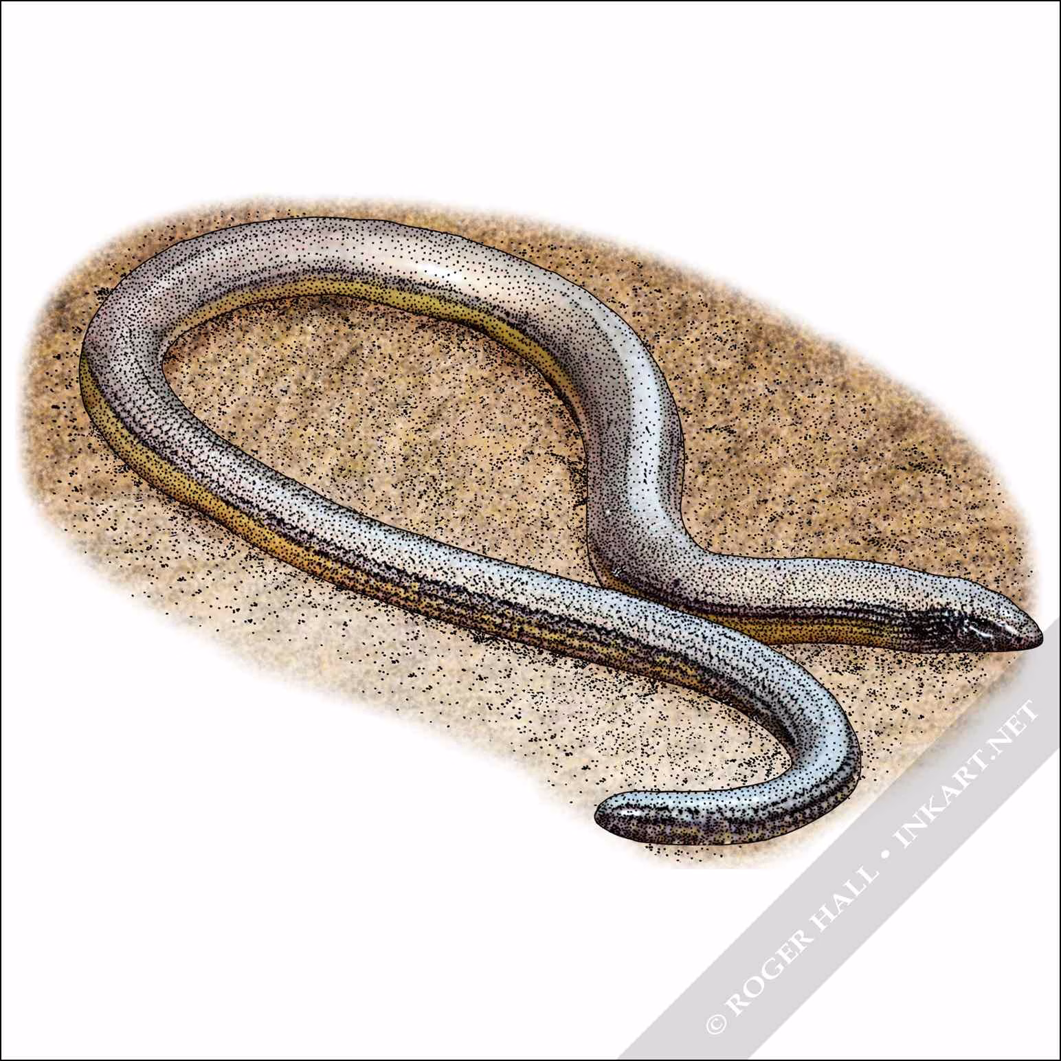 Fine art illustration of a California Legless Lizard (Anniella pulchra.) The illustration is available in black and white or color.