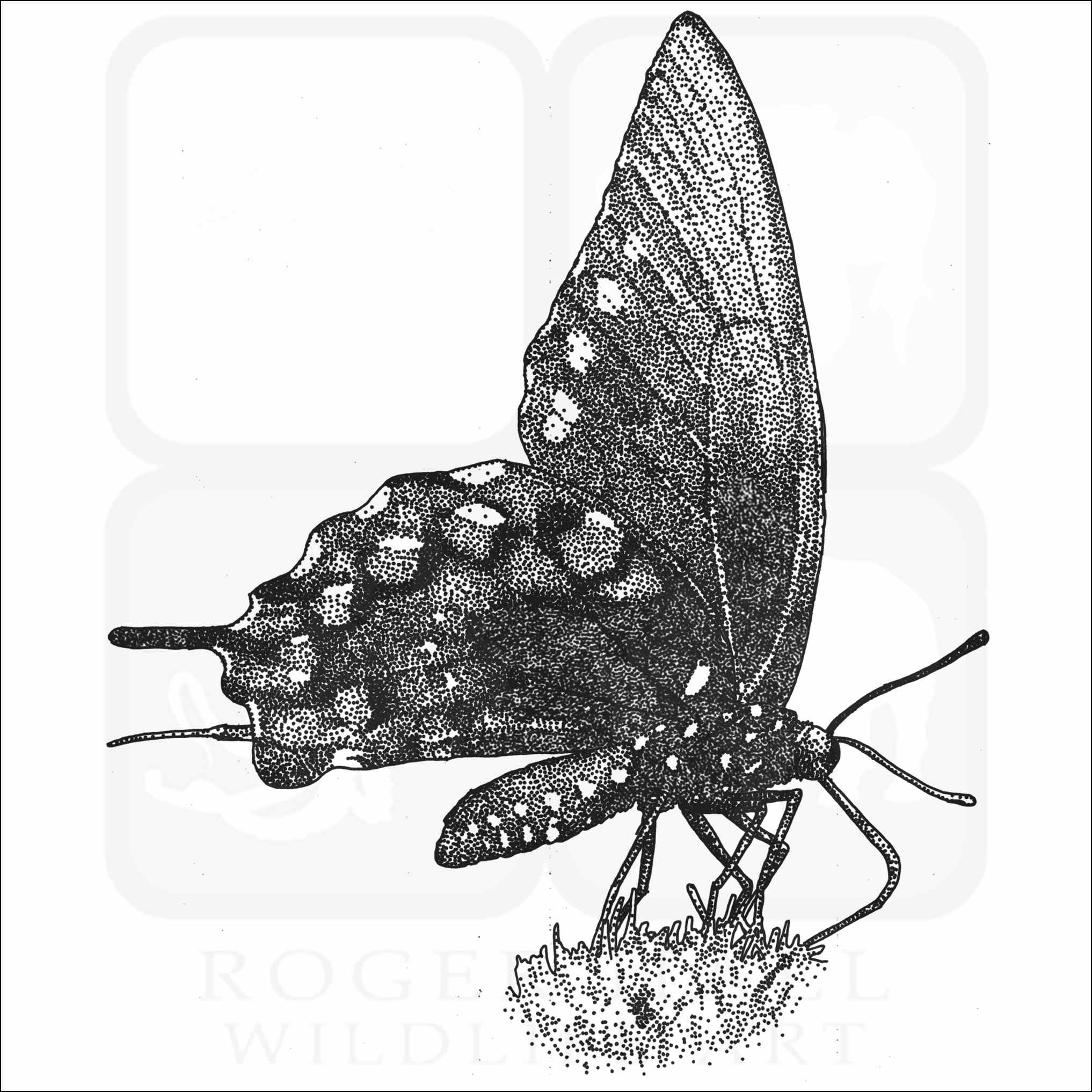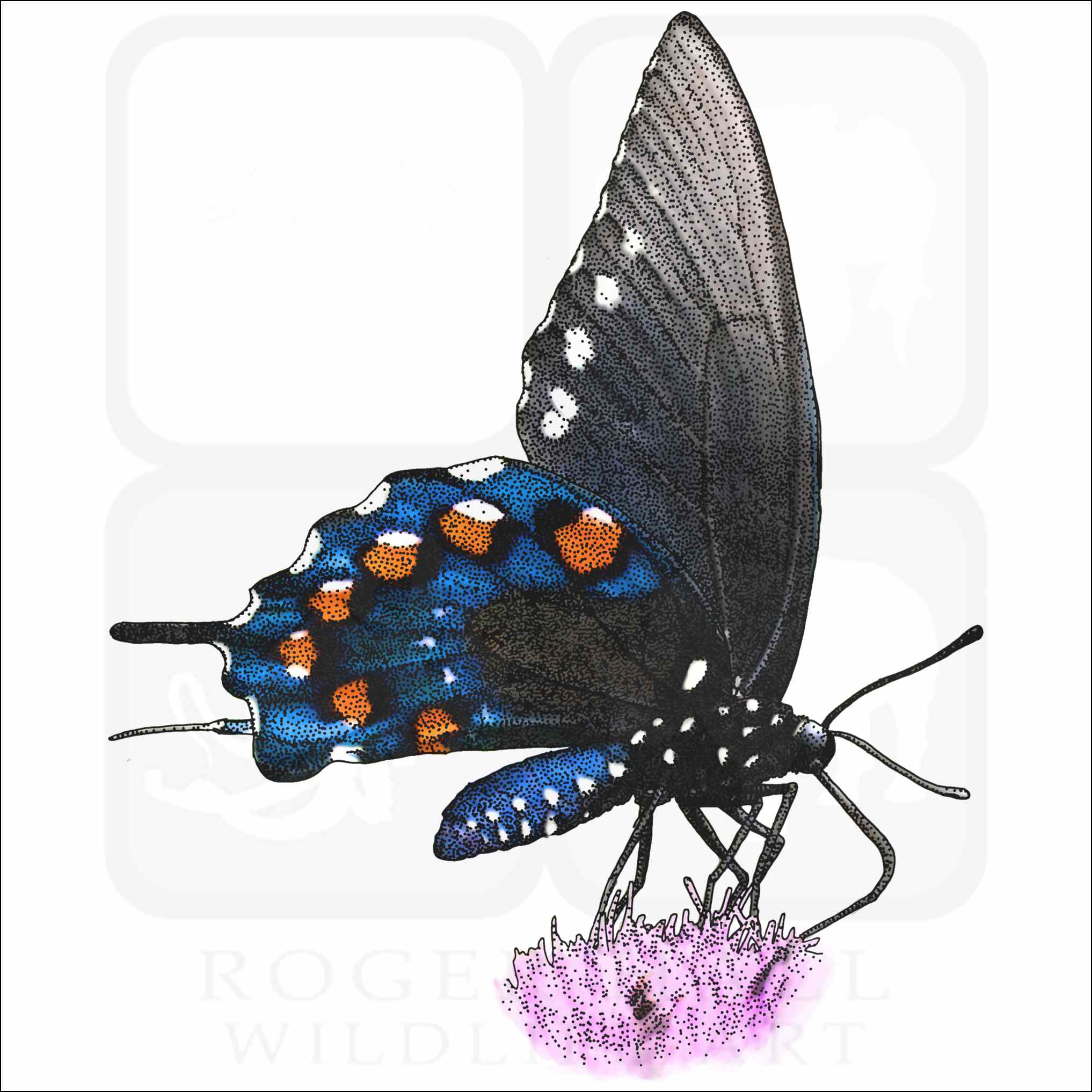 Fine art illustration of a California Pipevine Swallowtail Butterfly (Battus philenor hirsuta.) The illustration is available in black and white or color.