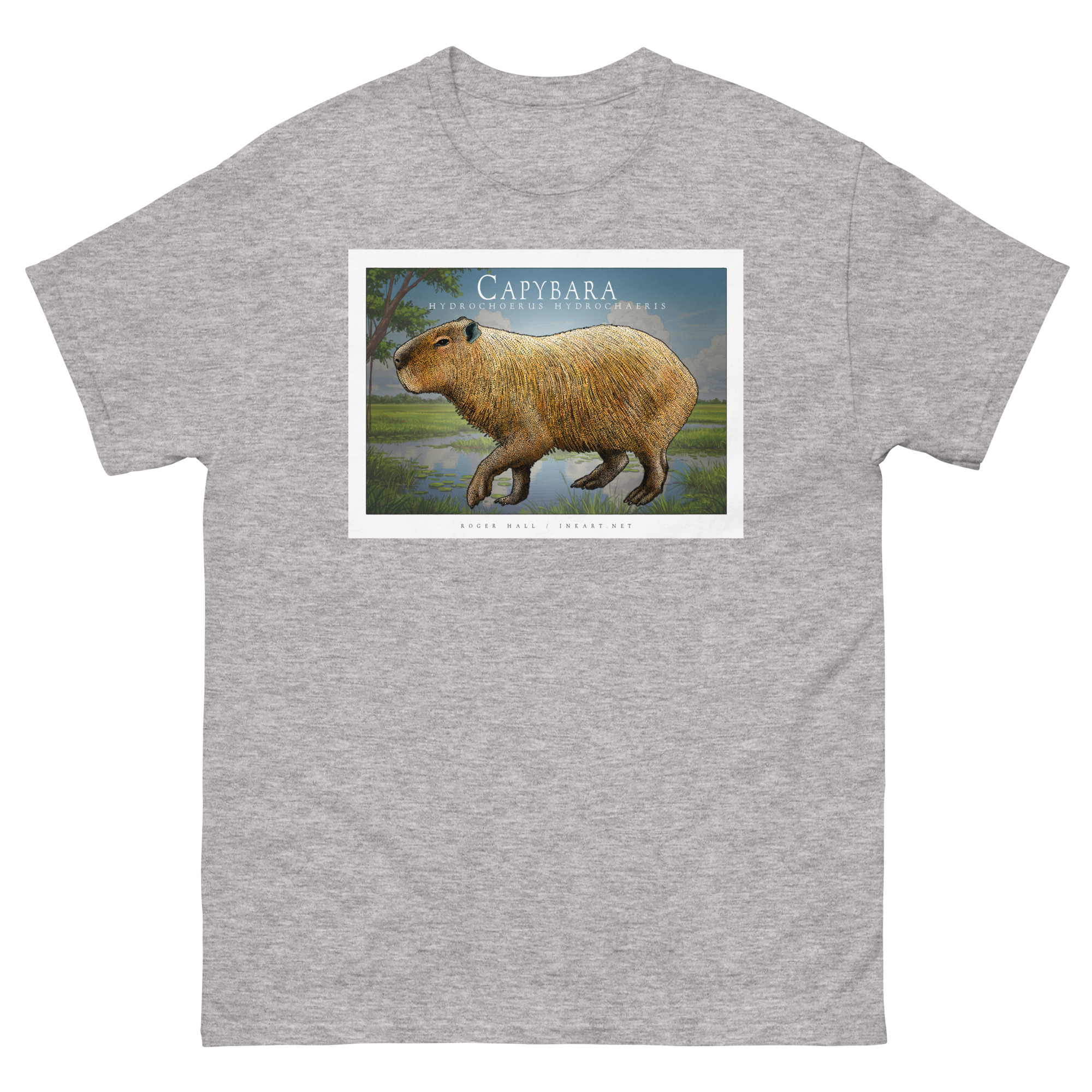 Scientifically accurate drawing of a Capybara (Hydrochoerus hydrochaeris.) The illustration of a printed on a high-quality 100% unisex cotton t-shirt.