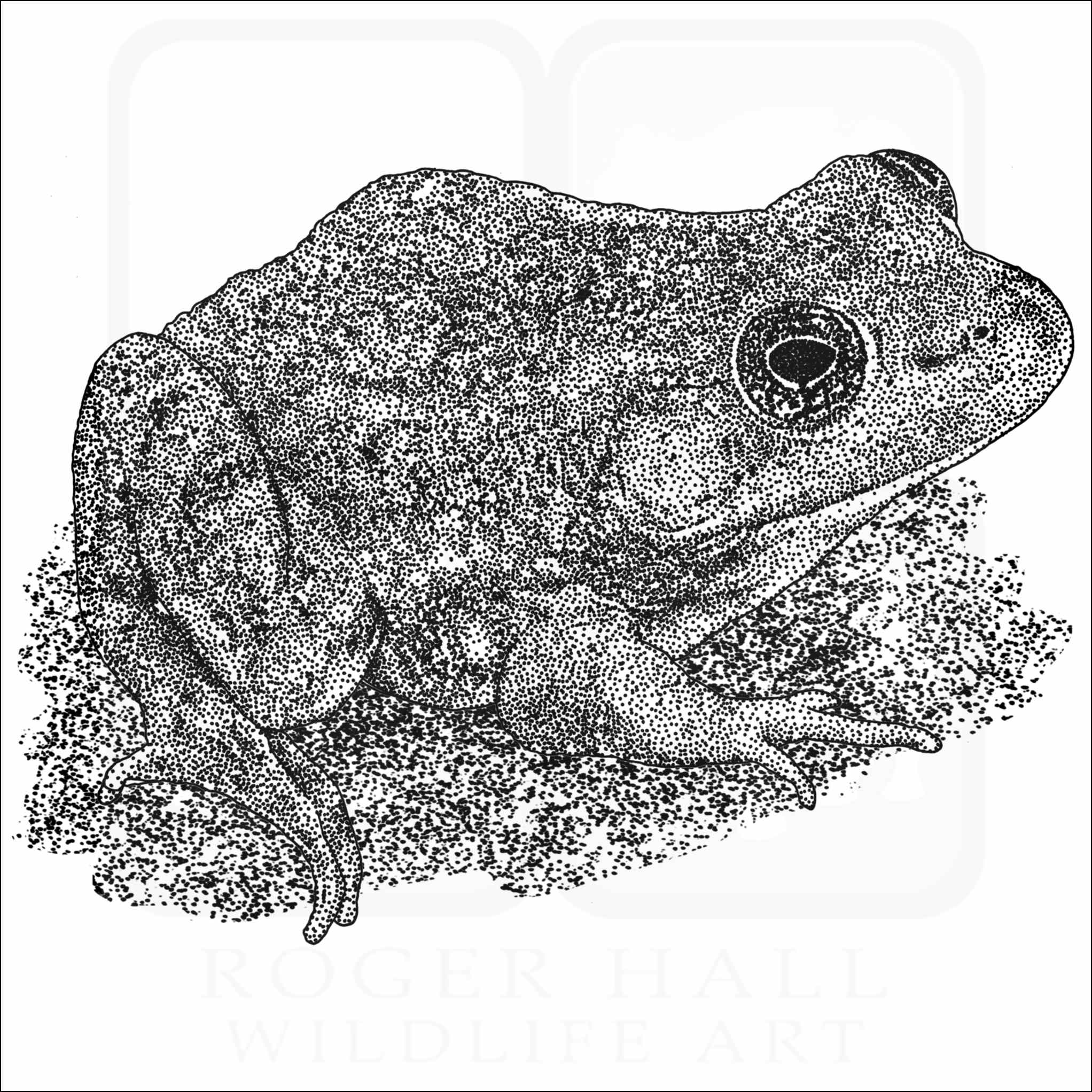 Fine art illustration of a Carpenter Frog (Rana virgatipes.) The illustration is available in black and white or color.