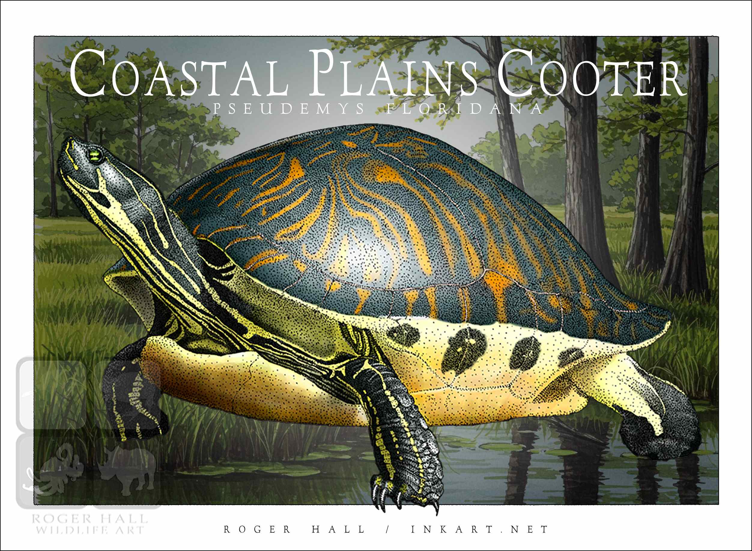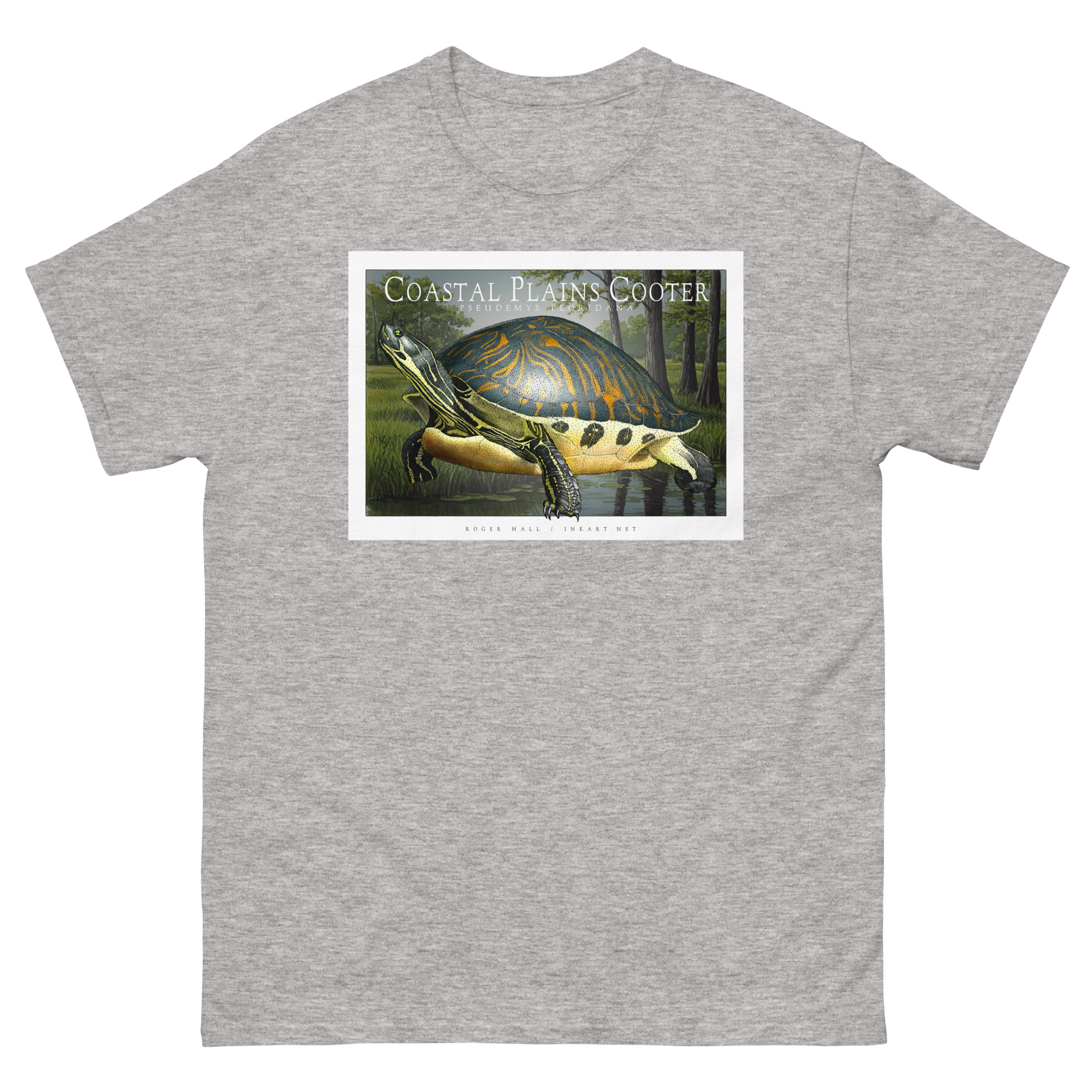 Scientifically accurate drawing of a Coastal Plains or Florida Cooter (Pseudemys floridana.) The illustration of a printed on a high-quality 100% unisex cotton t-shirt.