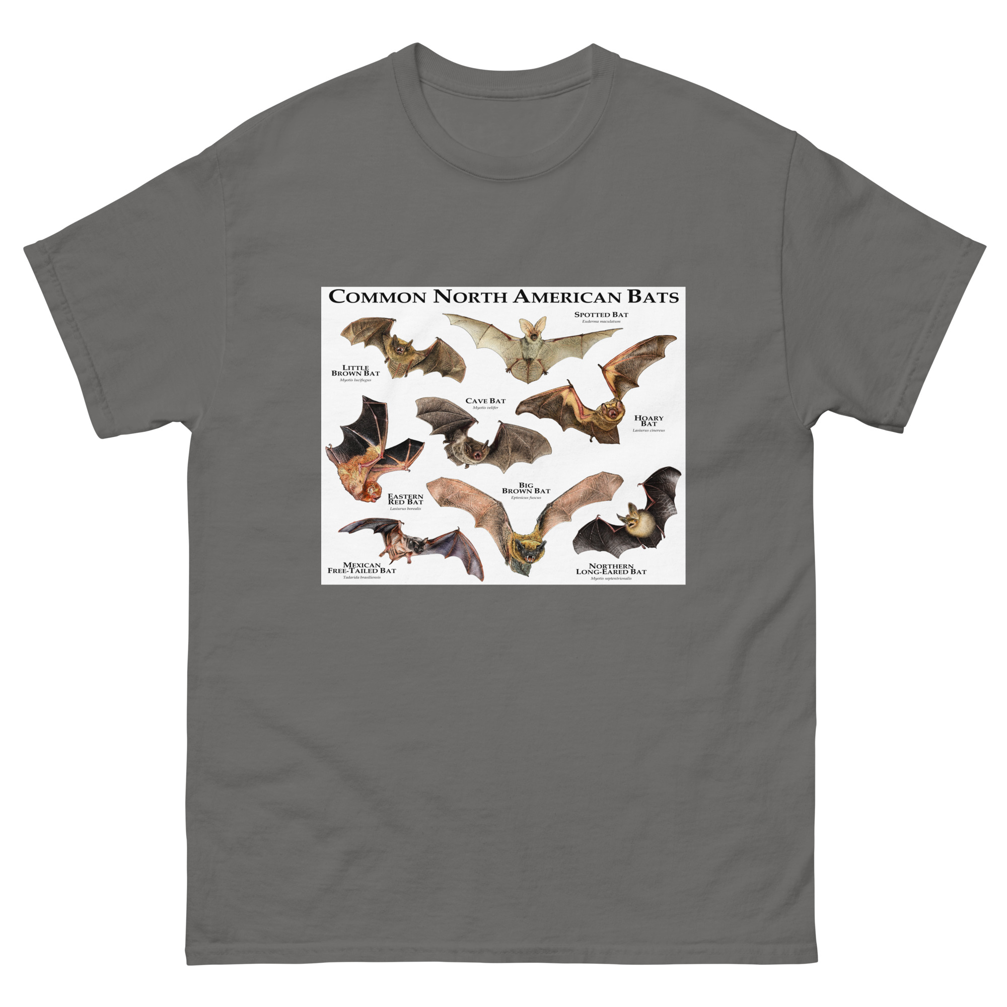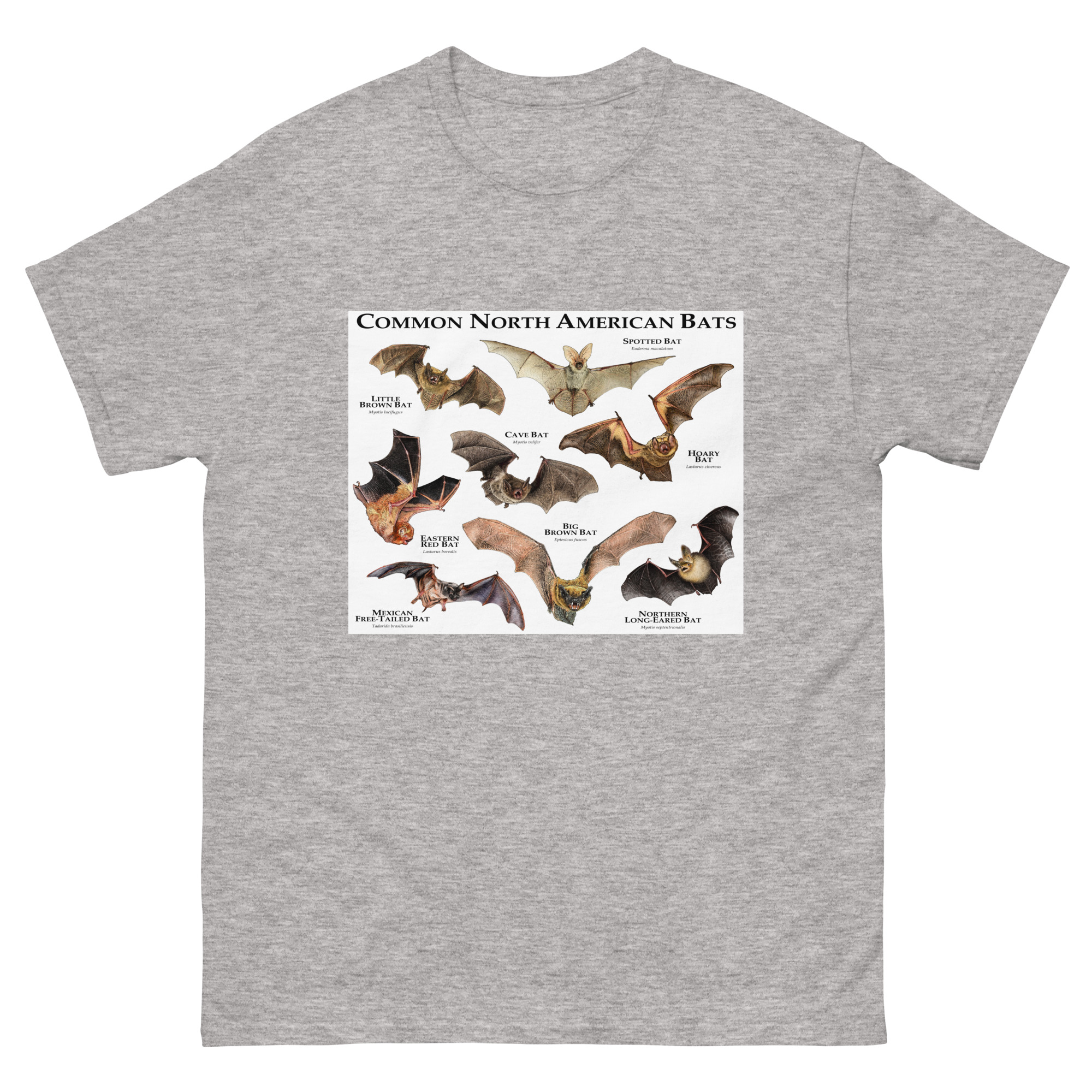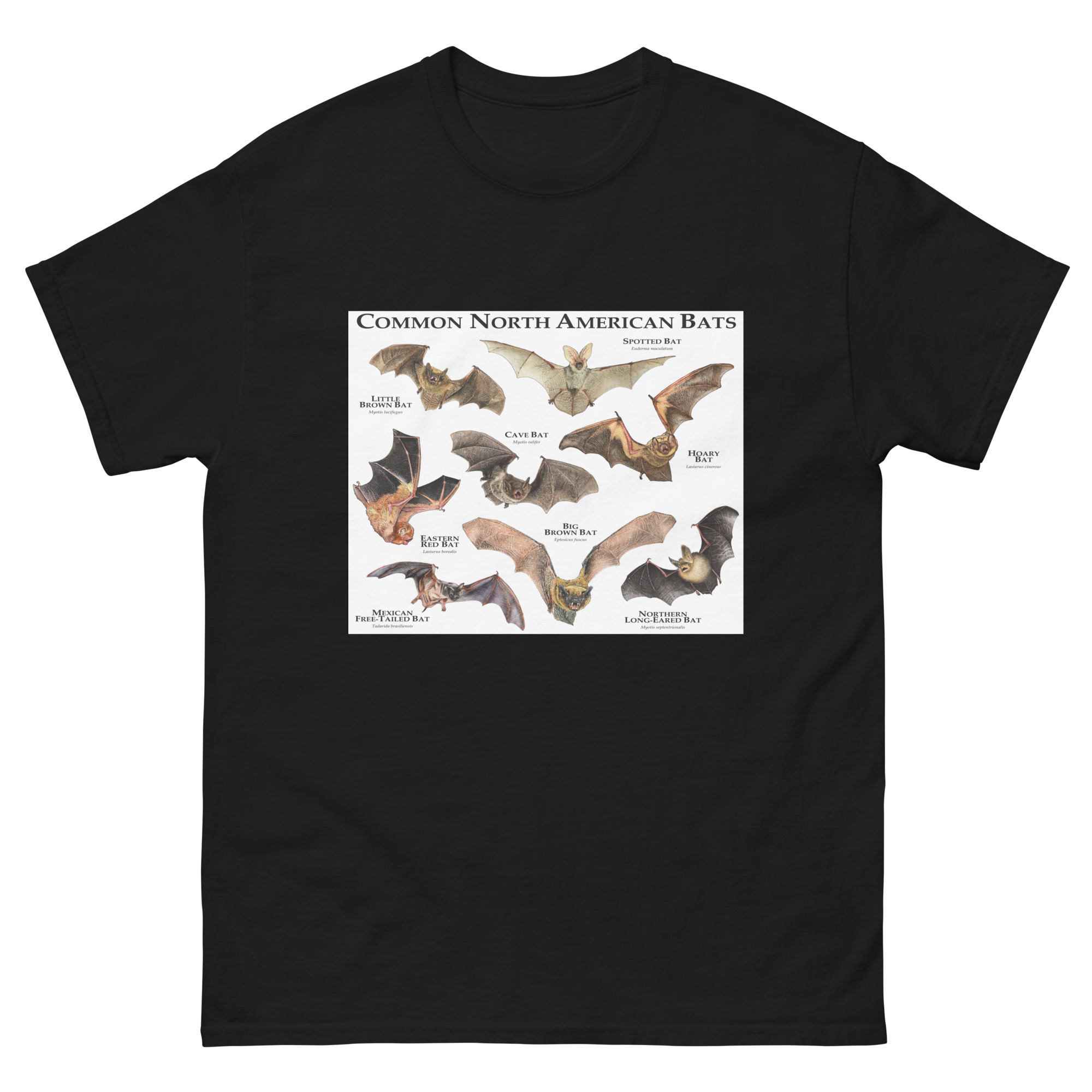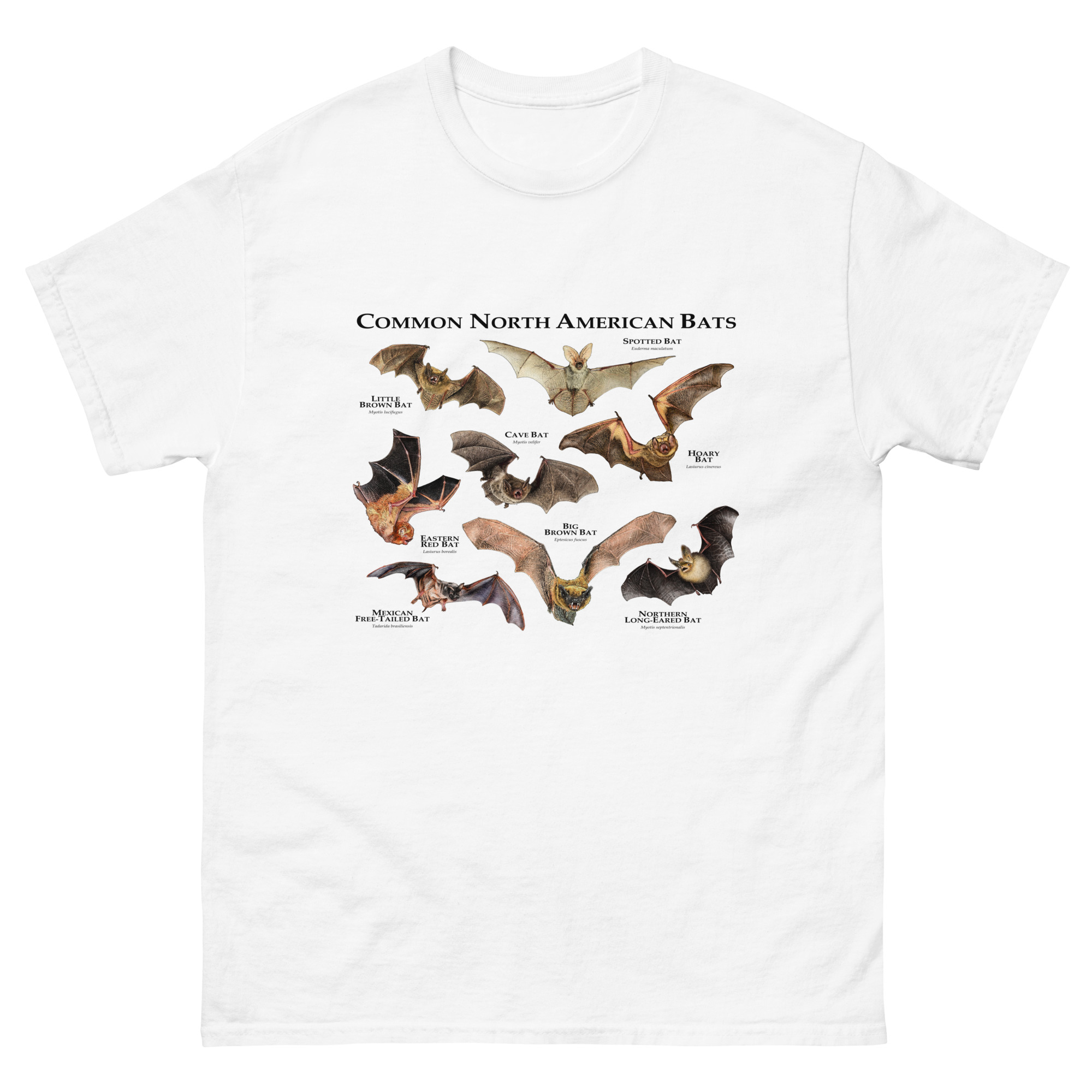 There are over 1,400 species of bats in the world today. These flying mammals can be found on nearly every part of the planet except in extreme deserts and polar regions. Most of the populations are found in near the equator in tropical forests. This image print features fine art illustrations of various species of the 32 bats native to North America printed on a high-quality t-shirt.