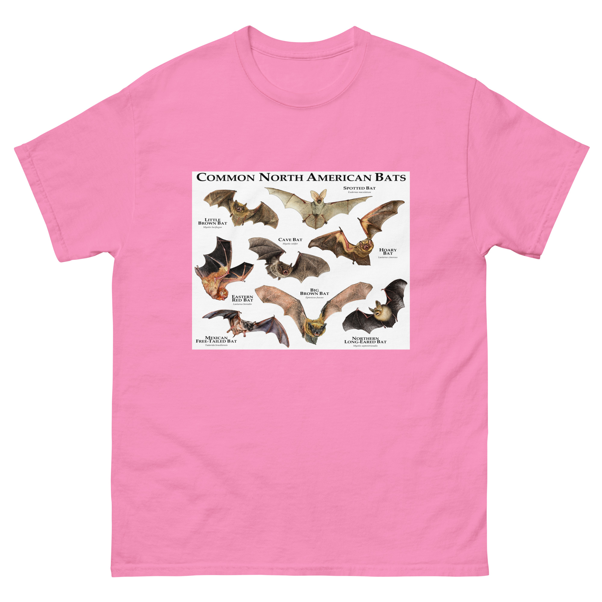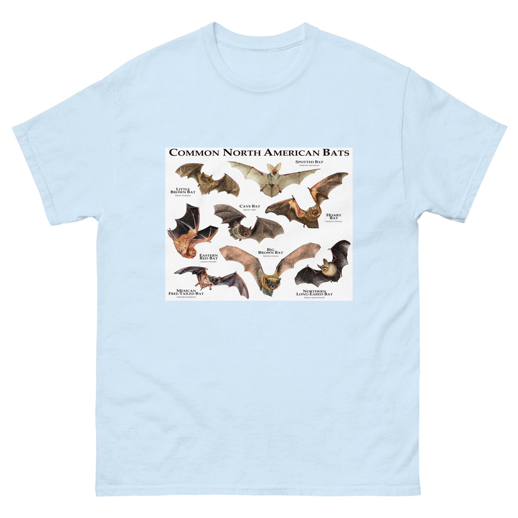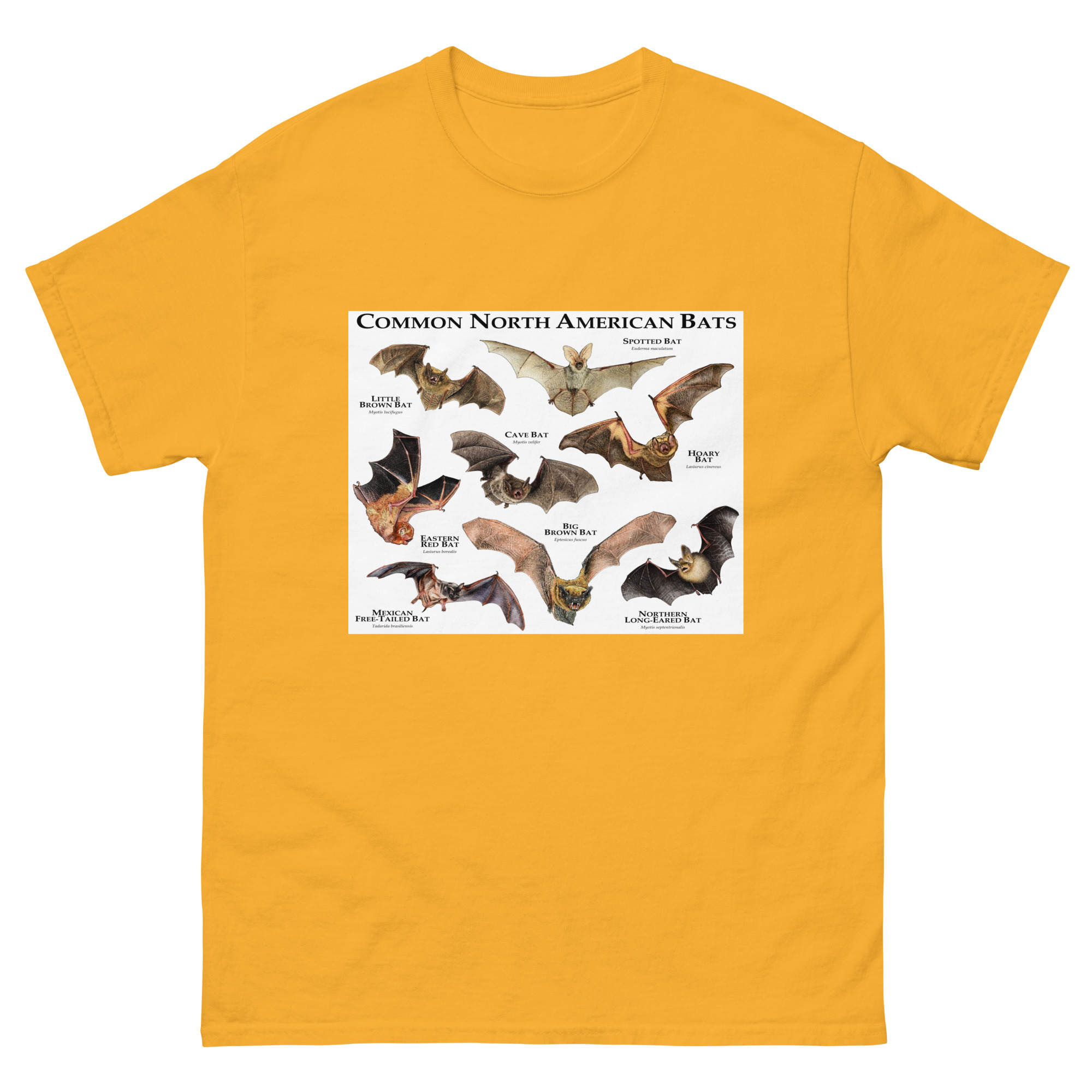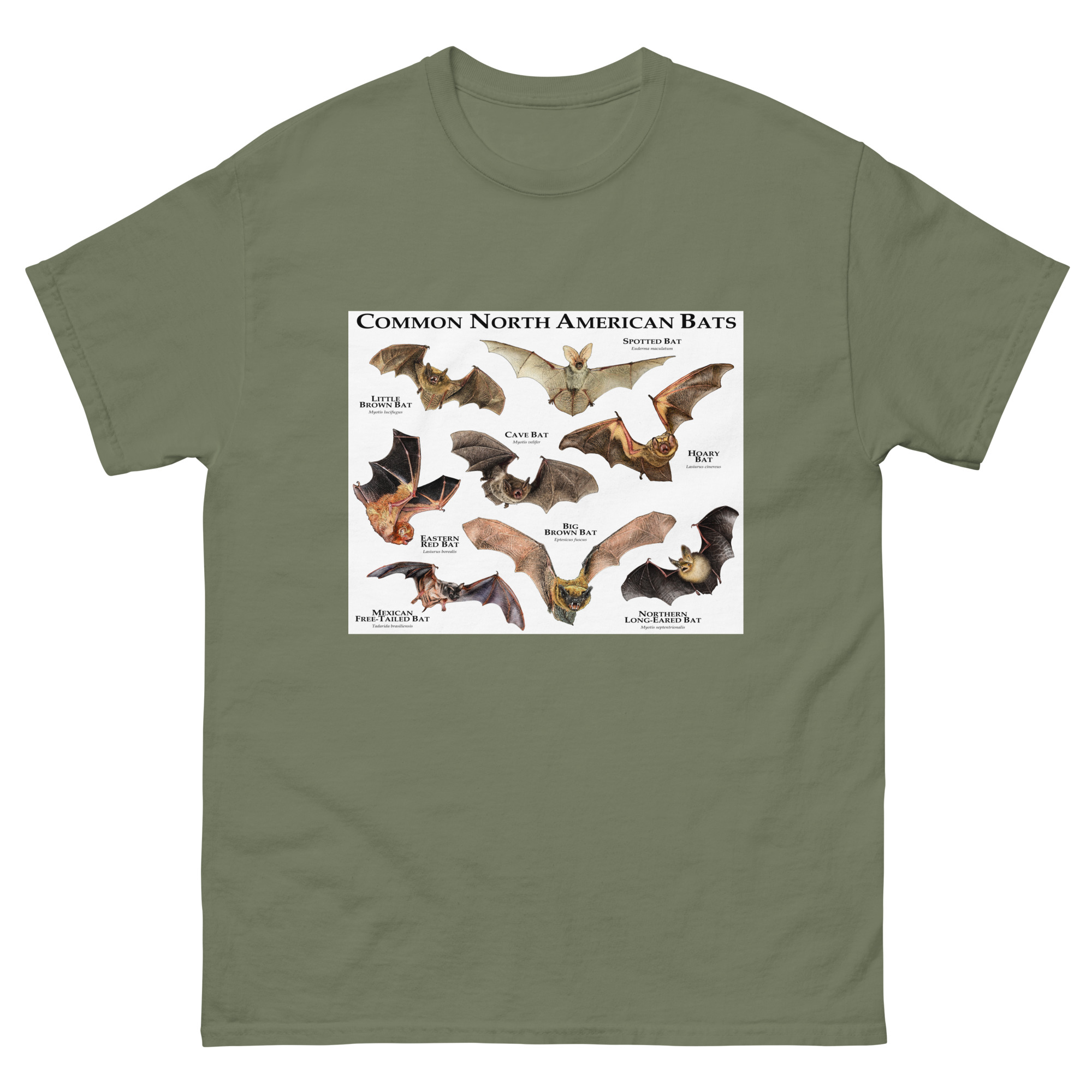There are over 1,400 species of bats in the world today. These flying mammals can be found on nearly every part of the planet except in extreme deserts and polar regions. Most of the populations are found in near the equator in tropical forests. This image print features fine art illustrations of various species of the 32 bats native to North America printed on a high-quality t-shirt.