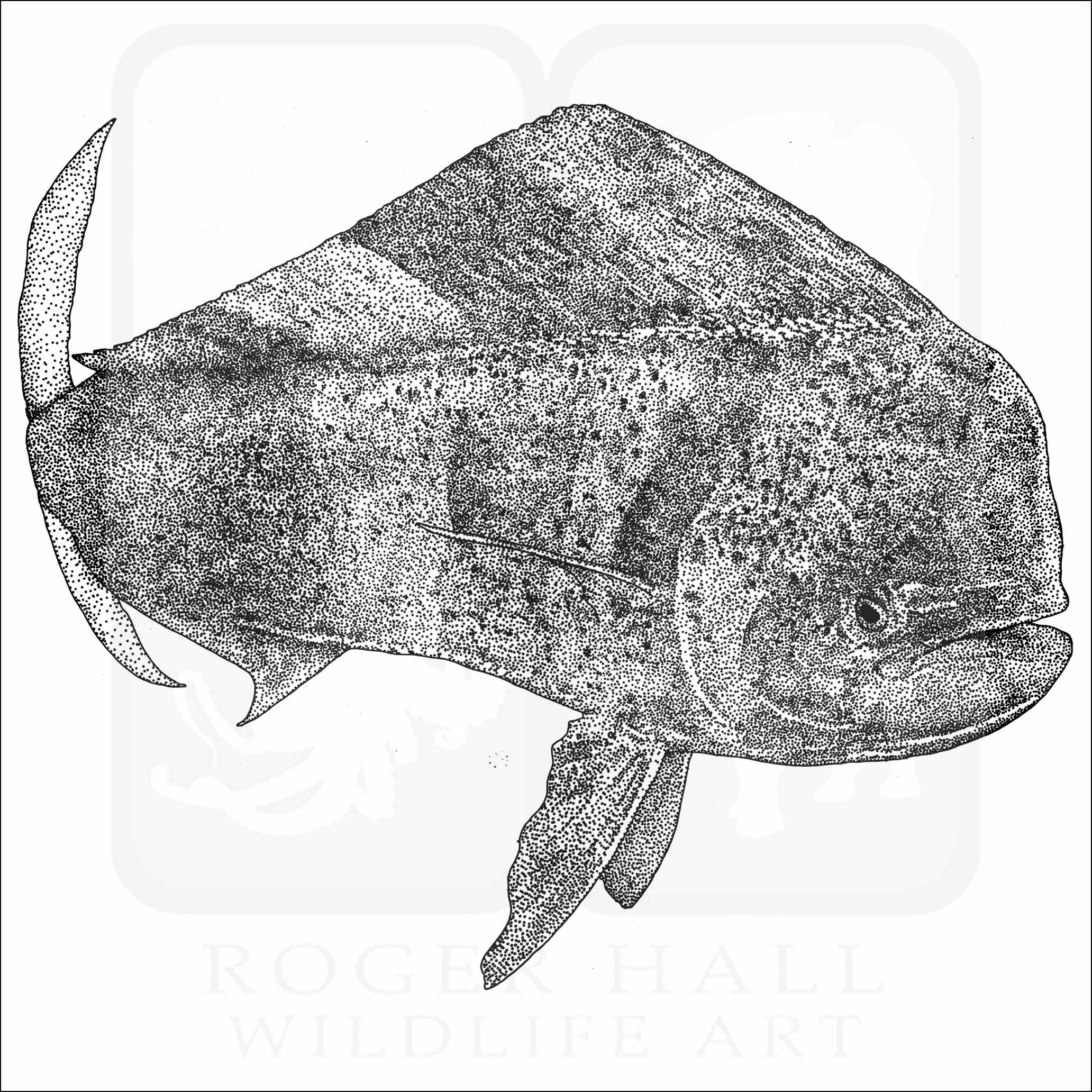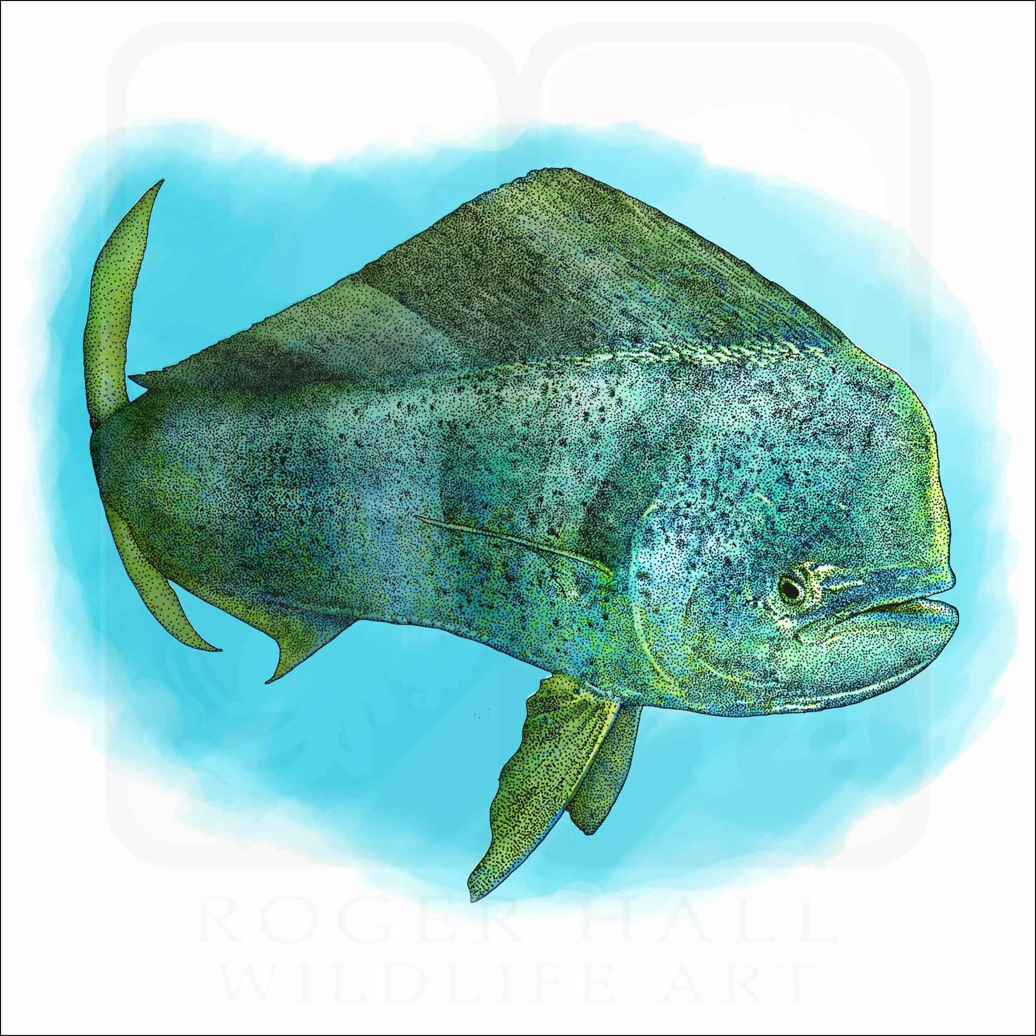 Fine art illustration of a Common Dolphinfish (Coryphaena hippurus.) The illustration is available in black and white or color.