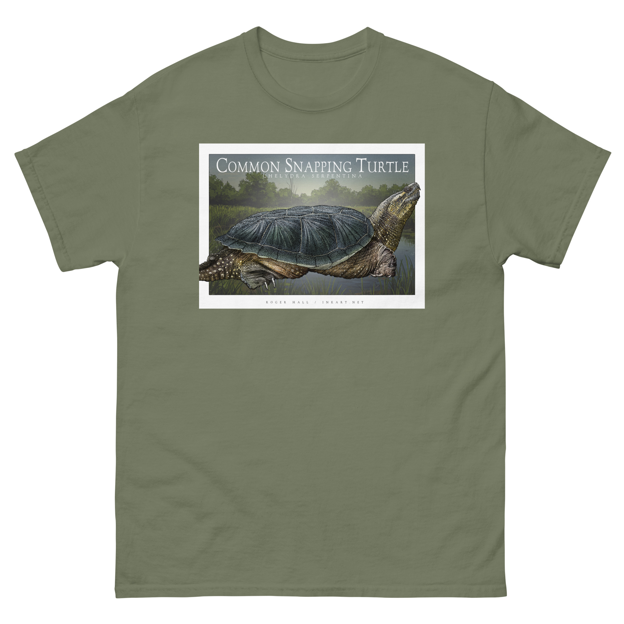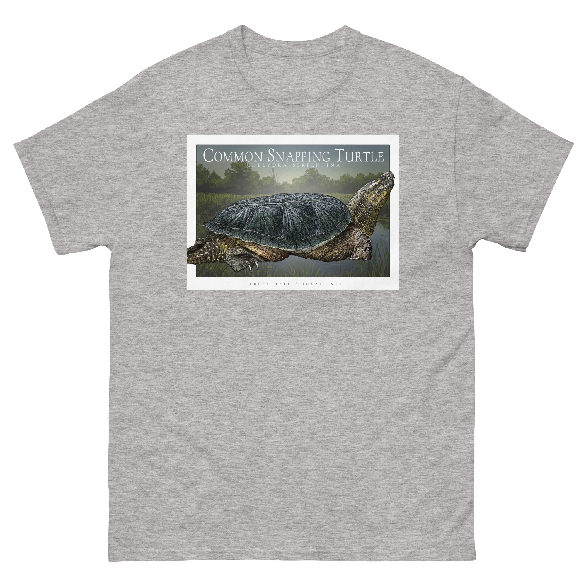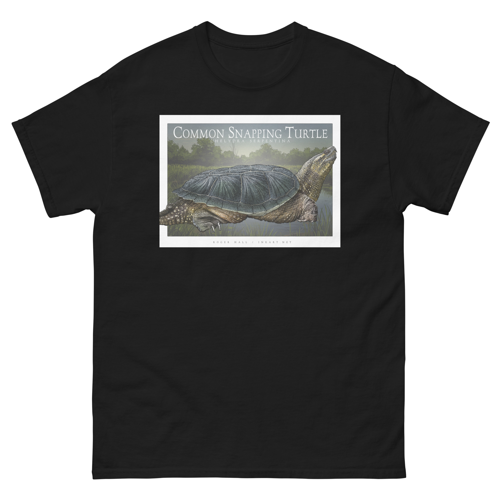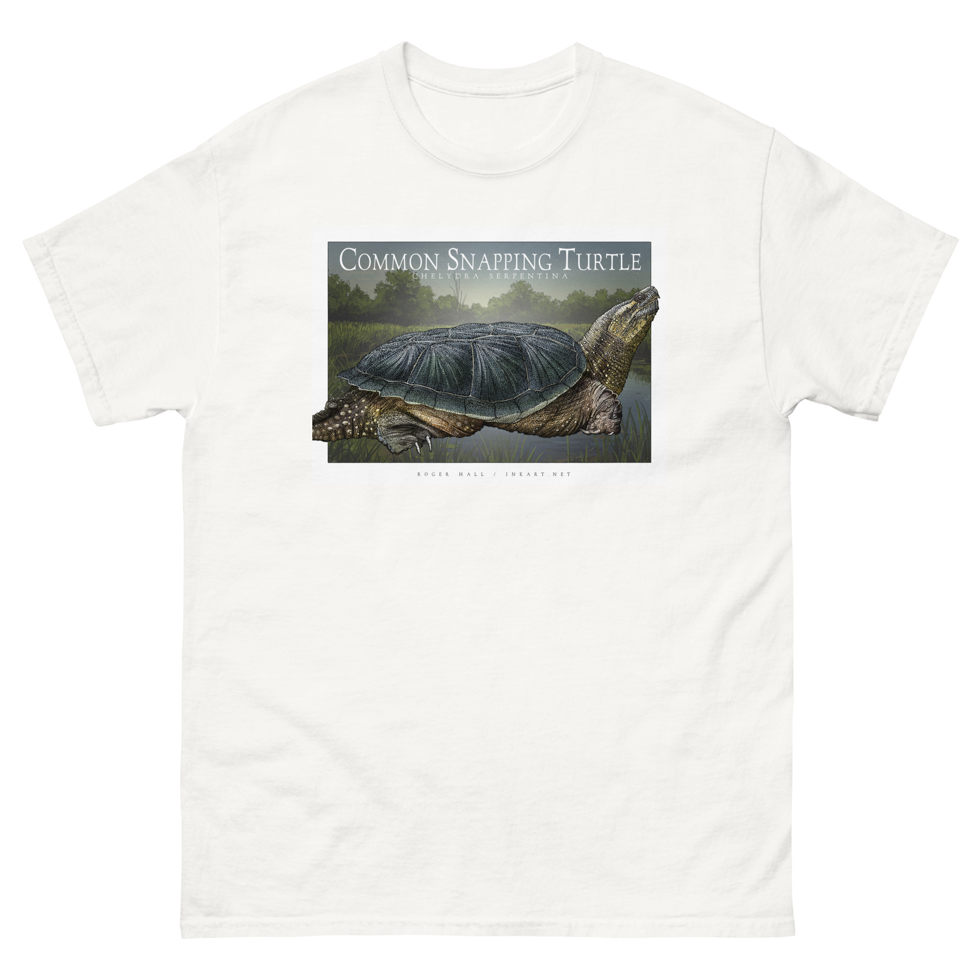 Scientifically accurate drawing of a Common Snapping Turtle (Chelydra serpentina.) The illustration of a printed on a high-quality 100% unisex cotton t-shirt.