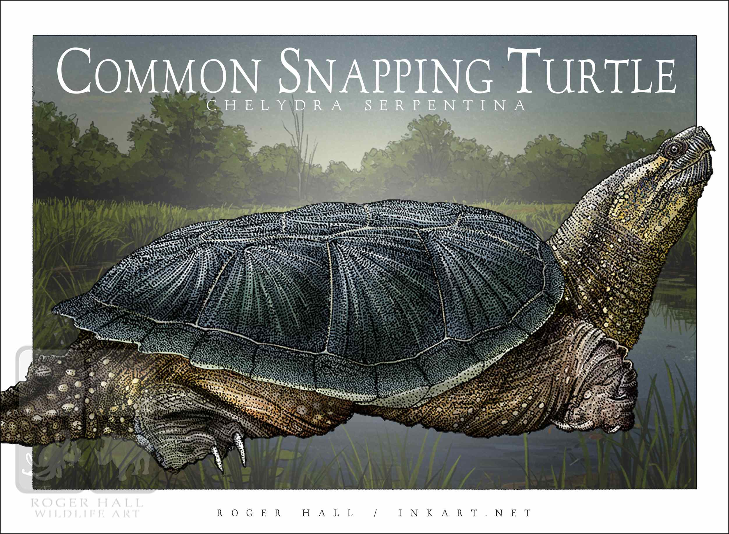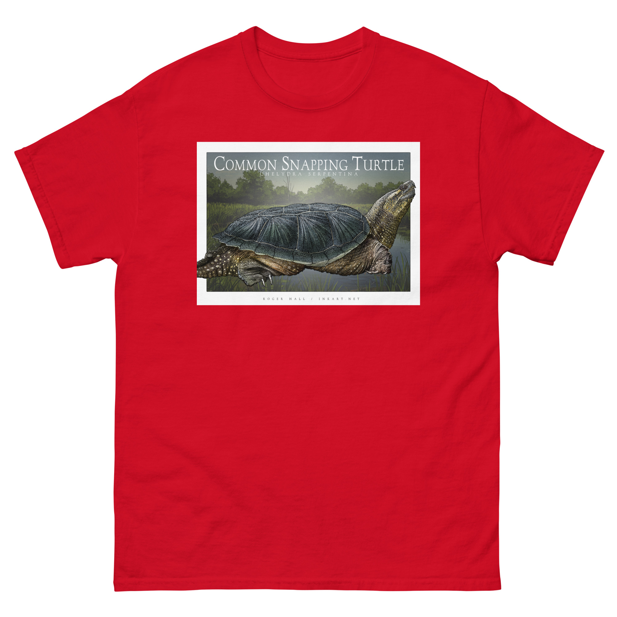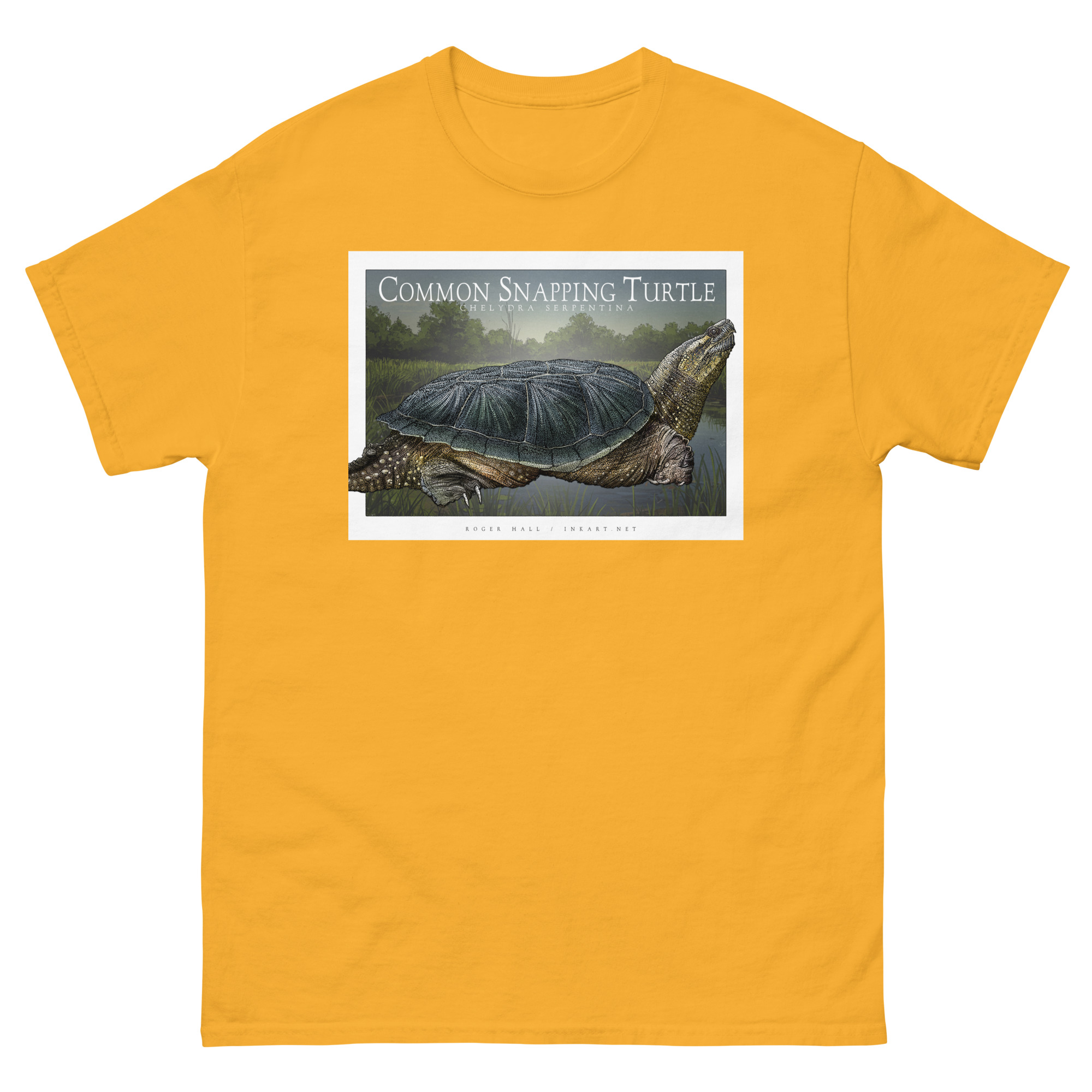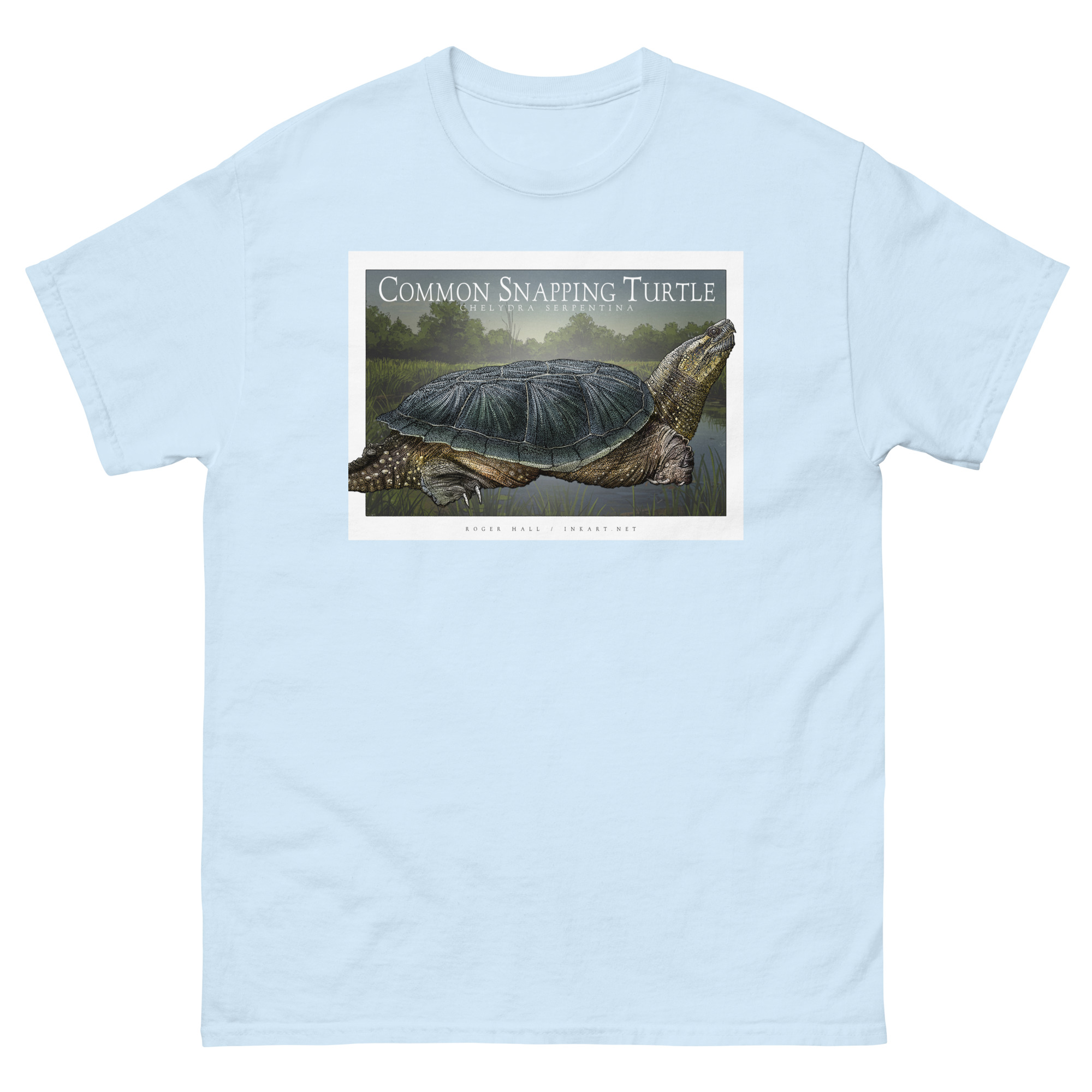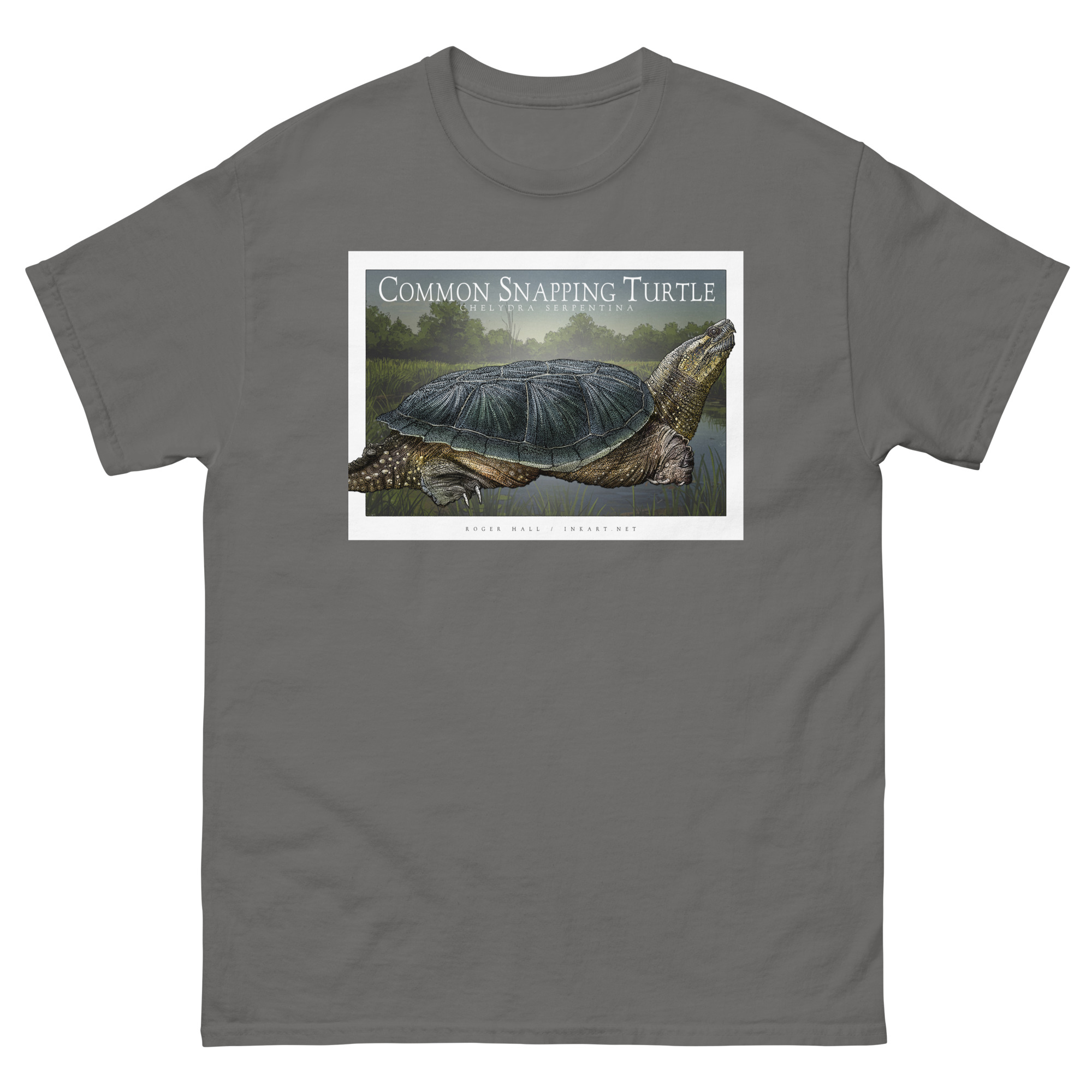 Scientifically accurate drawing of a Common Snapping Turtle (Chelydra serpentina.) The illustration of a printed on a high-quality 100% unisex cotton t-shirt.