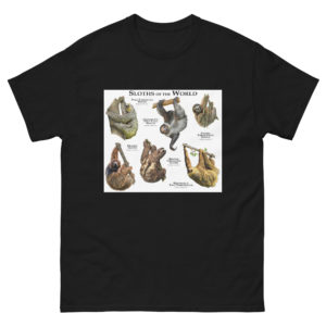 Sloths are a group of arboreal neotropical xenathran mammals, constituting the suborder Folivora. Noted for slowness of movement, they spend most of their lives hanging upside down in the trees of the tropical rain forests of South America and Central America. There are six recognized species of sloth. This image features fine art illustrations of all extant species of sloth (Folivora) printed on a high-quality men's cotton t-shirt.