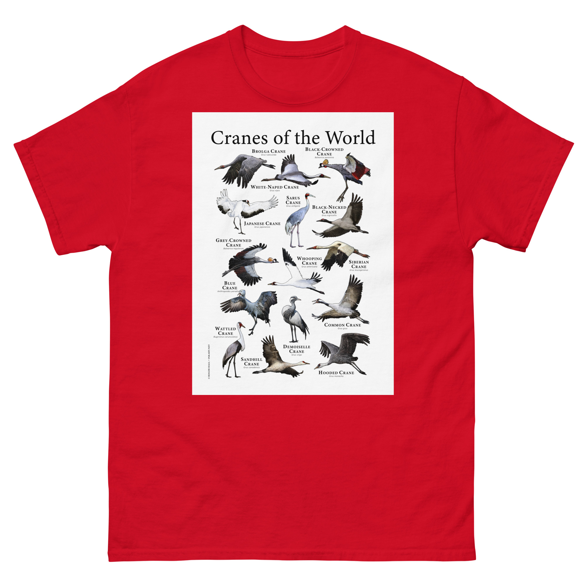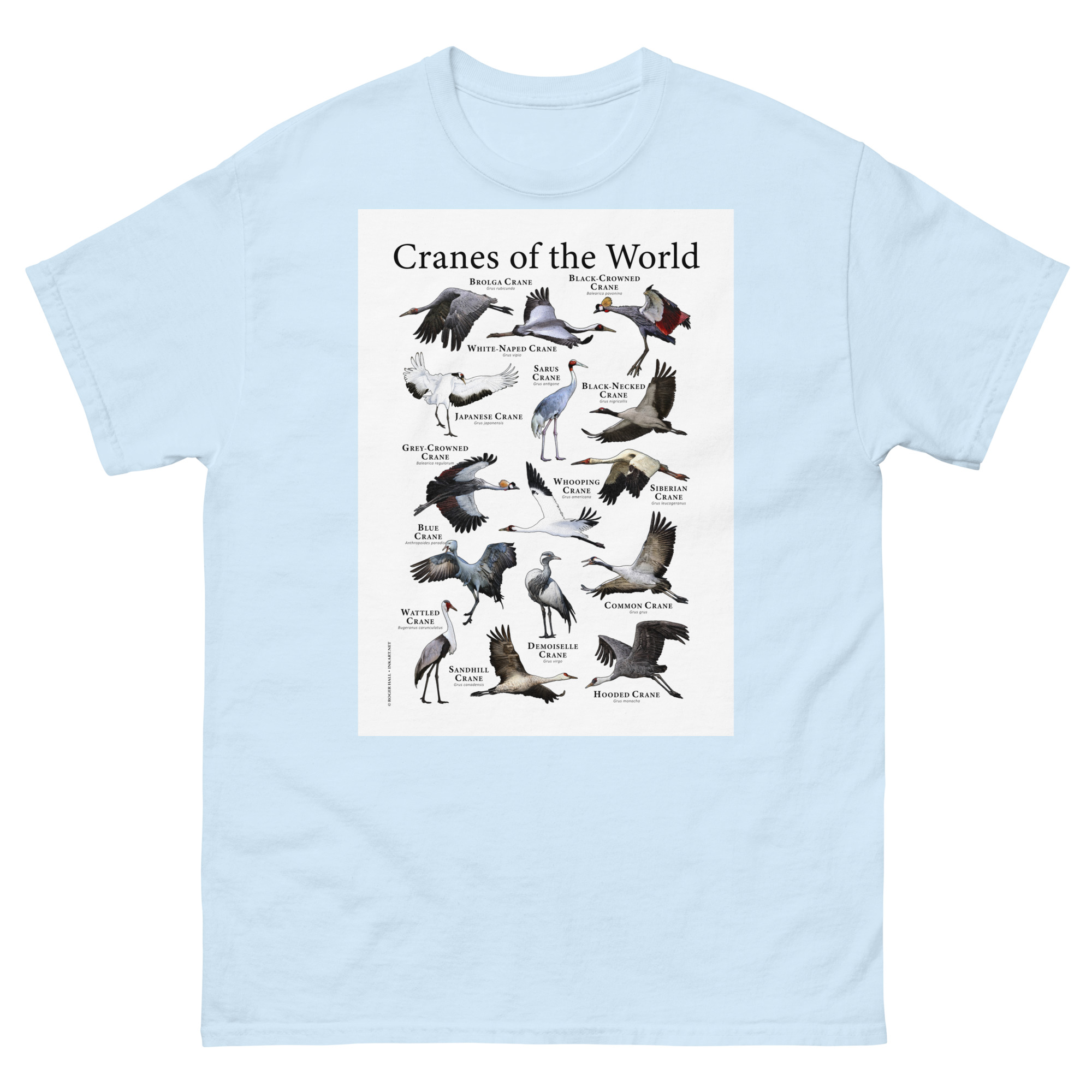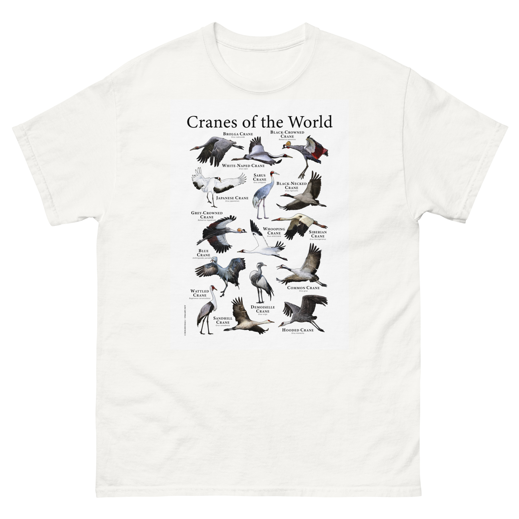 A colorful collage of scientifically accurate illustration of all extant species of crane. The layout features over a dozen different types of crane, including some of the world’s most endangered species printed on a high-quality 100% men’s cotton t-shirt..
