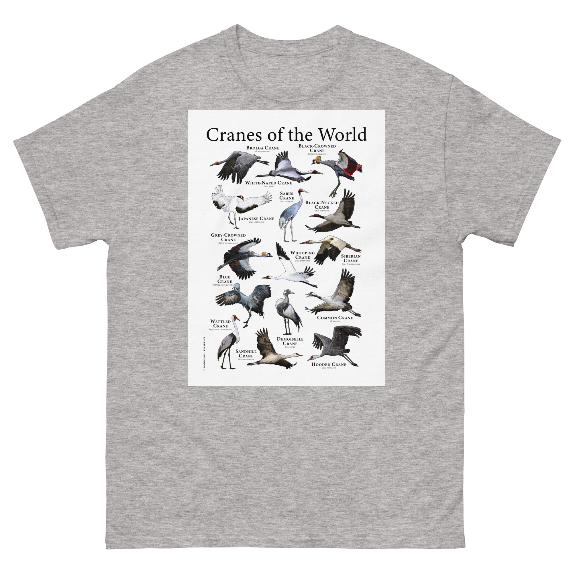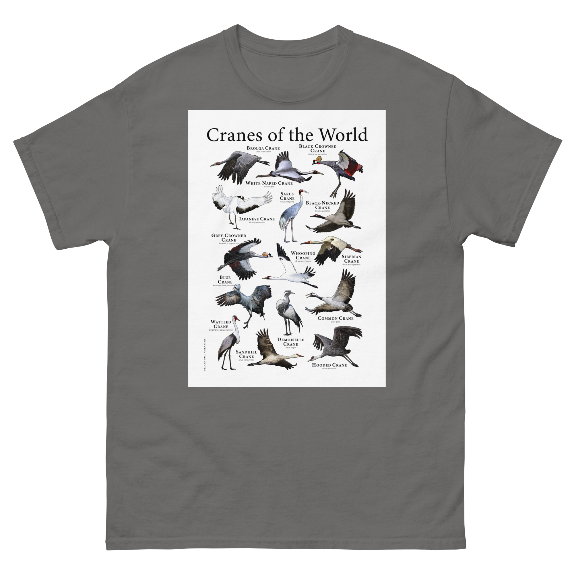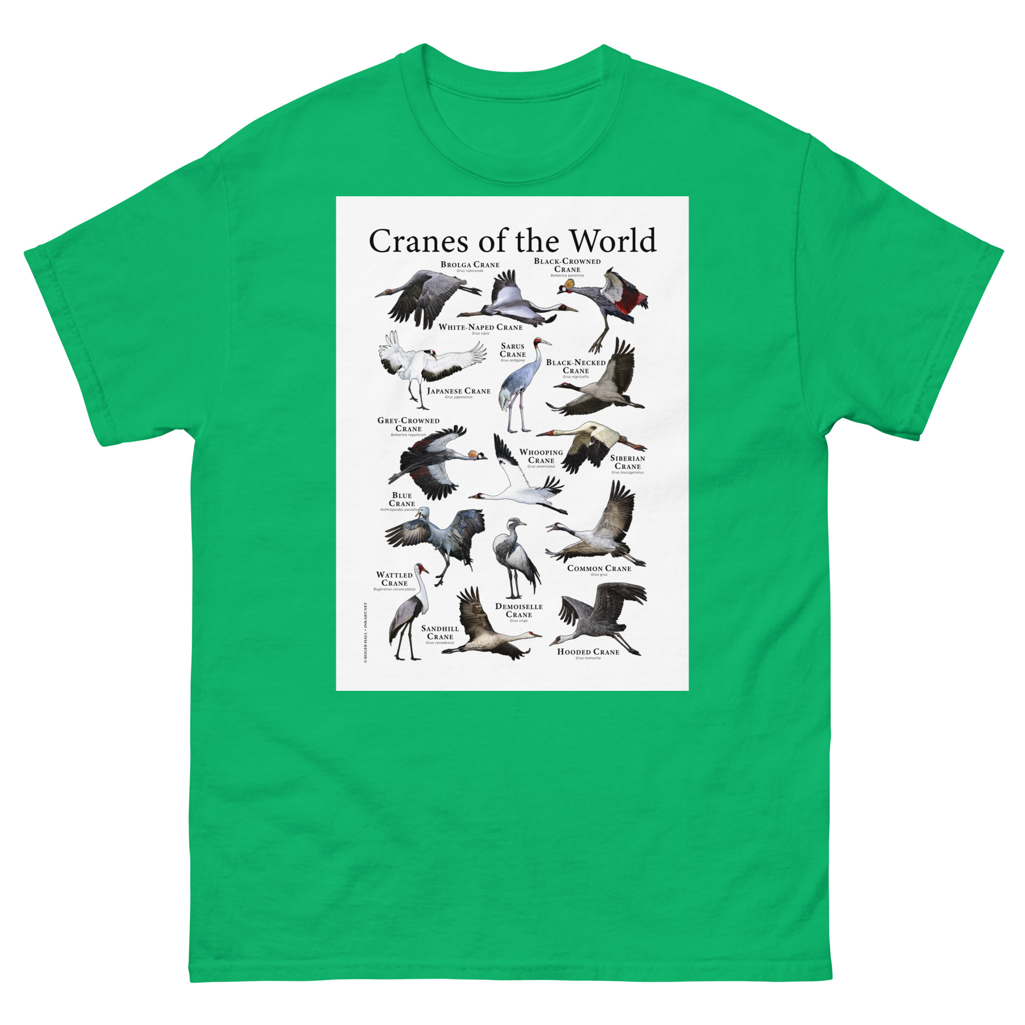 A colorful collage of scientifically accurate illustration of all extant species of crane. The layout features over a dozen different types of crane, including some of the world’s most endangered species printed on a high-quality 100% men’s cotton t-shirt..