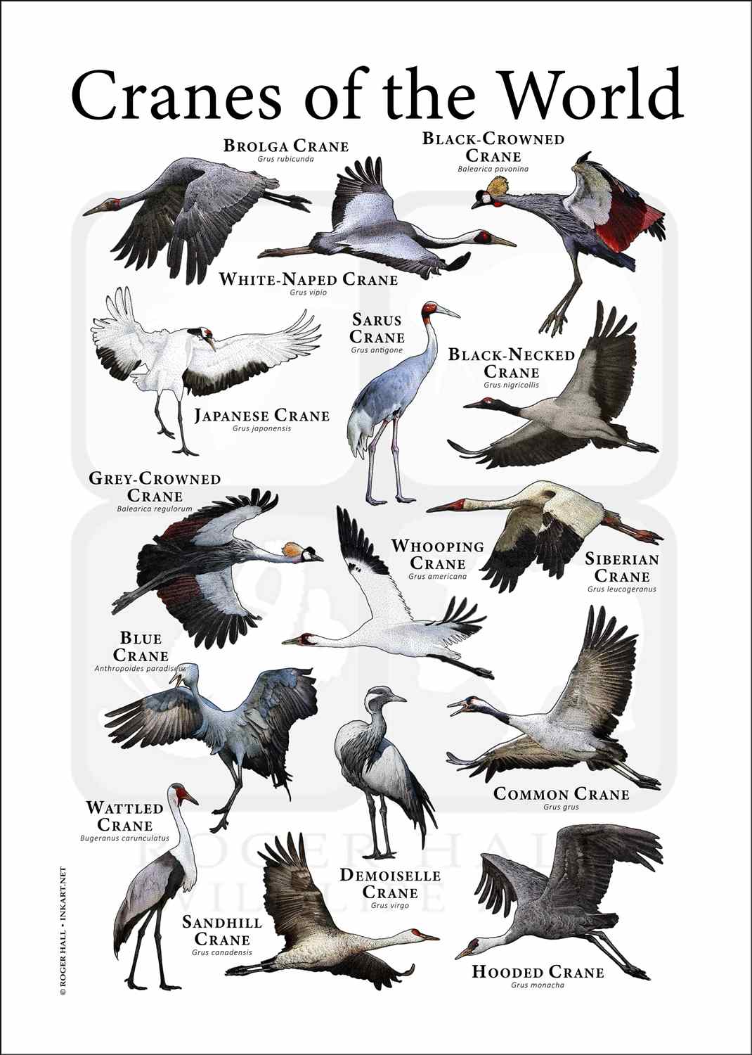 A colorful collage of scientifically accurate illustration of all extant species of crane. The layout features over a dozen different types of crane, including some of the world’s most endangered species.