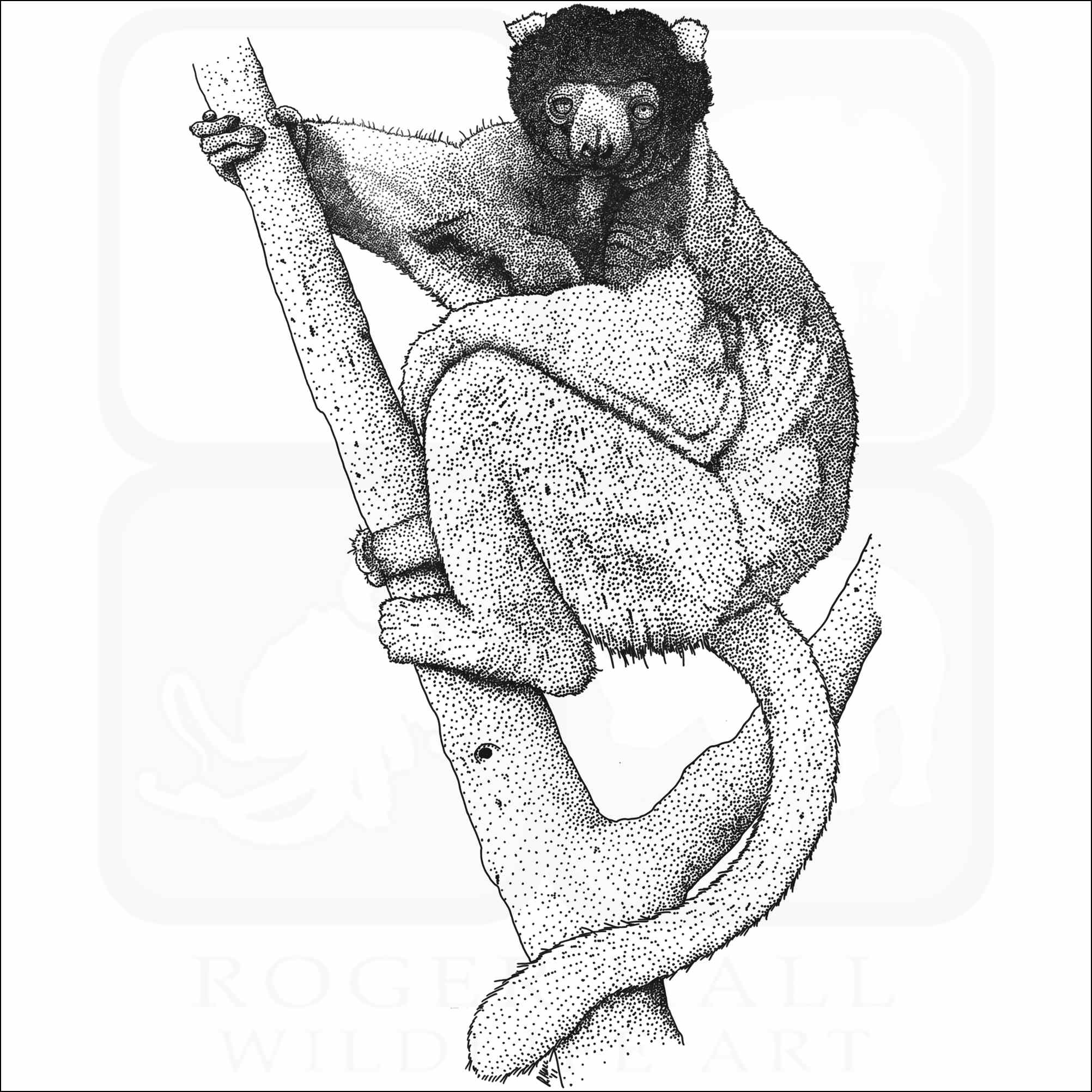 Fine art illustration of a Crowned Sifaka Lemur (Propithecus coronatus.) The illustration is available in black and white or color.