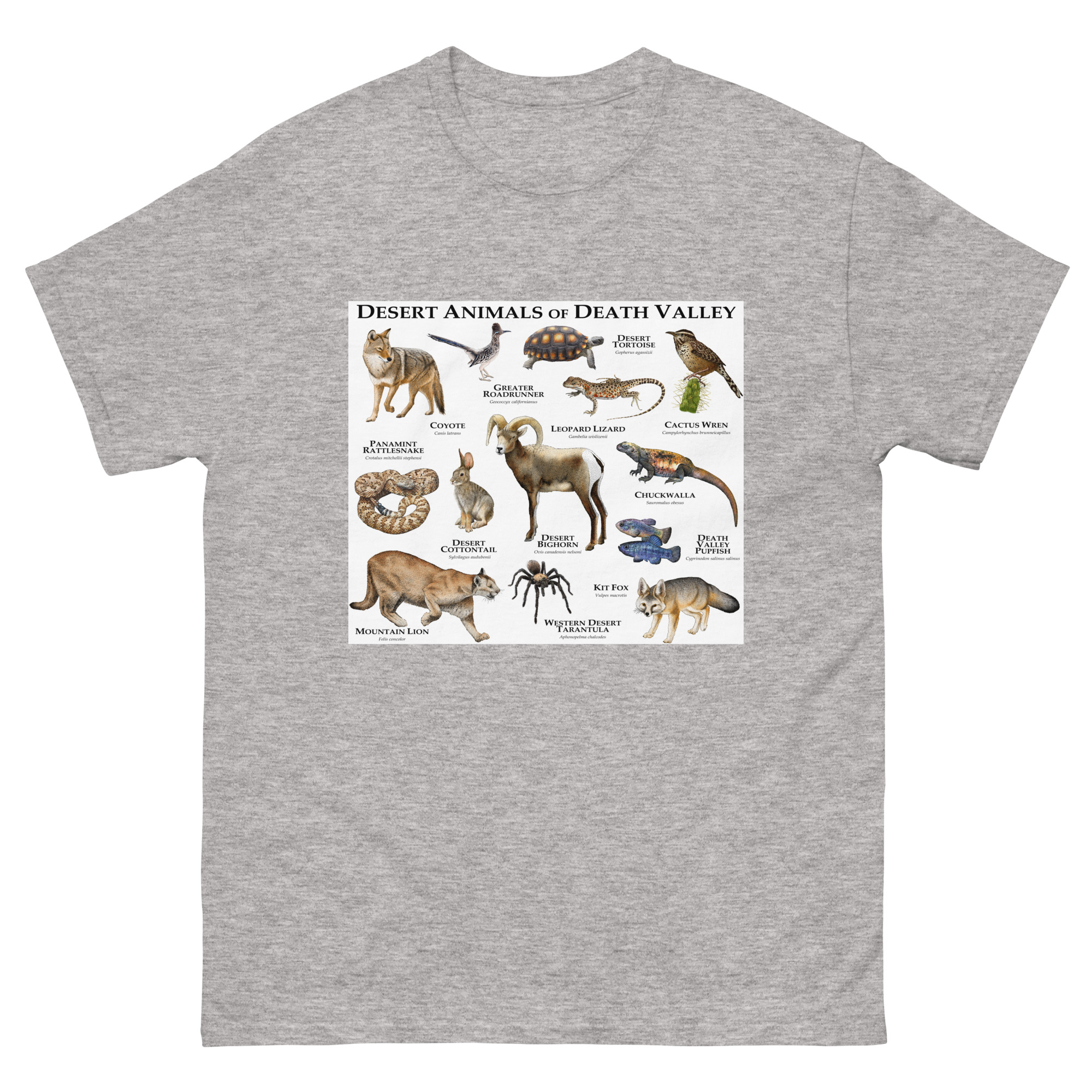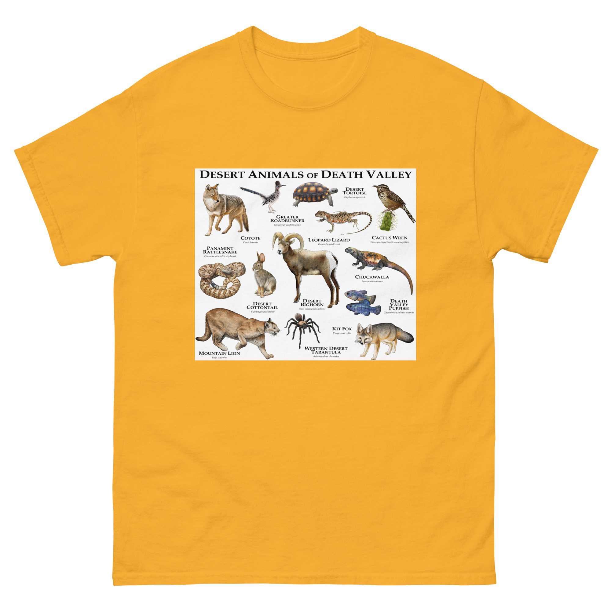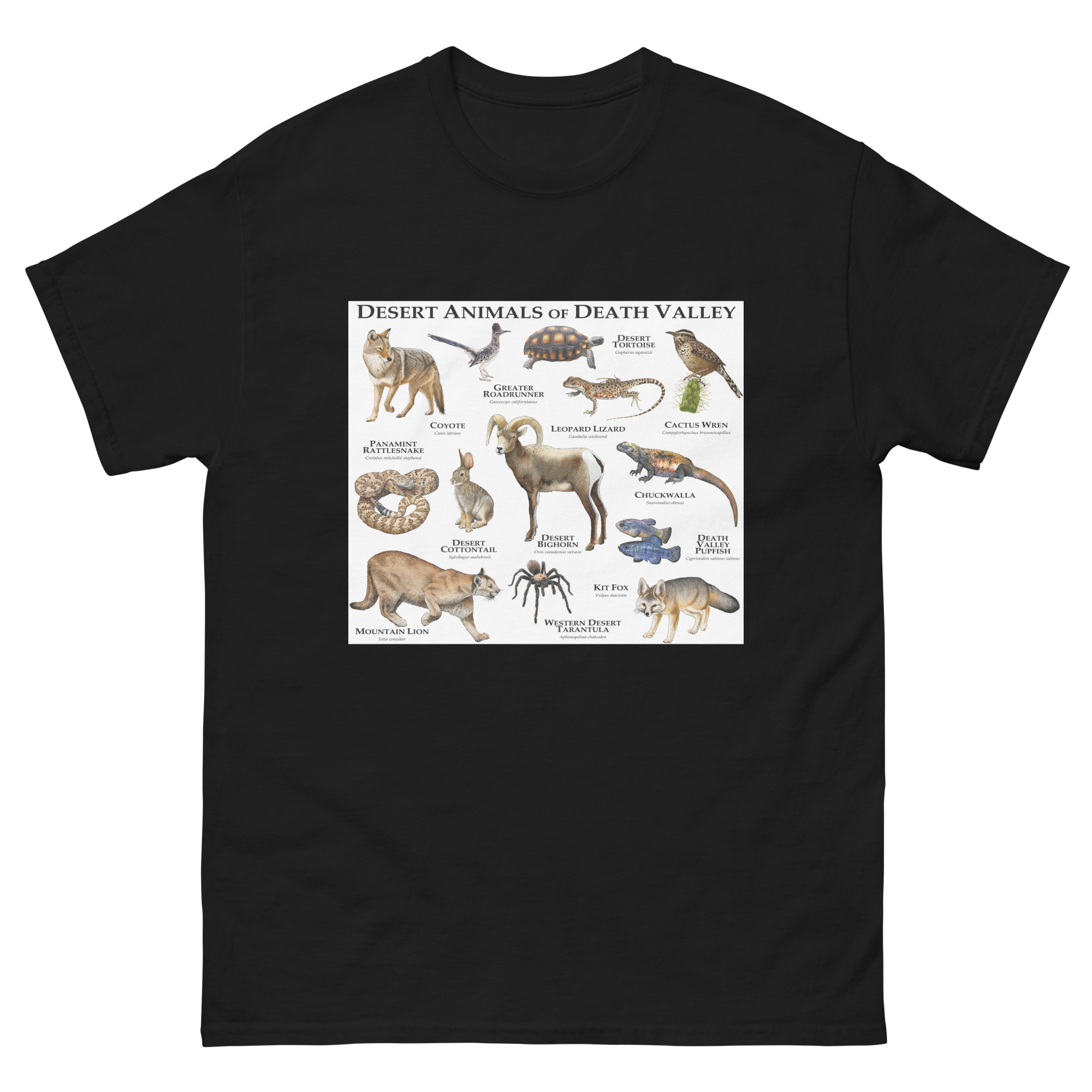 Fine art illustration of some of the species of animal native to Death Valley printed on a high-quality 100% cotton t-shirt