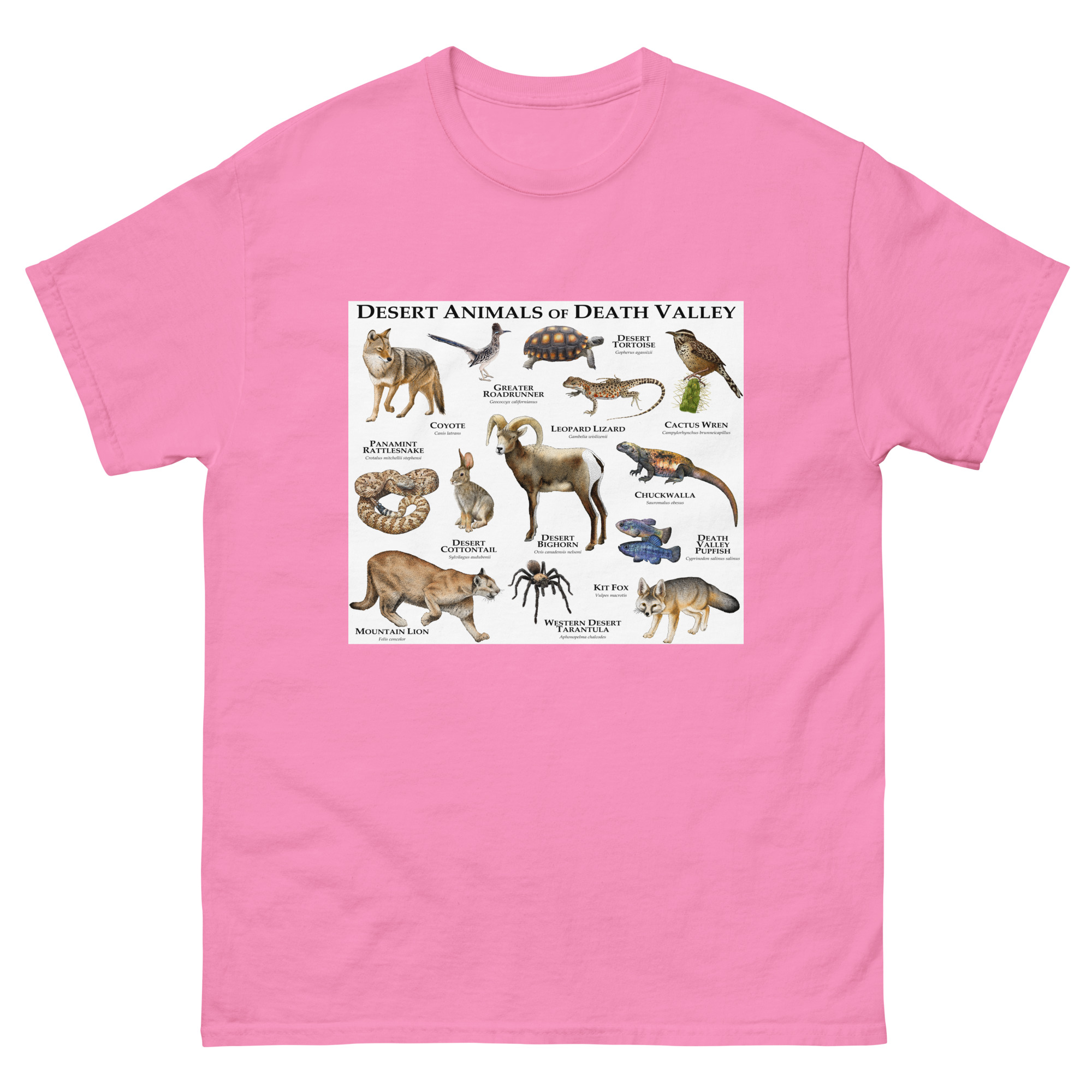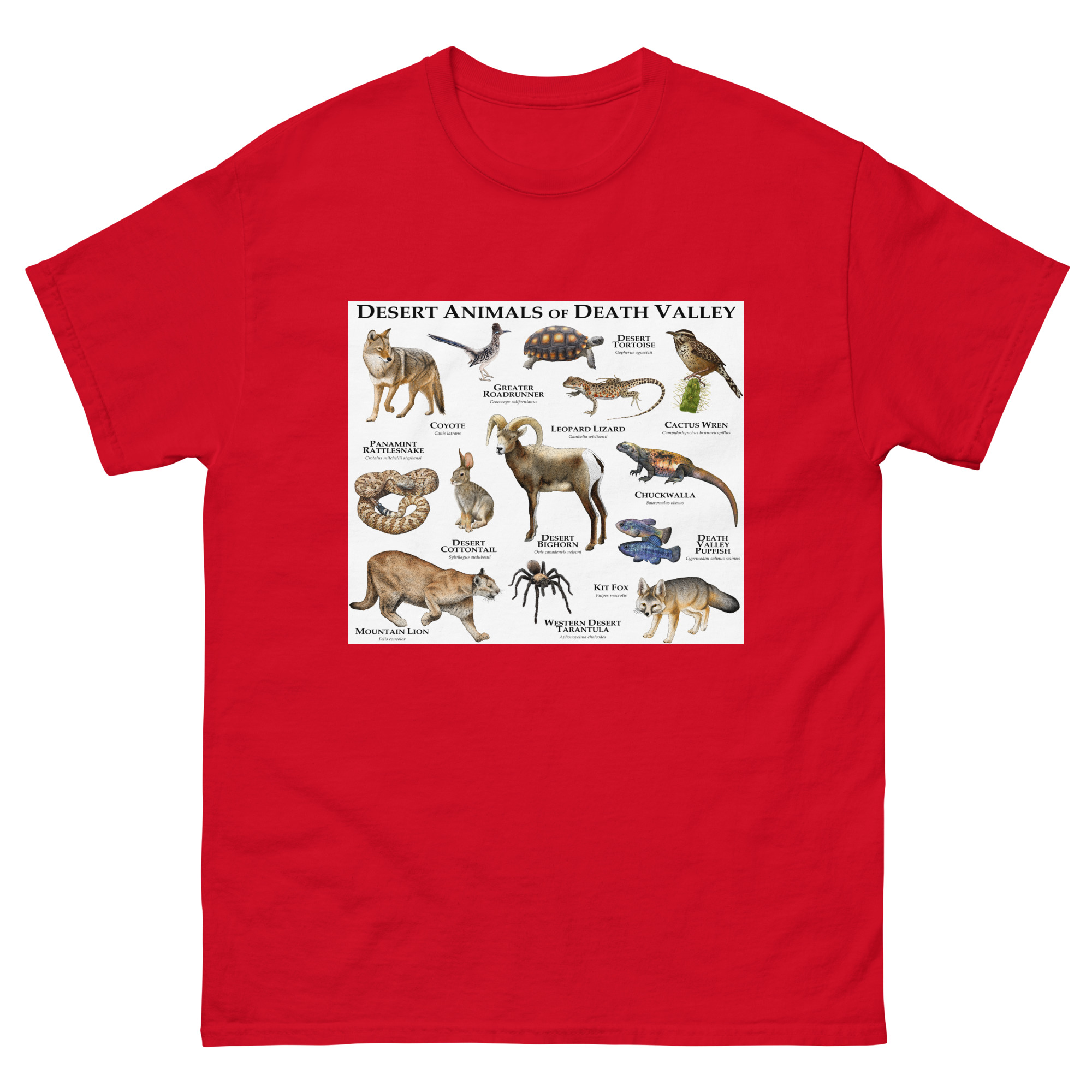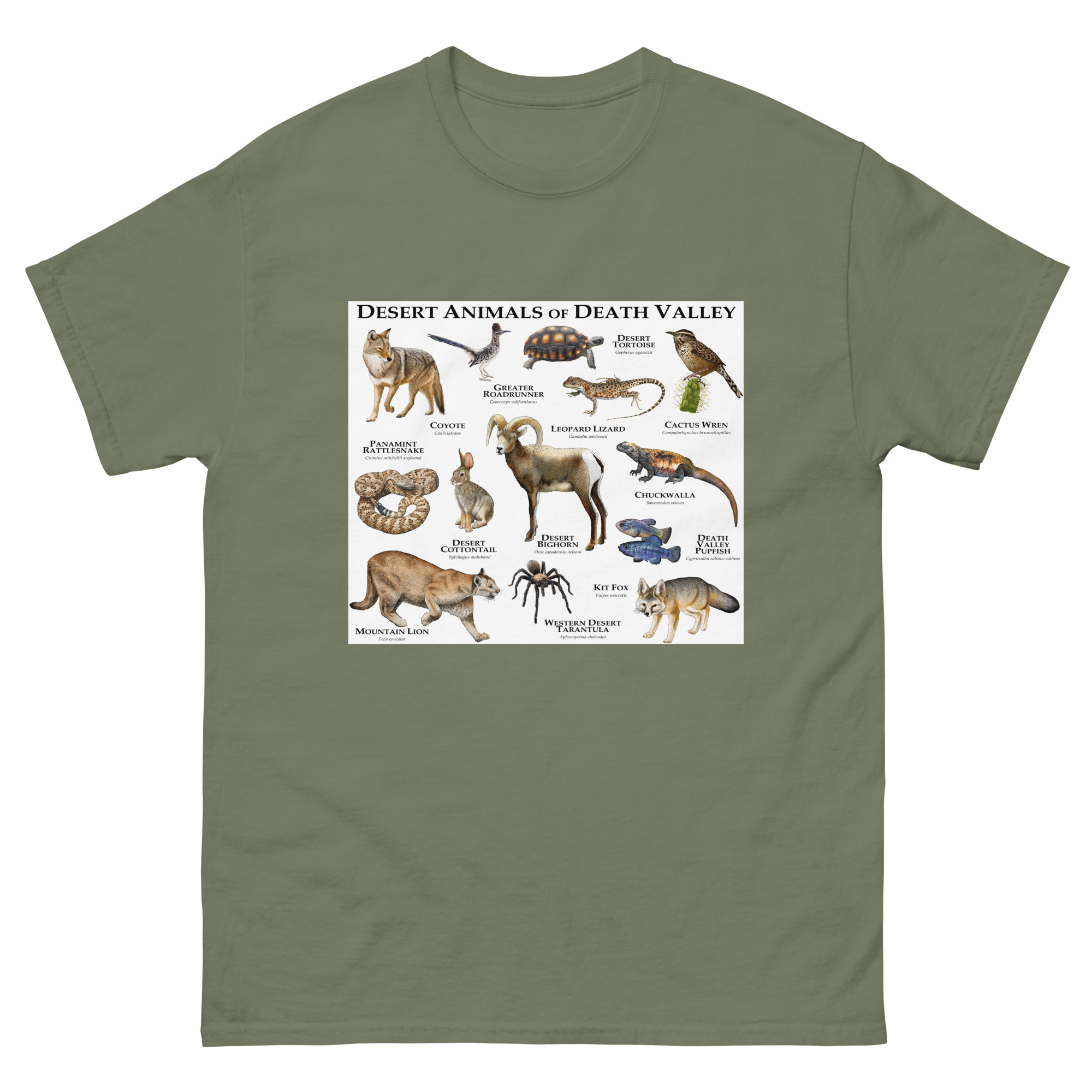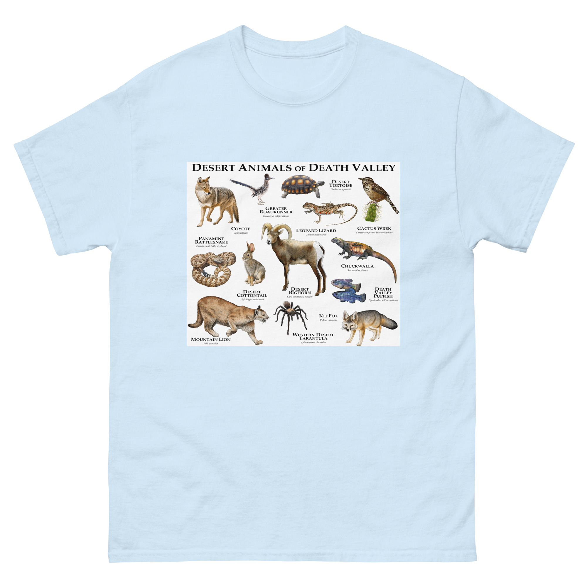 Fine art illustration of some of the species of animal native to Death Valley printed on a high-quality 100% cotton t-shirt