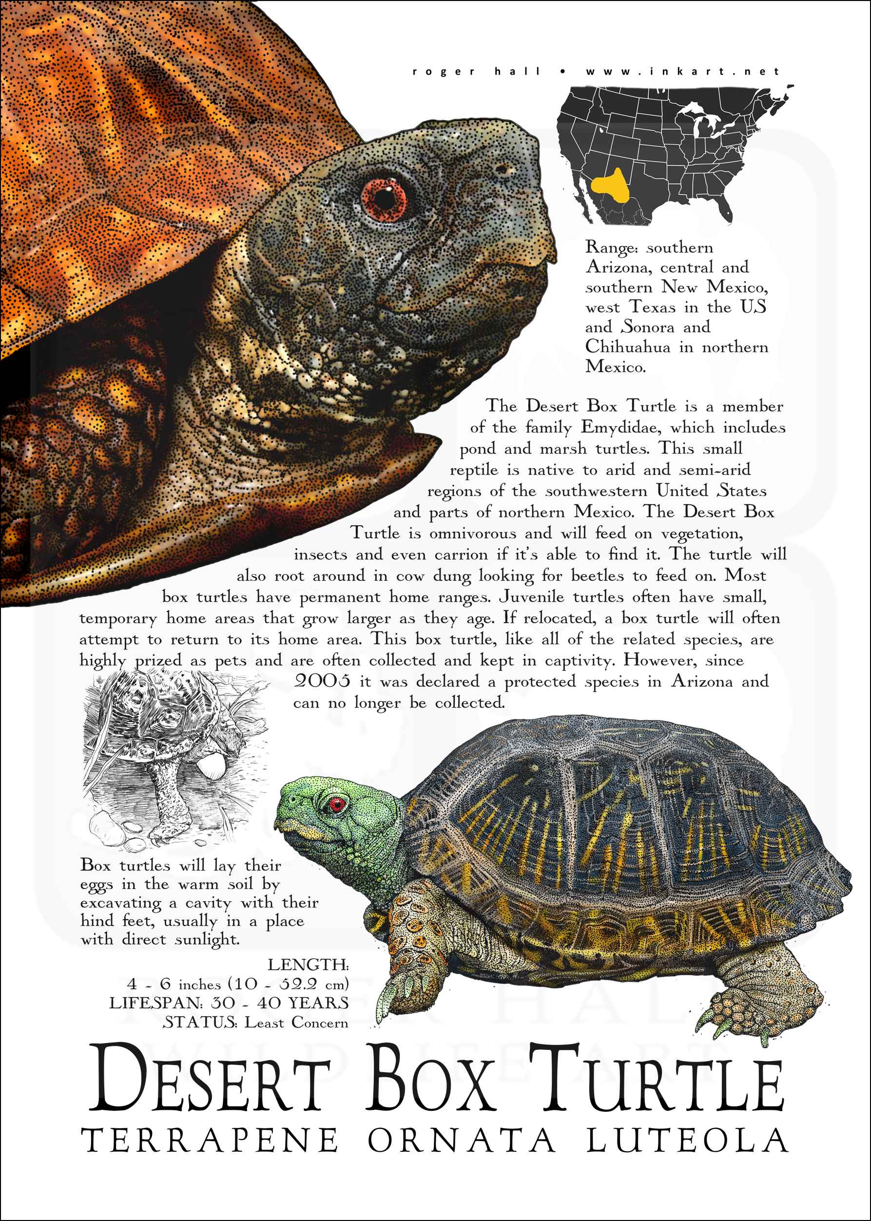 This poster features an informational graphic of the Desert Box Turtle (Terrapene ornata luteola). It includes a map of the turtle’s range, along with three illustrations and a small paragraph with information about reptile.